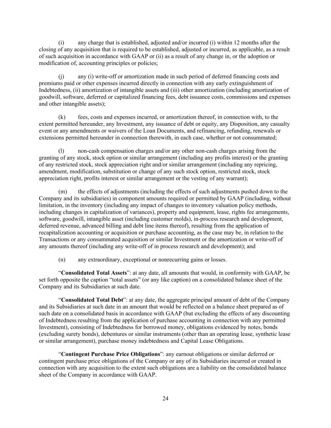 24 (i) any charge that is established, adjusted and/or incurred (i) within 12 months after the closing of any acquisition that is required to be established, adjusted or incurred, as applicable, as a result of such acquisition in accordance with GAAP or (ii) as a result of any change in, or the adoption or modification of, accounting principles or policies; (j) any (i) write-off or amortization made in such period of deferred financing costs and premiums paid or other expenses incurred directly in connection with any early extinguishment of Indebtedness, (ii) amortization of intangible assets and (iii) other amortization (including amortization of goodwill, software, deferred or capitalized financing fees, debt issuance costs, commissions and expenses and other intangible assets); (k) fees, costs and expenses incurred, or amortization thereof, in connection with, to the extent permitted hereunder, any Investment, any issuance of debt or equity, any Disposition, any casualty event or any amendments or waivers of the Loan Documents, and refinancing, refunding, renewals or extensions permitted hereunder in connection therewith, in each case, whether or not consummated; (l) non-cash compensation charges and/or any other non-cash charges arising from the granting of any stock, stock option or similar arrangement (including any profits interest) or the granting of any restricted stock, stock appreciation right and/or similar arrangement (including any repricing, amendment, modification, substitution or change of any such stock option, restricted stock, stock appreciation right, profits interest or similar arrangement or the vesting of any warrant); (m) the effects of adjustments (including the effects of such adjustments pushed down to the Company and its subsidiaries) in component amounts required or permitted by GAAP (including, without limitation, in the inventory (including any impact of changes to inventory valuation policy methods, including changes in capitalization of variances), property and equipment, lease, rights fee arrangements, software, goodwill, intangible asset (including customer molds), in-process research and development, deferred revenue, advanced billing and debt line items thereof), resulting from the application of recapitalization accounting or acquisition or purchase accounting, as the case may be, in relation to the Transactions or any consummated acquisition or similar Investment or the amortization or write-off of any amounts thereof (including any write-off of in process research and development); and (n) any extraordinary, exceptional or nonrecurring gains or losses. “Consolidated Total Assets”: at any date, all amounts that would, in conformity with GAAP, be set forth opposite the caption “total assets” (or any like caption) on a consolidated balance sheet of the Company and its Subsidiaries at such date. “Consolidated Total Debt”: at any date, the aggregate principal amount of debt of the Company and its Subsidiaries at such date in an amount that would be reflected on a balance sheet prepared as of such date on a consolidated basis in accordance with GAAP (but excluding the effects of any discounting of Indebtedness resulting from the application of purchase accounting in connection with any permitted Investment), consisting of Indebtedness for borrowed money, obligations evidenced by notes, bonds (excluding surety bonds), debentures or similar instruments (other than an operating lease, synthetic lease or similar arrangement), purchase money indebtedness and Capital Lease Obligations. “Contingent Purchase Price Obligations”: any earnout obligations or similar deferred or contingent purchase price obligations of the Company or any of its Subsidiaries incurred or created in connection with any acquisition to the extent such obligations are a liability on the consolidated balance sheet of the Company in accordance with GAAP.