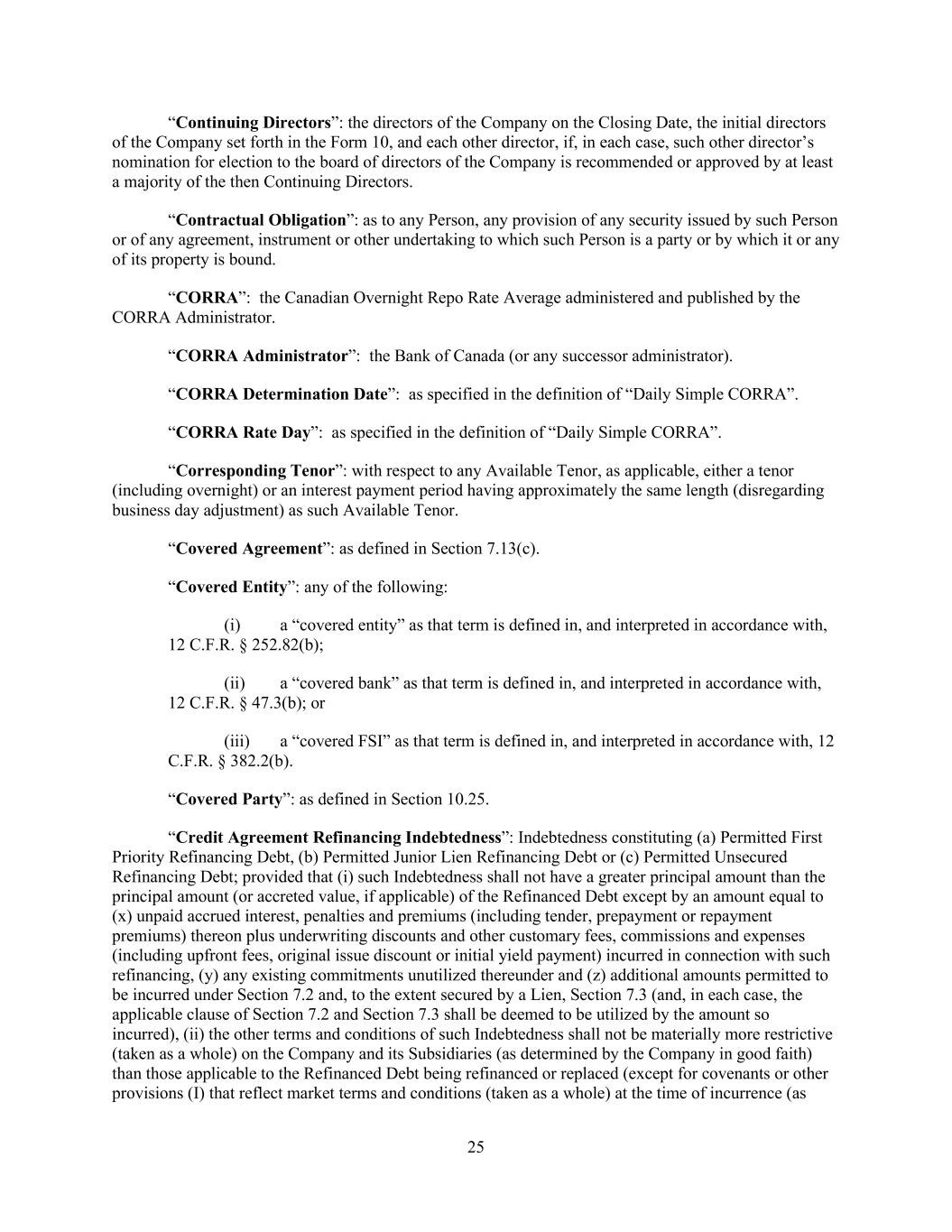 25 “Continuing Directors”: the directors of the Company on the Closing Date, the initial directors of the Company set forth in the Form 10, and each other director, if, in each case, such other director’s nomination for election to the board of directors of the Company is recommended or approved by at least a majority of the then Continuing Directors. “Contractual Obligation”: as to any Person, any provision of any security issued by such Person or of any agreement, instrument or other undertaking to which such Person is a party or by which it or any of its property is bound. “CORRA”: the Canadian Overnight Repo Rate Average administered and published by the CORRA Administrator. “CORRA Administrator”: the Bank of Canada (or any successor administrator). “CORRA Determination Date”: as specified in the definition of “Daily Simple CORRA”. “CORRA Rate Day”: as specified in the definition of “Daily Simple CORRA”. “Corresponding Tenor”: with respect to any Available Tenor, as applicable, either a tenor (including overnight) or an interest payment period having approximately the same length (disregarding business day adjustment) as such Available Tenor. “Covered Agreement”: as defined in Section 7.13(c). “Covered Entity”: any of the following: (i) a “covered entity” as that term is defined in, and interpreted in accordance with, 12 C.F.R. § 252.82(b); (ii) a “covered bank” as that term is defined in, and interpreted in accordance with, 12 C.F.R. § 47.3(b); or (iii) a “covered FSI” as that term is defined in, and interpreted in accordance with, 12 C.F.R. § 382.2(b). “Covered Party”: as defined in Section 10.25. “Credit Agreement Refinancing Indebtedness”: Indebtedness constituting (a) Permitted First Priority Refinancing Debt, (b) Permitted Junior Lien Refinancing Debt or (c) Permitted Unsecured Refinancing Debt; provided that (i) such Indebtedness shall not have a greater principal amount than the principal amount (or accreted value, if applicable) of the Refinanced Debt except by an amount equal to (x) unpaid accrued interest, penalties and premiums (including tender, prepayment or repayment premiums) thereon plus underwriting discounts and other customary fees, commissions and expenses (including upfront fees, original issue discount or initial yield payment) incurred in connection with such refinancing, (y) any existing commitments unutilized thereunder and (z) additional amounts permitted to be incurred under Section 7.2 and, to the extent secured by a Lien, Section 7.3 (and, in each case, the applicable clause of Section 7.2 and Section 7.3 shall be deemed to be utilized by the amount so incurred), (ii) the other terms and conditions of such Indebtedness shall not be materially more restrictive (taken as a whole) on the Company and its Subsidiaries (as determined by the Company in good faith) than those applicable to the Refinanced Debt being refinanced or replaced (except for covenants or other provisions (I) that reflect market terms and conditions (taken as a whole) at the time of incurrence (as