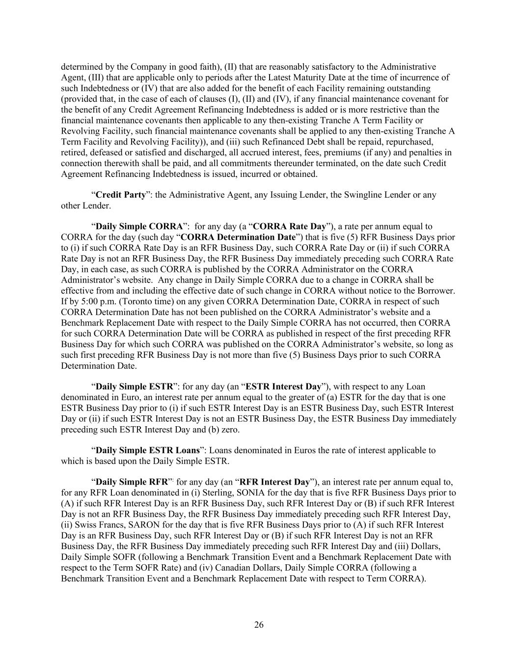 26 determined by the Company in good faith), (II) that are reasonably satisfactory to the Administrative Agent, (III) that are applicable only to periods after the Latest Maturity Date at the time of incurrence of such Indebtedness or (IV) that are also added for the benefit of each Facility remaining outstanding (provided that, in the case of each of clauses (I), (II) and (IV), if any financial maintenance covenant for the benefit of any Credit Agreement Refinancing Indebtedness is added or is more restrictive than the financial maintenance covenants then applicable to any then-existing Tranche A Term Facility or Revolving Facility, such financial maintenance covenants shall be applied to any then-existing Tranche A Term Facility and Revolving Facility)), and (iii) such Refinanced Debt shall be repaid, repurchased, retired, defeased or satisfied and discharged, all accrued interest, fees, premiums (if any) and penalties in connection therewith shall be paid, and all commitments thereunder terminated, on the date such Credit Agreement Refinancing Indebtedness is issued, incurred or obtained. “Credit Party”: the Administrative Agent, any Issuing Lender, the Swingline Lender or any other Lender. “Daily Simple CORRA”: for any day (a “CORRA Rate Day”), a rate per annum equal to CORRA for the day (such day “CORRA Determination Date”) that is five (5) RFR Business Days prior to (i) if such CORRA Rate Day is an RFR Business Day, such CORRA Rate Day or (ii) if such CORRA Rate Day is not an RFR Business Day, the RFR Business Day immediately preceding such CORRA Rate Day, in each case, as such CORRA is published by the CORRA Administrator on the CORRA Administrator’s website. Any change in Daily Simple CORRA due to a change in CORRA shall be effective from and including the effective date of such change in CORRA without notice to the Borrower. If by 5:00 p.m. (Toronto time) on any given CORRA Determination Date, CORRA in respect of such CORRA Determination Date has not been published on the CORRA Administrator’s website and a Benchmark Replacement Date with respect to the Daily Simple CORRA has not occurred, then CORRA for such CORRA Determination Date will be CORRA as published in respect of the first preceding RFR Business Day for which such CORRA was published on the CORRA Administrator’s website, so long as such first preceding RFR Business Day is not more than five (5) Business Days prior to such CORRA Determination Date. “Daily Simple ESTR”: for any day (an “ESTR Interest Day”), with respect to any Loan denominated in Euro, an interest rate per annum equal to the greater of (a) ESTR for the day that is one ESTR Business Day prior to (i) if such ESTR Interest Day is an ESTR Business Day, such ESTR Interest Day or (ii) if such ESTR Interest Day is not an ESTR Business Day, the ESTR Business Day immediately preceding such ESTR Interest Day and (b) zero. “Daily Simple ESTR Loans”: Loans denominated in Euros the rate of interest applicable to which is based upon the Daily Simple ESTR. “Daily Simple RFR”: for any day (an “RFR Interest Day”), an interest rate per annum equal to, for any RFR Loan denominated in (i) Sterling, SONIA for the day that is five RFR Business Days prior to (A) if such RFR Interest Day is an RFR Business Day, such RFR Interest Day or (B) if such RFR Interest Day is not an RFR Business Day, the RFR Business Day immediately preceding such RFR Interest Day, (ii) Swiss Francs, SARON for the day that is five RFR Business Days prior to (A) if such RFR Interest Day is an RFR Business Day, such RFR Interest Day or (B) if such RFR Interest Day is not an RFR Business Day, the RFR Business Day immediately preceding such RFR Interest Day and (iii) Dollars, Daily Simple SOFR (following a Benchmark Transition Event and a Benchmark Replacement Date with respect to the Term SOFR Rate) and (iv) Canadian Dollars, Daily Simple CORRA (following a Benchmark Transition Event and a Benchmark Replacement Date with respect to Term CORRA).