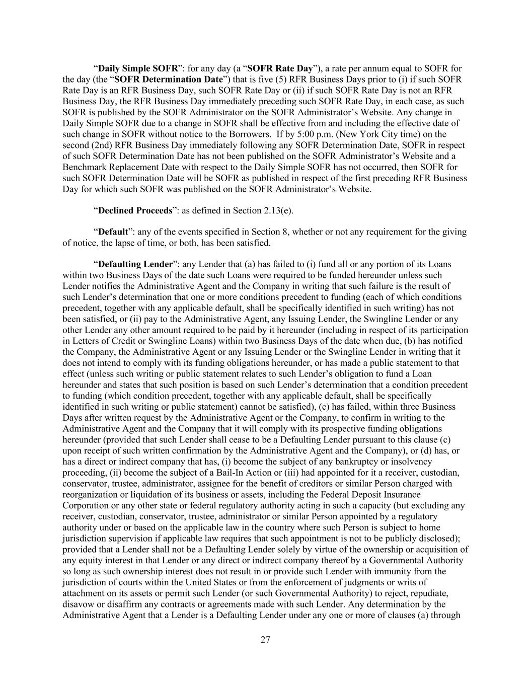 27 “Daily Simple SOFR”: for any day (a “SOFR Rate Day”), a rate per annum equal to SOFR for the day (the “SOFR Determination Date”) that is five (5) RFR Business Days prior to (i) if such SOFR Rate Day is an RFR Business Day, such SOFR Rate Day or (ii) if such SOFR Rate Day is not an RFR Business Day, the RFR Business Day immediately preceding such SOFR Rate Day, in each case, as such SOFR is published by the SOFR Administrator on the SOFR Administrator’s Website. Any change in Daily Simple SOFR due to a change in SOFR shall be effective from and including the effective date of such change in SOFR without notice to the Borrowers. If by 5:00 p.m. (New York City time) on the second (2nd) RFR Business Day immediately following any SOFR Determination Date, SOFR in respect of such SOFR Determination Date has not been published on the SOFR Administrator’s Website and a Benchmark Replacement Date with respect to the Daily Simple SOFR has not occurred, then SOFR for such SOFR Determination Date will be SOFR as published in respect of the first preceding RFR Business Day for which such SOFR was published on the SOFR Administrator’s Website. “Declined Proceeds”: as defined in Section 2.13(e). “Default”: any of the events specified in Section 8, whether or not any requirement for the giving of notice, the lapse of time, or both, has been satisfied. “Defaulting Lender”: any Lender that (a) has failed to (i) fund all or any portion of its Loans within two Business Days of the date such Loans were required to be funded hereunder unless such Lender notifies the Administrative Agent and the Company in writing that such failure is the result of such Lender’s determination that one or more conditions precedent to funding (each of which conditions precedent, together with any applicable default, shall be specifically identified in such writing) has not been satisfied, or (ii) pay to the Administrative Agent, any Issuing Lender, the Swingline Lender or any other Lender any other amount required to be paid by it hereunder (including in respect of its participation in Letters of Credit or Swingline Loans) within two Business Days of the date when due, (b) has notified the Company, the Administrative Agent or any Issuing Lender or the Swingline Lender in writing that it does not intend to comply with its funding obligations hereunder, or has made a public statement to that effect (unless such writing or public statement relates to such Lender’s obligation to fund a Loan hereunder and states that such position is based on such Lender’s determination that a condition precedent to funding (which condition precedent, together with any applicable default, shall be specifically identified in such writing or public statement) cannot be satisfied), (c) has failed, within three Business Days after written request by the Administrative Agent or the Company, to confirm in writing to the Administrative Agent and the Company that it will comply with its prospective funding obligations hereunder (provided that such Lender shall cease to be a Defaulting Lender pursuant to this clause (c) upon receipt of such written confirmation by the Administrative Agent and the Company), or (d) has, or has a direct or indirect company that has, (i) become the subject of any bankruptcy or insolvency proceeding, (ii) become the subject of a Bail-In Action or (iii) had appointed for it a receiver, custodian, conservator, trustee, administrator, assignee for the benefit of creditors or similar Person charged with reorganization or liquidation of its business or assets, including the Federal Deposit Insurance Corporation or any other state or federal regulatory authority acting in such a capacity (but excluding any receiver, custodian, conservator, trustee, administrator or similar Person appointed by a regulatory authority under or based on the applicable law in the country where such Person is subject to home jurisdiction supervision if applicable law requires that such appointment is not to be publicly disclosed); provided that a Lender shall not be a Defaulting Lender solely by virtue of the ownership or acquisition of any equity interest in that Lender or any direct or indirect company thereof by a Governmental Authority so long as such ownership interest does not result in or provide such Lender with immunity from the jurisdiction of courts within the United States or from the enforcement of judgments or writs of attachment on its assets or permit such Lender (or such Governmental Authority) to reject, repudiate, disavow or disaffirm any contracts or agreements made with such Lender. Any determination by the Administrative Agent that a Lender is a Defaulting Lender under any one or more of clauses (a) through