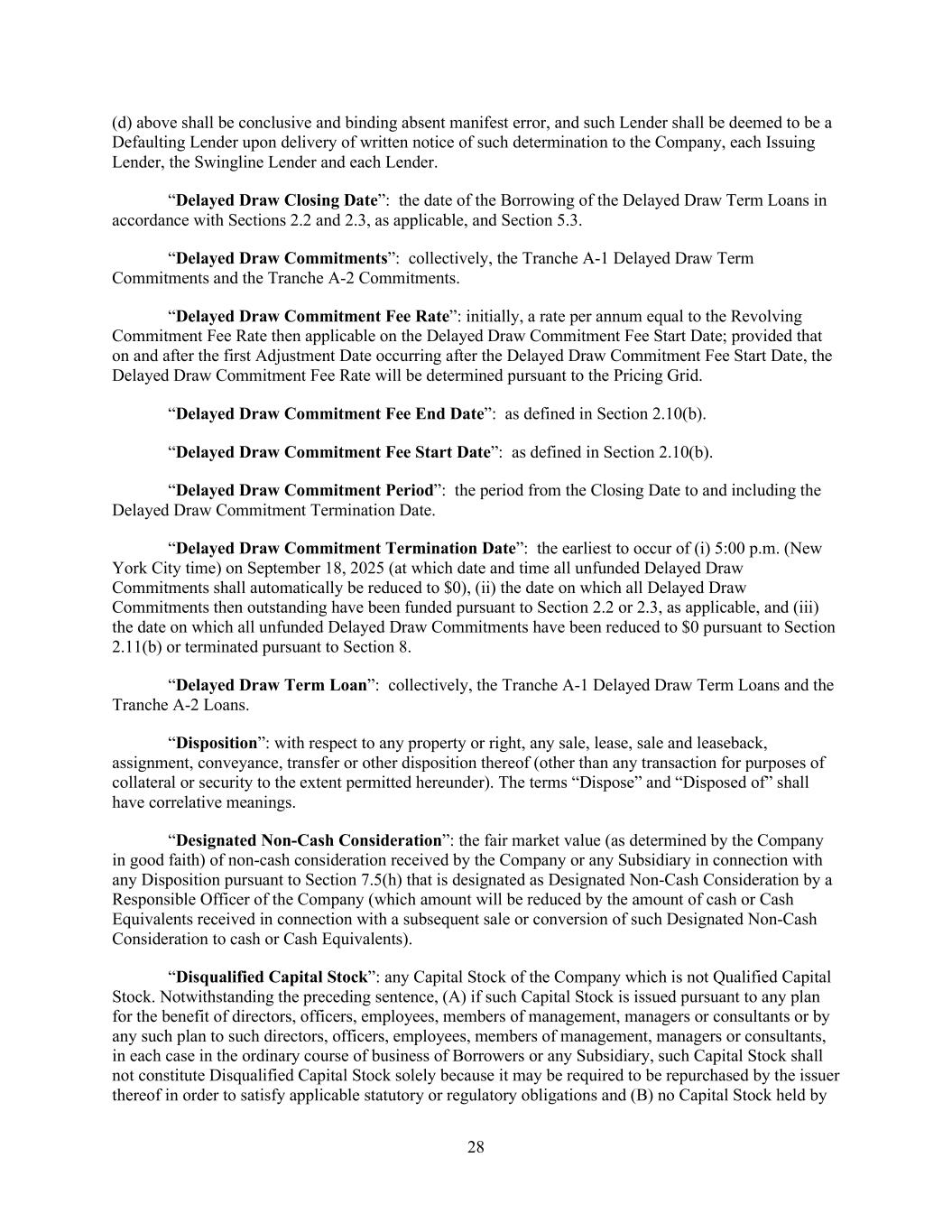 28 (d) above shall be conclusive and binding absent manifest error, and such Lender shall be deemed to be a Defaulting Lender upon delivery of written notice of such determination to the Company, each Issuing Lender, the Swingline Lender and each Lender. “Delayed Draw Closing Date”: the date of the Borrowing of the Delayed Draw Term Loans in accordance with Sections 2.2 and 2.3, as applicable, and Section 5.3. “Delayed Draw Commitments”: collectively, the Tranche A-1 Delayed Draw Term Commitments and the Tranche A-2 Commitments. “Delayed Draw Commitment Fee Rate”: initially, a rate per annum equal to the Revolving Commitment Fee Rate then applicable on the Delayed Draw Commitment Fee Start Date; provided that on and after the first Adjustment Date occurring after the Delayed Draw Commitment Fee Start Date, the Delayed Draw Commitment Fee Rate will be determined pursuant to the Pricing Grid. “Delayed Draw Commitment Fee End Date”: as defined in Section 2.10(b). “Delayed Draw Commitment Fee Start Date”: as defined in Section 2.10(b). “Delayed Draw Commitment Period”: the period from the Closing Date to and including the Delayed Draw Commitment Termination Date. “Delayed Draw Commitment Termination Date”: the earliest to occur of (i) 5:00 p.m. (New York City time) on September 18, 2025 (at which date and time all unfunded Delayed Draw Commitments shall automatically be reduced to $0), (ii) the date on which all Delayed Draw Commitments then outstanding have been funded pursuant to Section 2.2 or 2.3, as applicable, and (iii) the date on which all unfunded Delayed Draw Commitments have been reduced to $0 pursuant to Section 2.11(b) or terminated pursuant to Section 8. “Delayed Draw Term Loan”: collectively, the Tranche A-1 Delayed Draw Term Loans and the Tranche A-2 Loans. “Disposition”: with respect to any property or right, any sale, lease, sale and leaseback, assignment, conveyance, transfer or other disposition thereof (other than any transaction for purposes of collateral or security to the extent permitted hereunder). The terms “Dispose” and “Disposed of” shall have correlative meanings. “Designated Non-Cash Consideration”: the fair market value (as determined by the Company in good faith) of non-cash consideration received by the Company or any Subsidiary in connection with any Disposition pursuant to Section 7.5(h) that is designated as Designated Non-Cash Consideration by a Responsible Officer of the Company (which amount will be reduced by the amount of cash or Cash Equivalents received in connection with a subsequent sale or conversion of such Designated Non-Cash Consideration to cash or Cash Equivalents). “Disqualified Capital Stock”: any Capital Stock of the Company which is not Qualified Capital Stock. Notwithstanding the preceding sentence, (A) if such Capital Stock is issued pursuant to any plan for the benefit of directors, officers, employees, members of management, managers or consultants or by any such plan to such directors, officers, employees, members of management, managers or consultants, in each case in the ordinary course of business of Borrowers or any Subsidiary, such Capital Stock shall not constitute Disqualified Capital Stock solely because it may be required to be repurchased by the issuer thereof in order to satisfy applicable statutory or regulatory obligations and (B) no Capital Stock held by