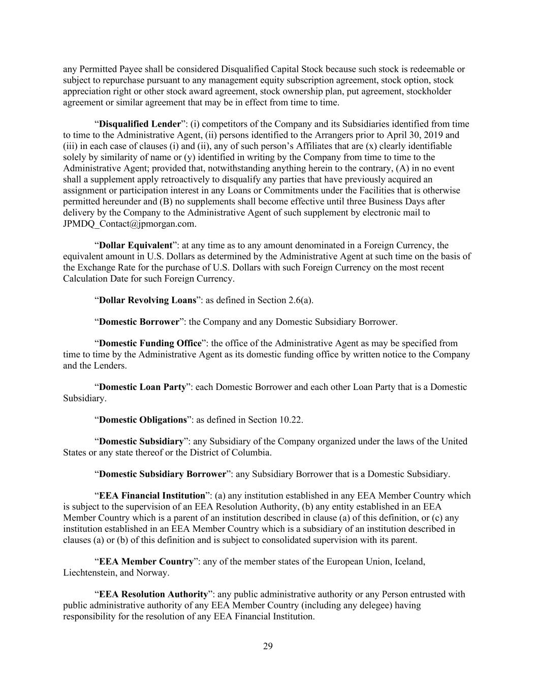 29 any Permitted Payee shall be considered Disqualified Capital Stock because such stock is redeemable or subject to repurchase pursuant to any management equity subscription agreement, stock option, stock appreciation right or other stock award agreement, stock ownership plan, put agreement, stockholder agreement or similar agreement that may be in effect from time to time. “Disqualified Lender”: (i) competitors of the Company and its Subsidiaries identified from time to time to the Administrative Agent, (ii) persons identified to the Arrangers prior to April 30, 2019 and (iii) in each case of clauses (i) and (ii), any of such person’s Affiliates that are (x) clearly identifiable solely by similarity of name or (y) identified in writing by the Company from time to time to the Administrative Agent; provided that, notwithstanding anything herein to the contrary, (A) in no event shall a supplement apply retroactively to disqualify any parties that have previously acquired an assignment or participation interest in any Loans or Commitments under the Facilities that is otherwise permitted hereunder and (B) no supplements shall become effective until three Business Days after delivery by the Company to the Administrative Agent of such supplement by electronic mail to JPMDQ_Contact@jpmorgan.com. “Dollar Equivalent”: at any time as to any amount denominated in a Foreign Currency, the equivalent amount in U.S. Dollars as determined by the Administrative Agent at such time on the basis of the Exchange Rate for the purchase of U.S. Dollars with such Foreign Currency on the most recent Calculation Date for such Foreign Currency. “Dollar Revolving Loans”: as defined in Section 2.6(a). “Domestic Borrower”: the Company and any Domestic Subsidiary Borrower. “Domestic Funding Office”: the office of the Administrative Agent as may be specified from time to time by the Administrative Agent as its domestic funding office by written notice to the Company and the Lenders. “Domestic Loan Party”: each Domestic Borrower and each other Loan Party that is a Domestic Subsidiary. “Domestic Obligations”: as defined in Section 10.22. “Domestic Subsidiary”: any Subsidiary of the Company organized under the laws of the United States or any state thereof or the District of Columbia. “Domestic Subsidiary Borrower”: any Subsidiary Borrower that is a Domestic Subsidiary. “EEA Financial Institution”: (a) any institution established in any EEA Member Country which is subject to the supervision of an EEA Resolution Authority, (b) any entity established in an EEA Member Country which is a parent of an institution described in clause (a) of this definition, or (c) any institution established in an EEA Member Country which is a subsidiary of an institution described in clauses (a) or (b) of this definition and is subject to consolidated supervision with its parent. “EEA Member Country”: any of the member states of the European Union, Iceland, Liechtenstein, and Norway. “EEA Resolution Authority”: any public administrative authority or any Person entrusted with public administrative authority of any EEA Member Country (including any delegee) having responsibility for the resolution of any EEA Financial Institution.