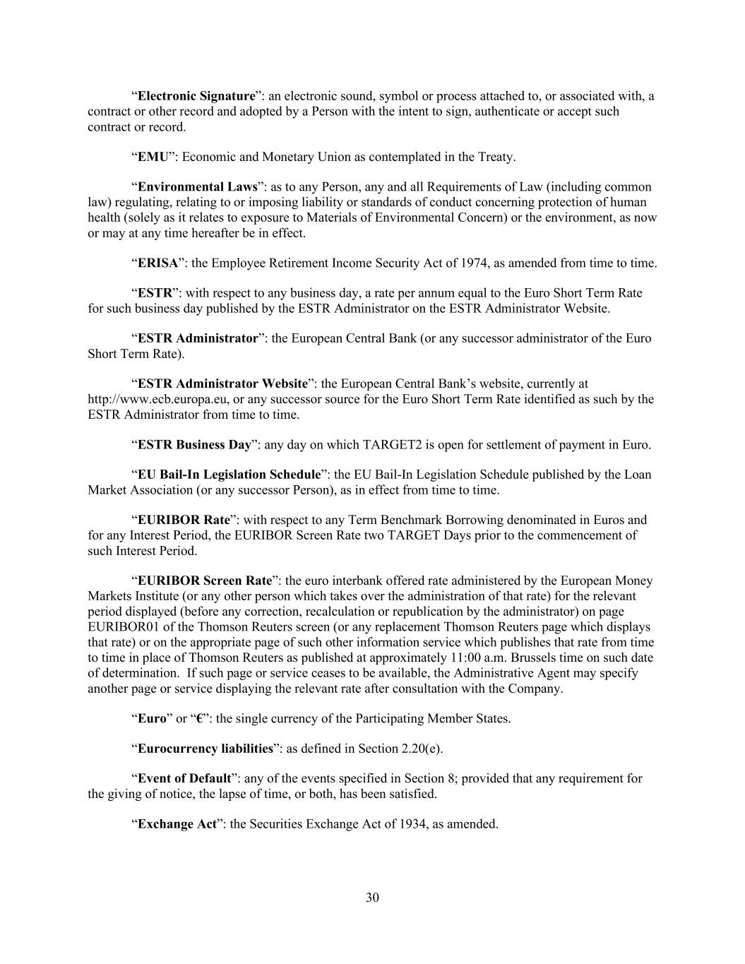 30 “Electronic Signature”: an electronic sound, symbol or process attached to, or associated with, a contract or other record and adopted by a Person with the intent to sign, authenticate or accept such contract or record. “EMU”: Economic and Monetary Union as contemplated in the Treaty. “Environmental Laws”: as to any Person, any and all Requirements of Law (including common law) regulating, relating to or imposing liability or standards of conduct concerning protection of human health (solely as it relates to exposure to Materials of Environmental Concern) or the environment, as now or may at any time hereafter be in effect. “ERISA”: the Employee Retirement Income Security Act of 1974, as amended from time to time. “ESTR”: with respect to any business day, a rate per annum equal to the Euro Short Term Rate for such business day published by the ESTR Administrator on the ESTR Administrator Website. “ESTR Administrator”: the European Central Bank (or any successor administrator of the Euro Short Term Rate). “ESTR Administrator Website”: the European Central Bank’s website, currently at http://www.ecb.europa.eu, or any successor source for the Euro Short Term Rate identified as such by the ESTR Administrator from time to time. “ESTR Business Day”: any day on which TARGET2 is open for settlement of payment in Euro. “EU Bail-In Legislation Schedule”: the EU Bail-In Legislation Schedule published by the Loan Market Association (or any successor Person), as in effect from time to time. “EURIBOR Rate”: with respect to any Term Benchmark Borrowing denominated in Euros and for any Interest Period, the EURIBOR Screen Rate two TARGET Days prior to the commencement of such Interest Period. “EURIBOR Screen Rate”: the euro interbank offered rate administered by the European Money Markets Institute (or any other person which takes over the administration of that rate) for the relevant period displayed (before any correction, recalculation or republication by the administrator) on page EURIBOR01 of the Thomson Reuters screen (or any replacement Thomson Reuters page which displays that rate) or on the appropriate page of such other information service which publishes that rate from time to time in place of Thomson Reuters as published at approximately 11:00 a.m. Brussels time on such date of determination. If such page or service ceases to be available, the Administrative Agent may specify another page or service displaying the relevant rate after consultation with the Company. “Euro” or “€”: the single currency of the Participating Member States. “Eurocurrency liabilities”: as defined in Section 2.20(e). “Event of Default”: any of the events specified in Section 8; provided that any requirement for the giving of notice, the lapse of time, or both, has been satisfied. “Exchange Act”: the Securities Exchange Act of 1934, as amended.