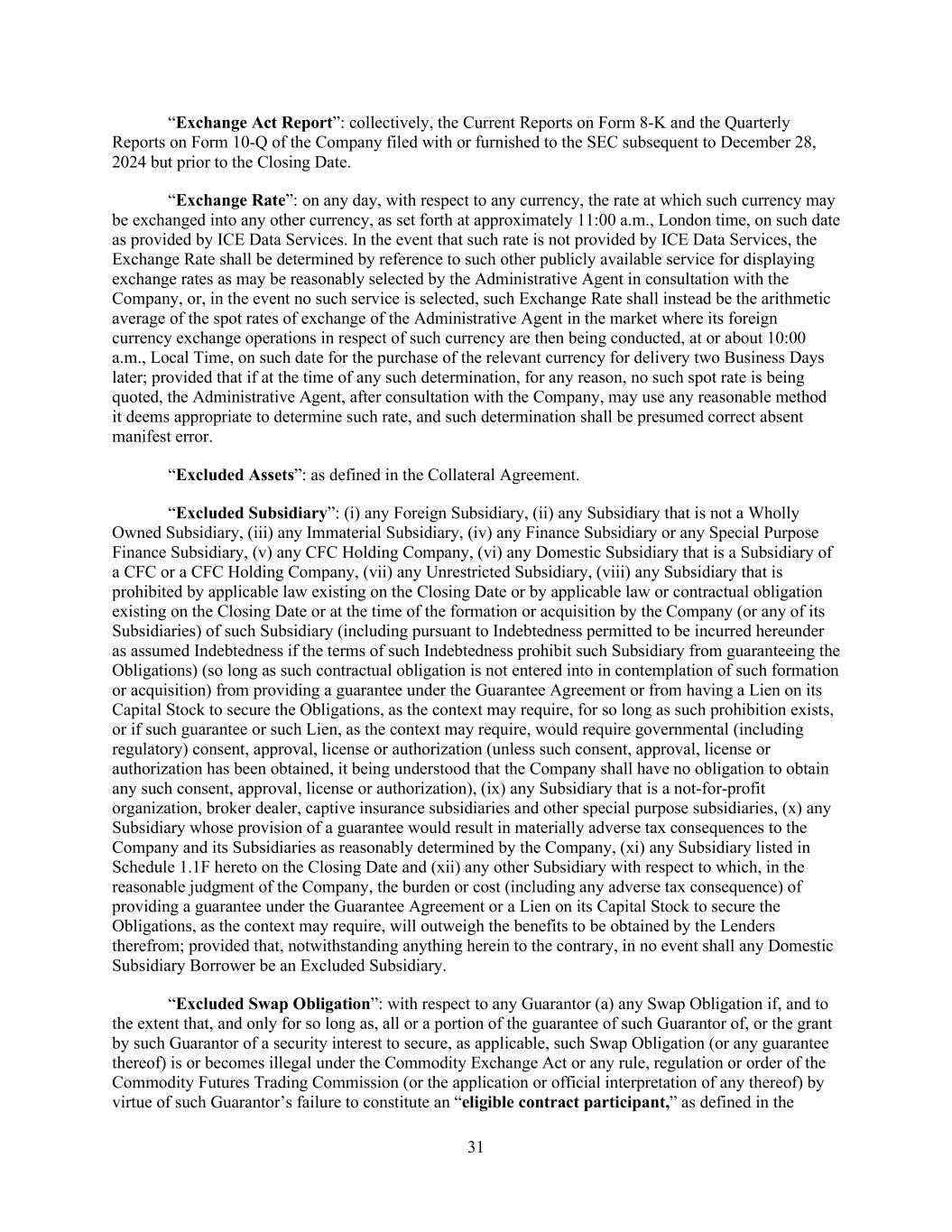 31 “Exchange Act Report”: collectively, the Current Reports on Form 8-K and the Quarterly Reports on Form 10-Q of the Company filed with or furnished to the SEC subsequent to December 28, 2024 but prior to the Closing Date. “Exchange Rate”: on any day, with respect to any currency, the rate at which such currency may be exchanged into any other currency, as set forth at approximately 11:00 a.m., London time, on such date as provided by ICE Data Services. In the event that such rate is not provided by ICE Data Services, the Exchange Rate shall be determined by reference to such other publicly available service for displaying exchange rates as may be reasonably selected by the Administrative Agent in consultation with the Company, or, in the event no such service is selected, such Exchange Rate shall instead be the arithmetic average of the spot rates of exchange of the Administrative Agent in the market where its foreign currency exchange operations in respect of such currency are then being conducted, at or about 10:00 a.m., Local Time, on such date for the purchase of the relevant currency for delivery two Business Days later; provided that if at the time of any such determination, for any reason, no such spot rate is being quoted, the Administrative Agent, after consultation with the Company, may use any reasonable method it deems appropriate to determine such rate, and such determination shall be presumed correct absent manifest error. “Excluded Assets”: as defined in the Collateral Agreement. “Excluded Subsidiary”: (i) any Foreign Subsidiary, (ii) any Subsidiary that is not a Wholly Owned Subsidiary, (iii) any Immaterial Subsidiary, (iv) any Finance Subsidiary or any Special Purpose Finance Subsidiary, (v) any CFC Holding Company, (vi) any Domestic Subsidiary that is a Subsidiary of a CFC or a CFC Holding Company, (vii) any Unrestricted Subsidiary, (viii) any Subsidiary that is prohibited by applicable law existing on the Closing Date or by applicable law or contractual obligation existing on the Closing Date or at the time of the formation or acquisition by the Company (or any of its Subsidiaries) of such Subsidiary (including pursuant to Indebtedness permitted to be incurred hereunder as assumed Indebtedness if the terms of such Indebtedness prohibit such Subsidiary from guaranteeing the Obligations) (so long as such contractual obligation is not entered into in contemplation of such formation or acquisition) from providing a guarantee under the Guarantee Agreement or from having a Lien on its Capital Stock to secure the Obligations, as the context may require, for so long as such prohibition exists, or if such guarantee or such Lien, as the context may require, would require governmental (including regulatory) consent, approval, license or authorization (unless such consent, approval, license or authorization has been obtained, it being understood that the Company shall have no obligation to obtain any such consent, approval, license or authorization), (ix) any Subsidiary that is a not-for-profit organization, broker dealer, captive insurance subsidiaries and other special purpose subsidiaries, (x) any Subsidiary whose provision of a guarantee would result in materially adverse tax consequences to the Company and its Subsidiaries as reasonably determined by the Company, (xi) any Subsidiary listed in Schedule 1.1F hereto on the Closing Date and (xii) any other Subsidiary with respect to which, in the reasonable judgment of the Company, the burden or cost (including any adverse tax consequence) of providing a guarantee under the Guarantee Agreement or a Lien on its Capital Stock to secure the Obligations, as the context may require, will outweigh the benefits to be obtained by the Lenders therefrom; provided that, notwithstanding anything herein to the contrary, in no event shall any Domestic Subsidiary Borrower be an Excluded Subsidiary. “Excluded Swap Obligation”: with respect to any Guarantor (a) any Swap Obligation if, and to the extent that, and only for so long as, all or a portion of the guarantee of such Guarantor of, or the grant by such Guarantor of a security interest to secure, as applicable, such Swap Obligation (or any guarantee thereof) is or becomes illegal under the Commodity Exchange Act or any rule, regulation or order of the Commodity Futures Trading Commission (or the application or official interpretation of any thereof) by virtue of such Guarantor’s failure to constitute an “eligible contract participant,” as defined in the