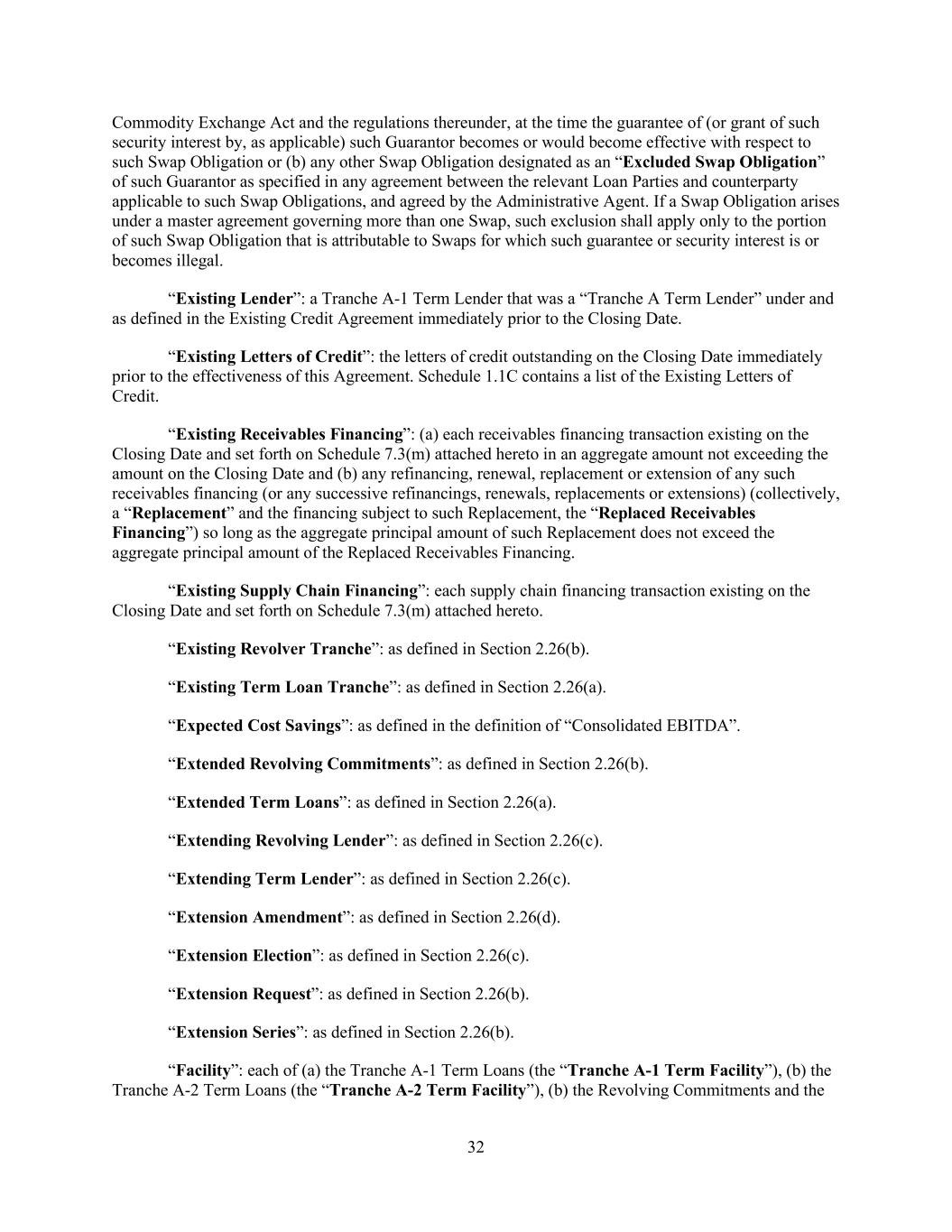 32 Commodity Exchange Act and the regulations thereunder, at the time the guarantee of (or grant of such security interest by, as applicable) such Guarantor becomes or would become effective with respect to such Swap Obligation or (b) any other Swap Obligation designated as an “Excluded Swap Obligation” of such Guarantor as specified in any agreement between the relevant Loan Parties and counterparty applicable to such Swap Obligations, and agreed by the Administrative Agent. If a Swap Obligation arises under a master agreement governing more than one Swap, such exclusion shall apply only to the portion of such Swap Obligation that is attributable to Swaps for which such guarantee or security interest is or becomes illegal. “Existing Lender”: a Tranche A-1 Term Lender that was a “Tranche A Term Lender” under and as defined in the Existing Credit Agreement immediately prior to the Closing Date. “Existing Letters of Credit”: the letters of credit outstanding on the Closing Date immediately prior to the effectiveness of this Agreement. Schedule 1.1C contains a list of the Existing Letters of Credit. “Existing Receivables Financing”: (a) each receivables financing transaction existing on the Closing Date and set forth on Schedule 7.3(m) attached hereto in an aggregate amount not exceeding the amount on the Closing Date and (b) any refinancing, renewal, replacement or extension of any such receivables financing (or any successive refinancings, renewals, replacements or extensions) (collectively, a “Replacement” and the financing subject to such Replacement, the “Replaced Receivables Financing”) so long as the aggregate principal amount of such Replacement does not exceed the aggregate principal amount of the Replaced Receivables Financing. “Existing Supply Chain Financing”: each supply chain financing transaction existing on the Closing Date and set forth on Schedule 7.3(m) attached hereto. “Existing Revolver Tranche”: as defined in Section 2.26(b). “Existing Term Loan Tranche”: as defined in Section 2.26(a). “Expected Cost Savings”: as defined in the definition of “Consolidated EBITDA”. “Extended Revolving Commitments”: as defined in Section 2.26(b). “Extended Term Loans”: as defined in Section 2.26(a). “Extending Revolving Lender”: as defined in Section 2.26(c). “Extending Term Lender”: as defined in Section 2.26(c). “Extension Amendment”: as defined in Section 2.26(d). “Extension Election”: as defined in Section 2.26(c). “Extension Request”: as defined in Section 2.26(b). “Extension Series”: as defined in Section 2.26(b). “Facility”: each of (a) the Tranche A-1 Term Loans (the “Tranche A-1 Term Facility”), (b) the Tranche A-2 Term Loans (the “Tranche A-2 Term Facility”), (b) the Revolving Commitments and the