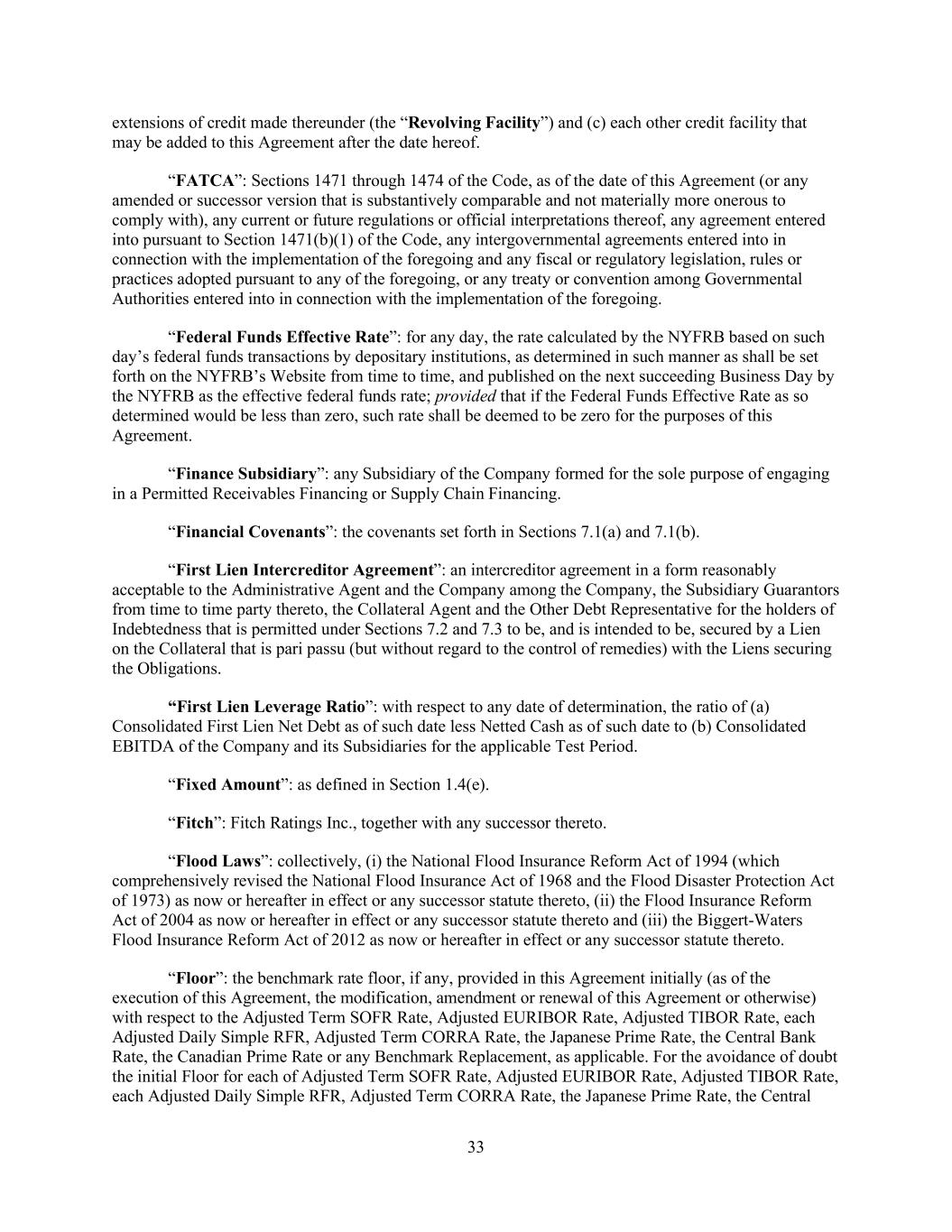 33 extensions of credit made thereunder (the “Revolving Facility”) and (c) each other credit facility that may be added to this Agreement after the date hereof. “FATCA”: Sections 1471 through 1474 of the Code, as of the date of this Agreement (or any amended or successor version that is substantively comparable and not materially more onerous to comply with), any current or future regulations or official interpretations thereof, any agreement entered into pursuant to Section 1471(b)(1) of the Code, any intergovernmental agreements entered into in connection with the implementation of the foregoing and any fiscal or regulatory legislation, rules or practices adopted pursuant to any of the foregoing, or any treaty or convention among Governmental Authorities entered into in connection with the implementation of the foregoing. “Federal Funds Effective Rate”: for any day, the rate calculated by the NYFRB based on such day’s federal funds transactions by depositary institutions, as determined in such manner as shall be set forth on the NYFRB’s Website from time to time, and published on the next succeeding Business Day by the NYFRB as the effective federal funds rate; provided that if the Federal Funds Effective Rate as so determined would be less than zero, such rate shall be deemed to be zero for the purposes of this Agreement. “Finance Subsidiary”: any Subsidiary of the Company formed for the sole purpose of engaging in a Permitted Receivables Financing or Supply Chain Financing. “Financial Covenants”: the covenants set forth in Sections 7.1(a) and 7.1(b). “First Lien Intercreditor Agreement”: an intercreditor agreement in a form reasonably acceptable to the Administrative Agent and the Company among the Company, the Subsidiary Guarantors from time to time party thereto, the Collateral Agent and the Other Debt Representative for the holders of Indebtedness that is permitted under Sections 7.2 and 7.3 to be, and is intended to be, secured by a Lien on the Collateral that is pari passu (but without regard to the control of remedies) with the Liens securing the Obligations. “First Lien Leverage Ratio”: with respect to any date of determination, the ratio of (a) Consolidated First Lien Net Debt as of such date less Netted Cash as of such date to (b) Consolidated EBITDA of the Company and its Subsidiaries for the applicable Test Period. “Fixed Amount”: as defined in Section 1.4(e). “Fitch”: Fitch Ratings Inc., together with any successor thereto. “Flood Laws”: collectively, (i) the National Flood Insurance Reform Act of 1994 (which comprehensively revised the National Flood Insurance Act of 1968 and the Flood Disaster Protection Act of 1973) as now or hereafter in effect or any successor statute thereto, (ii) the Flood Insurance Reform Act of 2004 as now or hereafter in effect or any successor statute thereto and (iii) the Biggert-Waters Flood Insurance Reform Act of 2012 as now or hereafter in effect or any successor statute thereto. “Floor”: the benchmark rate floor, if any, provided in this Agreement initially (as of the execution of this Agreement, the modification, amendment or renewal of this Agreement or otherwise) with respect to the Adjusted Term SOFR Rate, Adjusted EURIBOR Rate, Adjusted TIBOR Rate, each Adjusted Daily Simple RFR, Adjusted Term CORRA Rate, the Japanese Prime Rate, the Central Bank Rate, the Canadian Prime Rate or any Benchmark Replacement, as applicable. For the avoidance of doubt the initial Floor for each of Adjusted Term SOFR Rate, Adjusted EURIBOR Rate, Adjusted TIBOR Rate, each Adjusted Daily Simple RFR, Adjusted Term CORRA Rate, the Japanese Prime Rate, the Central