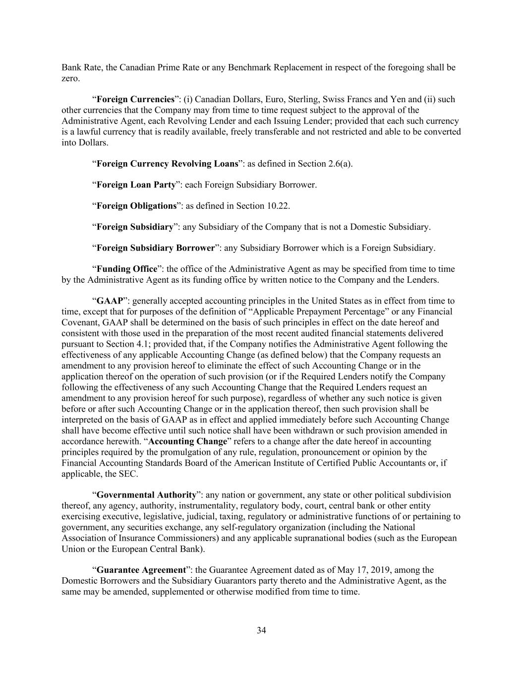 34 Bank Rate, the Canadian Prime Rate or any Benchmark Replacement in respect of the foregoing shall be zero. “Foreign Currencies”: (i) Canadian Dollars, Euro, Sterling, Swiss Francs and Yen and (ii) such other currencies that the Company may from time to time request subject to the approval of the Administrative Agent, each Revolving Lender and each Issuing Lender; provided that each such currency is a lawful currency that is readily available, freely transferable and not restricted and able to be converted into Dollars. “Foreign Currency Revolving Loans”: as defined in Section 2.6(a). “Foreign Loan Party”: each Foreign Subsidiary Borrower. “Foreign Obligations”: as defined in Section 10.22. “Foreign Subsidiary”: any Subsidiary of the Company that is not a Domestic Subsidiary. “Foreign Subsidiary Borrower”: any Subsidiary Borrower which is a Foreign Subsidiary. “Funding Office”: the office of the Administrative Agent as may be specified from time to time by the Administrative Agent as its funding office by written notice to the Company and the Lenders. “GAAP”: generally accepted accounting principles in the United States as in effect from time to time, except that for purposes of the definition of “Applicable Prepayment Percentage” or any Financial Covenant, GAAP shall be determined on the basis of such principles in effect on the date hereof and consistent with those used in the preparation of the most recent audited financial statements delivered pursuant to Section 4.1; provided that, if the Company notifies the Administrative Agent following the effectiveness of any applicable Accounting Change (as defined below) that the Company requests an amendment to any provision hereof to eliminate the effect of such Accounting Change or in the application thereof on the operation of such provision (or if the Required Lenders notify the Company following the effectiveness of any such Accounting Change that the Required Lenders request an amendment to any provision hereof for such purpose), regardless of whether any such notice is given before or after such Accounting Change or in the application thereof, then such provision shall be interpreted on the basis of GAAP as in effect and applied immediately before such Accounting Change shall have become effective until such notice shall have been withdrawn or such provision amended in accordance herewith. “Accounting Change” refers to a change after the date hereof in accounting principles required by the promulgation of any rule, regulation, pronouncement or opinion by the Financial Accounting Standards Board of the American Institute of Certified Public Accountants or, if applicable, the SEC. “Governmental Authority”: any nation or government, any state or other political subdivision thereof, any agency, authority, instrumentality, regulatory body, court, central bank or other entity exercising executive, legislative, judicial, taxing, regulatory or administrative functions of or pertaining to government, any securities exchange, any self-regulatory organization (including the National Association of Insurance Commissioners) and any applicable supranational bodies (such as the European Union or the European Central Bank). “Guarantee Agreement”: the Guarantee Agreement dated as of May 17, 2019, among the Domestic Borrowers and the Subsidiary Guarantors party thereto and the Administrative Agent, as the same may be amended, supplemented or otherwise modified from time to time.