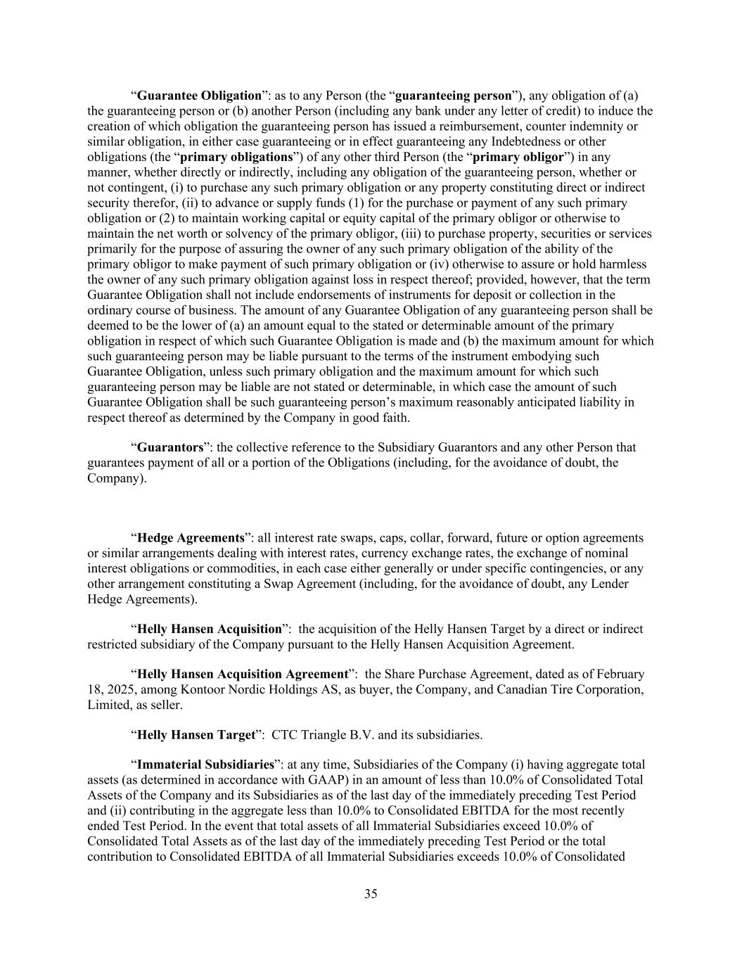 35 “Guarantee Obligation”: as to any Person (the “guaranteeing person”), any obligation of (a) the guaranteeing person or (b) another Person (including any bank under any letter of credit) to induce the creation of which obligation the guaranteeing person has issued a reimbursement, counter indemnity or similar obligation, in either case guaranteeing or in effect guaranteeing any Indebtedness or other obligations (the “primary obligations”) of any other third Person (the “primary obligor”) in any manner, whether directly or indirectly, including any obligation of the guaranteeing person, whether or not contingent, (i) to purchase any such primary obligation or any property constituting direct or indirect security therefor, (ii) to advance or supply funds (1) for the purchase or payment of any such primary obligation or (2) to maintain working capital or equity capital of the primary obligor or otherwise to maintain the net worth or solvency of the primary obligor, (iii) to purchase property, securities or services primarily for the purpose of assuring the owner of any such primary obligation of the ability of the primary obligor to make payment of such primary obligation or (iv) otherwise to assure or hold harmless the owner of any such primary obligation against loss in respect thereof; provided, however, that the term Guarantee Obligation shall not include endorsements of instruments for deposit or collection in the ordinary course of business. The amount of any Guarantee Obligation of any guaranteeing person shall be deemed to be the lower of (a) an amount equal to the stated or determinable amount of the primary obligation in respect of which such Guarantee Obligation is made and (b) the maximum amount for which such guaranteeing person may be liable pursuant to the terms of the instrument embodying such Guarantee Obligation, unless such primary obligation and the maximum amount for which such guaranteeing person may be liable are not stated or determinable, in which case the amount of such Guarantee Obligation shall be such guaranteeing person’s maximum reasonably anticipated liability in respect thereof as determined by the Company in good faith. “Guarantors”: the collective reference to the Subsidiary Guarantors and any other Person that guarantees payment of all or a portion of the Obligations (including, for the avoidance of doubt, the Company). “Hedge Agreements”: all interest rate swaps, caps, collar, forward, future or option agreements or similar arrangements dealing with interest rates, currency exchange rates, the exchange of nominal interest obligations or commodities, in each case either generally or under specific contingencies, or any other arrangement constituting a Swap Agreement (including, for the avoidance of doubt, any Lender Hedge Agreements). “Helly Hansen Acquisition”: the acquisition of the Helly Hansen Target by a direct or indirect restricted subsidiary of the Company pursuant to the Helly Hansen Acquisition Agreement. “Helly Hansen Acquisition Agreement”: the Share Purchase Agreement, dated as of February 18, 2025, among Kontoor Nordic Holdings AS, as buyer, the Company, and Canadian Tire Corporation, Limited, as seller. “Helly Hansen Target”: CTC Triangle B.V. and its subsidiaries. “Immaterial Subsidiaries”: at any time, Subsidiaries of the Company (i) having aggregate total assets (as determined in accordance with GAAP) in an amount of less than 10.0% of Consolidated Total Assets of the Company and its Subsidiaries as of the last day of the immediately preceding Test Period and (ii) contributing in the aggregate less than 10.0% to Consolidated EBITDA for the most recently ended Test Period. In the event that total assets of all Immaterial Subsidiaries exceed 10.0% of Consolidated Total Assets as of the last day of the immediately preceding Test Period or the total contribution to Consolidated EBITDA of all Immaterial Subsidiaries exceeds 10.0% of Consolidated