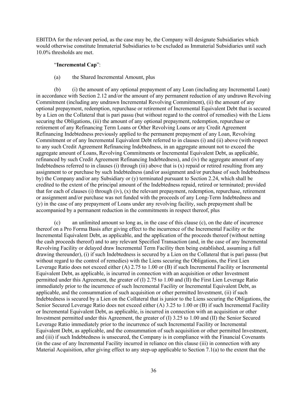 36 EBITDA for the relevant period, as the case may be, the Company will designate Subsidiaries which would otherwise constitute Immaterial Subsidiaries to be excluded as Immaterial Subsidiaries until such 10.0% thresholds are met. “Incremental Cap”: (a) the Shared Incremental Amount, plus (b) (i) the amount of any optional prepayment of any Loan (including any Incremental Loan) in accordance with Section 2.12 and/or the amount of any permanent reduction of any undrawn Revolving Commitment (including any undrawn Incremental Revolving Commitment), (ii) the amount of any optional prepayment, redemption, repurchase or retirement of Incremental Equivalent Debt that is secured by a Lien on the Collateral that is pari passu (but without regard to the control of remedies) with the Liens securing the Obligations, (iii) the amount of any optional prepayment, redemption, repurchase or retirement of any Refinancing Term Loans or Other Revolving Loans or any Credit Agreement Refinancing Indebtedness previously applied to the permanent prepayment of any Loan, Revolving Commitment or of any Incremental Equivalent Debt referred to in clauses (i) and (ii) above (with respect to any such Credit Agreement Refinancing Indebtedness, in an aggregate amount not to exceed the aggregate amount of Loans, Revolving Commitments or Incremental Equivalent Debt, as applicable, refinanced by such Credit Agreement Refinancing Indebtedness), and (iv) the aggregate amount of any Indebtedness referred to in clauses (i) through (iii) above that is (x) repaid or retired resulting from any assignment to or purchase by such Indebtedness (and/or assignment and/or purchase of such Indebtedness by) the Company and/or any Subsidiary or (y) terminated pursuant to Section 2.24, which shall be credited to the extent of the principal amount of the Indebtedness repaid, retired or terminated; provided that for each of clauses (i) through (iv), (x) the relevant prepayment, redemption, repurchase, retirement or assignment and/or purchase was not funded with the proceeds of any Long-Term Indebtedness and (y) in the case of any prepayment of Loans under any revolving facility, such prepayment shall be accompanied by a permanent reduction in the commitments in respect thereof, plus (c) an unlimited amount so long as, in the case of this clause (c), on the date of incurrence thereof on a Pro Forma Basis after giving effect to the incurrence of the Incremental Facility or the Incremental Equivalent Debt, as applicable, and the application of the proceeds thereof (without netting the cash proceeds thereof) and to any relevant Specified Transaction (and, in the case of any Incremental Revolving Facility or delayed draw Incremental Term Facility then being established, assuming a full drawing thereunder), (i) if such Indebtedness is secured by a Lien on the Collateral that is pari passu (but without regard to the control of remedies) with the Liens securing the Obligations, the First Lien Leverage Ratio does not exceed either (A) 2.75 to 1.00 or (B) if such Incremental Facility or Incremental Equivalent Debt, as applicable, is incurred in connection with an acquisition or other Investment permitted under this Agreement, the greater of (I) 2.75 to 1.00 and (II) the First Lien Leverage Ratio immediately prior to the incurrence of such Incremental Facility or Incremental Equivalent Debt, as applicable, and the consummation of such acquisition or other permitted Investment, (ii) if such Indebtedness is secured by a Lien on the Collateral that is junior to the Liens securing the Obligations, the Senior Secured Leverage Ratio does not exceed either (A) 3.25 to 1.00 or (B) if such Incremental Facility or Incremental Equivalent Debt, as applicable, is incurred in connection with an acquisition or other Investment permitted under this Agreement, the greater of (I) 3.25 to 1.00 and (II) the Senior Secured Leverage Ratio immediately prior to the incurrence of such Incremental Facility or Incremental Equivalent Debt, as applicable, and the consummation of such acquisition or other permitted Investment, and (iii) if such Indebtedness is unsecured, the Company is in compliance with the Financial Covenants (in the case of any Incremental Facility incurred in reliance on this clause (iii) in connection with any Material Acquisition, after giving effect to any step-up applicable to Section 7.1(a) to the extent that the