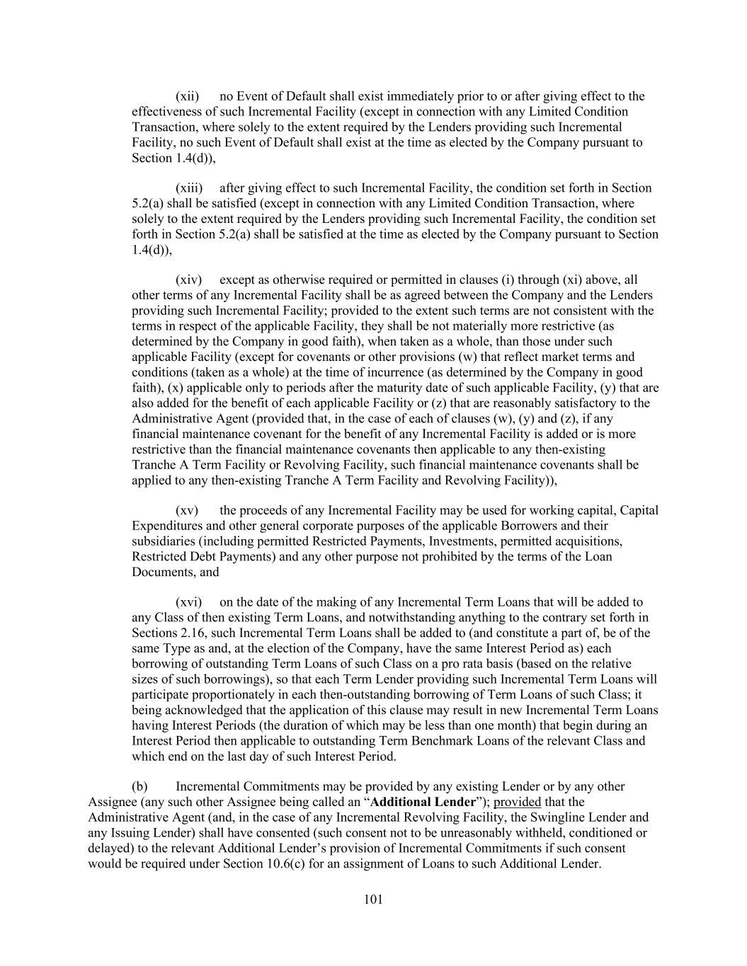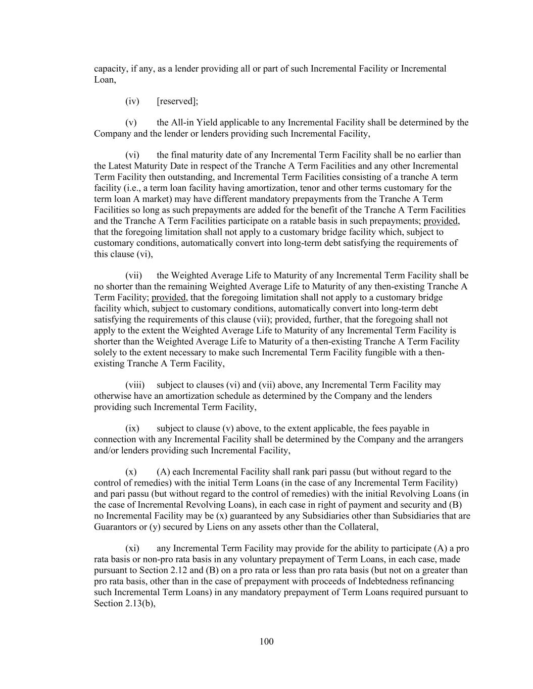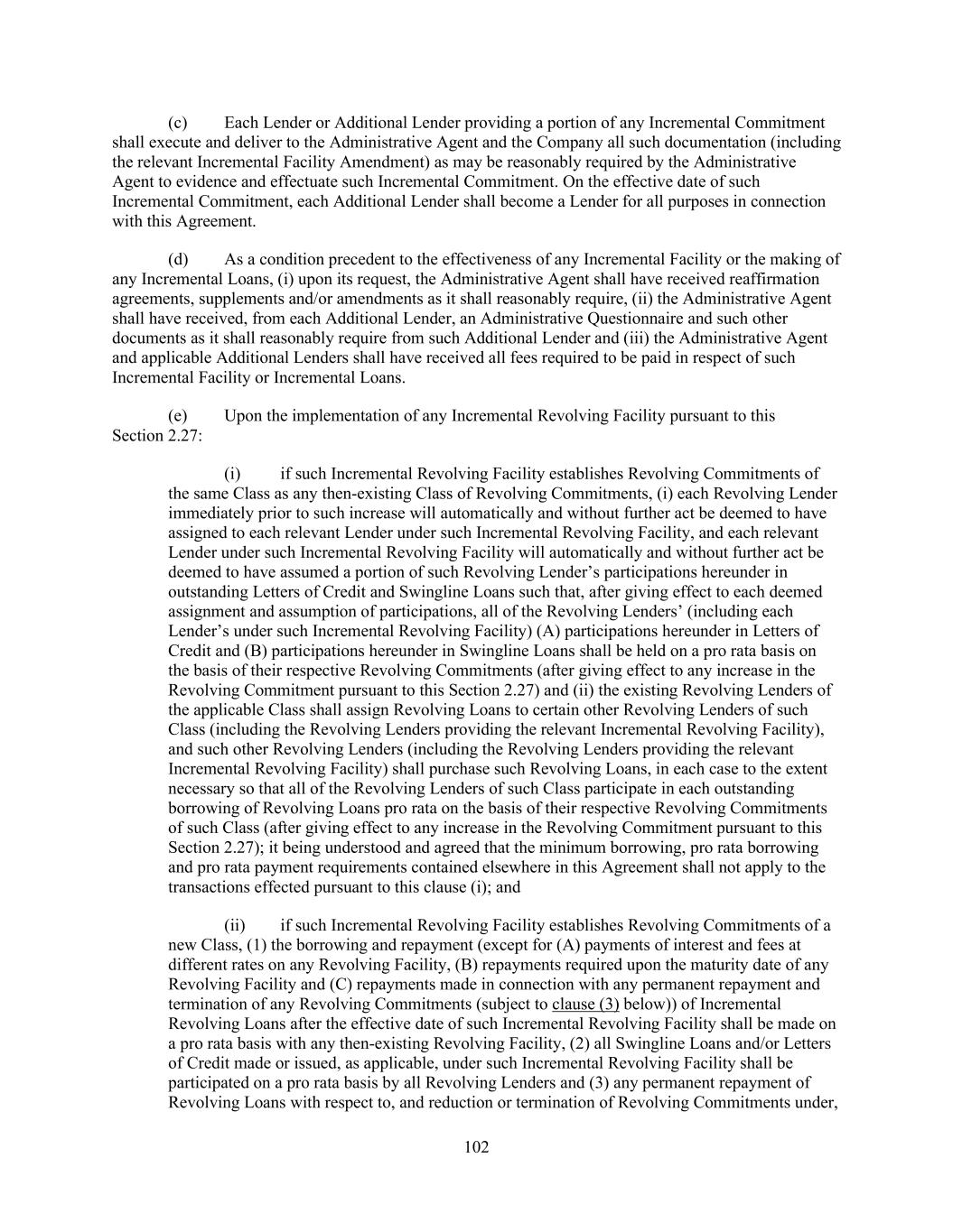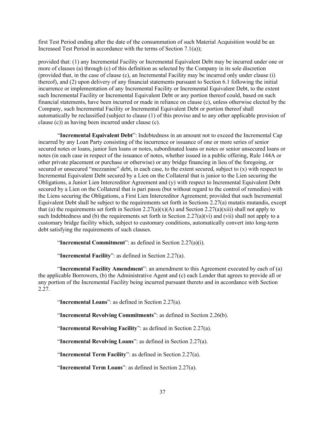 37 first Test Period ending after the date of the consummation of such Material Acquisition would be an Increased Test Period in accordance with the terms of Section 7.1(a)); provided that: (1) any Incremental Facility or Incremental Equivalent Debt may be incurred under one or more of clauses (a) through (c) of this definition as selected by the Company in its sole discretion (provided that, in the case of clause (c), an Incremental Facility may be incurred only under clause (i) thereof), and (2) upon delivery of any financial statements pursuant to Section 6.1 following the initial incurrence or implementation of any Incremental Facility or Incremental Equivalent Debt, to the extent such Incremental Facility or Incremental Equivalent Debt or any portion thereof could, based on such financial statements, have been incurred or made in reliance on clause (c), unless otherwise elected by the Company, such Incremental Facility or Incremental Equivalent Debt or portion thereof shall automatically be reclassified (subject to clause (1) of this proviso and to any other applicable provision of clause (c)) as having been incurred under clause (c). “Incremental Equivalent Debt”: Indebtedness in an amount not to exceed the Incremental Cap incurred by any Loan Party consisting of the incurrence or issuance of one or more series of senior secured notes or loans, junior lien loans or notes, subordinated loans or notes or senior unsecured loans or notes (in each case in respect of the issuance of notes, whether issued in a public offering, Rule 144A or other private placement or purchase or otherwise) or any bridge financing in lieu of the foregoing, or secured or unsecured “mezzanine” debt, in each case, to the extent secured, subject to (x) with respect to Incremental Equivalent Debt secured by a Lien on the Collateral that is junior to the Lien securing the Obligations, a Junior Lien Intercreditor Agreement and (y) with respect to Incremental Equivalent Debt secured by a Lien on the Collateral that is pari passu (but without regard to the control of remedies) with the Liens securing the Obligations, a First Lien Intercreditor Agreement; provided that such Incremental Equivalent Debt shall be subject to the requirements set forth in Sections 2.27(a) mutatis mutandis, except that (a) the requirements set forth in Section 2.27(a)(x)(A) and Section 2.27(a)(xiii) shall not apply to such Indebtedness and (b) the requirements set forth in Section 2.27(a)(vi) and (vii) shall not apply to a customary bridge facility which, subject to customary conditions, automatically convert into long-term debt satisfying the requirements of such clauses. “Incremental Commitment”: as defined in Section 2.27(a)(i). “Incremental Facility”: as defined in Section 2.27(a). “Incremental Facility Amendment”: an amendment to this Agreement executed by each of (a) the applicable Borrowers, (b) the Administrative Agent and (c) each Lender that agrees to provide all or any portion of the Incremental Facility being incurred pursuant thereto and in accordance with Section 2.27. “Incremental Loans”: as defined in Section 2.27(a). “Incremental Revolving Commitments”: as defined in Section 2.26(b). “Incremental Revolving Facility”: as defined in Section 2.27(a). “Incremental Revolving Loans”: as defined in Section 2.27(a). “Incremental Term Facility”: as defined in Section 2.27(a). “Incremental Term Loans”: as defined in Section 2.27(a).