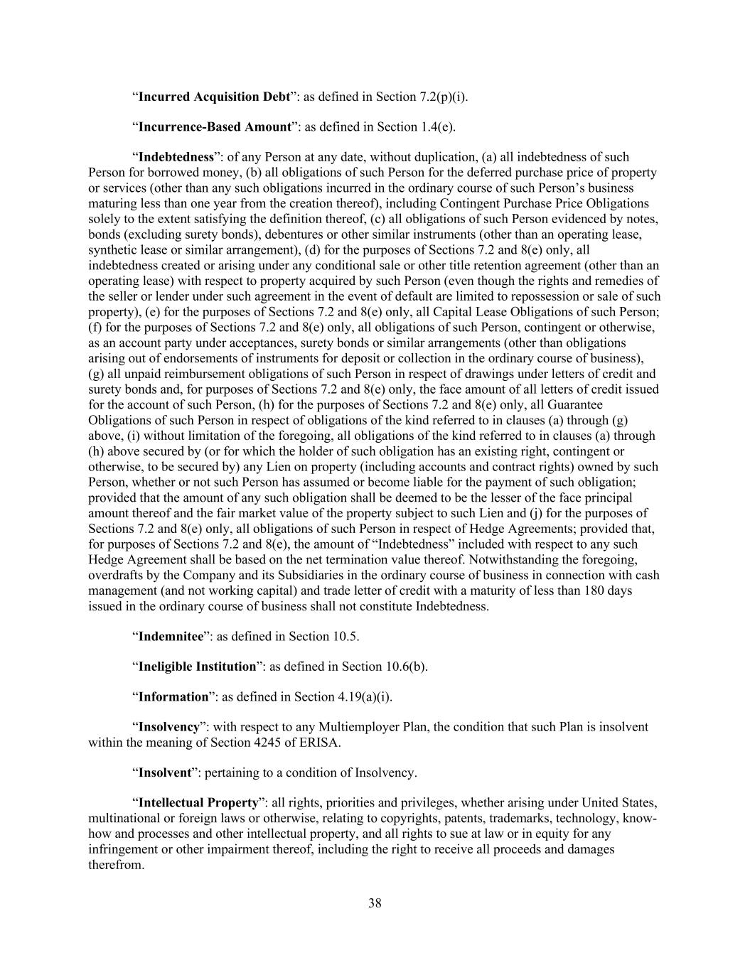 38 “Incurred Acquisition Debt”: as defined in Section 7.2(p)(i). “Incurrence-Based Amount”: as defined in Section 1.4(e). “Indebtedness”: of any Person at any date, without duplication, (a) all indebtedness of such Person for borrowed money, (b) all obligations of such Person for the deferred purchase price of property or services (other than any such obligations incurred in the ordinary course of such Person’s business maturing less than one year from the creation thereof), including Contingent Purchase Price Obligations solely to the extent satisfying the definition thereof, (c) all obligations of such Person evidenced by notes, bonds (excluding surety bonds), debentures or other similar instruments (other than an operating lease, synthetic lease or similar arrangement), (d) for the purposes of Sections 7.2 and 8(e) only, all indebtedness created or arising under any conditional sale or other title retention agreement (other than an operating lease) with respect to property acquired by such Person (even though the rights and remedies of the seller or lender under such agreement in the event of default are limited to repossession or sale of such property), (e) for the purposes of Sections 7.2 and 8(e) only, all Capital Lease Obligations of such Person; (f) for the purposes of Sections 7.2 and 8(e) only, all obligations of such Person, contingent or otherwise, as an account party under acceptances, surety bonds or similar arrangements (other than obligations arising out of endorsements of instruments for deposit or collection in the ordinary course of business), (g) all unpaid reimbursement obligations of such Person in respect of drawings under letters of credit and surety bonds and, for purposes of Sections 7.2 and 8(e) only, the face amount of all letters of credit issued for the account of such Person, (h) for the purposes of Sections 7.2 and 8(e) only, all Guarantee Obligations of such Person in respect of obligations of the kind referred to in clauses (a) through (g) above, (i) without limitation of the foregoing, all obligations of the kind referred to in clauses (a) through (h) above secured by (or for which the holder of such obligation has an existing right, contingent or otherwise, to be secured by) any Lien on property (including accounts and contract rights) owned by such Person, whether or not such Person has assumed or become liable for the payment of such obligation; provided that the amount of any such obligation shall be deemed to be the lesser of the face principal amount thereof and the fair market value of the property subject to such Lien and (j) for the purposes of Sections 7.2 and 8(e) only, all obligations of such Person in respect of Hedge Agreements; provided that, for purposes of Sections 7.2 and 8(e), the amount of “Indebtedness” included with respect to any such Hedge Agreement shall be based on the net termination value thereof. Notwithstanding the foregoing, overdrafts by the Company and its Subsidiaries in the ordinary course of business in connection with cash management (and not working capital) and trade letter of credit with a maturity of less than 180 days issued in the ordinary course of business shall not constitute Indebtedness. “Indemnitee”: as defined in Section 10.5. “Ineligible Institution”: as defined in Section 10.6(b). “Information”: as defined in Section 4.19(a)(i). “Insolvency”: with respect to any Multiemployer Plan, the condition that such Plan is insolvent within the meaning of Section 4245 of ERISA. “Insolvent”: pertaining to a condition of Insolvency. “Intellectual Property”: all rights, priorities and privileges, whether arising under United States, multinational or foreign laws or otherwise, relating to copyrights, patents, trademarks, technology, know- how and processes and other intellectual property, and all rights to sue at law or in equity for any infringement or other impairment thereof, including the right to receive all proceeds and damages therefrom.
