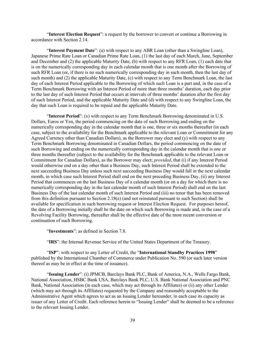39 “Interest Election Request”: a request by the borrower to convert or continue a Borrowing in accordance with Section 2.14. “Interest Payment Date”: (a) with respect to any ABR Loan (other than a Swingline Loan), Japanese Prime Rate Loan or Canadian Prime Rate Loan, (1) the last day of each March, June, September and December and (2) the applicable Maturity Date, (b) with respect to any RFR Loan, (1) each date that is on the numerically corresponding day in each calendar month that is one month after the Borrowing of such RFR Loan (or, if there is no such numerically corresponding day in such month, then the last day of such month) and (2) the applicable Maturity Date, (c) with respect to any Term Benchmark Loan, the last day of each Interest Period applicable to the Borrowing of which such Loan is a part and, in the case of a Term Benchmark Borrowing with an Interest Period of more than three months’ duration, each day prior to the last day of such Interest Period that occurs at intervals of three months’ duration after the first day of such Interest Period, and the applicable Maturity Date and (d) with respect to any Swingline Loan, the day that such Loan is required to be repaid and the applicable Maturity Date. “Interest Period”: (x) with respect to any Term Benchmark Borrowing denominated in U.S. Dollars, Euros or Yen, the period commencing on the date of such Borrowing and ending on the numerically corresponding day in the calendar month that is one, three or six months thereafter (in each case, subject to the availability for the Benchmark applicable to the relevant Loan or Commitment for any Agreed Currency other than Canadian Dollars), as the Borrower may elect and (y) with respect to any Term Benchmark Borrowing denominated in Canadian Dollars, the period commencing on the date of such Borrowing and ending on the numerically corresponding day in the calendar month that is one or three months thereafter (subject to the availability for the Benchmark applicable to the relevant Loan or Commitment for Canadian Dollars), as the Borrower may elect; provided, that (i) if any Interest Period would otherwise end on a day other than a Business Day, such Interest Period shall be extended to the next succeeding Business Day unless such next succeeding Business Day would fall in the next calendar month, in which case such Interest Period shall end on the next preceding Business Day, (ii) any Interest Period that commences on the last Business Day of a calendar month (or on a day for which there is no numerically corresponding day in the last calendar month of such Interest Period) shall end on the last Business Day of the last calendar month of such Interest Period and (iii) no tenor that has been removed from this definition pursuant to Section 2.18(e) (and not reinstated pursuant to such Section) shall be available for specification in such borrowing request or Interest Election Request. For purposes hereof, the date of a Borrowing initially shall be the date on which such Borrowing is made and, in the case of a Revolving Facility Borrowing, thereafter shall be the effective date of the most recent conversion or continuation of such Borrowing. “Investments”: as defined in Section 7.8. “IRS”: the Internal Revenue Service of the United States Department of the Treasury. “ISP”: with respect to any Letter of Credit, the “International Standby Practices 1998” published by the International Chamber of Commerce under Publication No. 590 (or such later version thereof as may be in effect at the time of issuance). “Issuing Lender”: (i) JPMCB, Barclays Bank PLC, Bank of America, N.A., Wells Fargo Bank, National Association, HSBC Bank USA, Barclays Bank PLC, U.S. Bank National Association and PNC Bank, National Association (in each case, which may act through its Affiliates) or (ii) any other Lender (which may act through its Affiliates) requested by the Company and reasonably acceptable to the Administrative Agent which agrees to act as an Issuing Lender hereunder, in each case its capacity as issuer of any Letter of Credit. Each reference herein to “Issuing Lender” shall be deemed to be a reference to the relevant Issuing Lender.