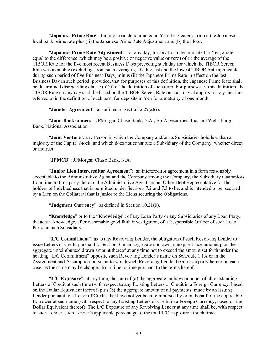 40 “Japanese Prime Rate”: for any Loan denominated in Yen the greater of (a) (i) the Japanese local bank prime rate plus (ii) the Japanese Prime Rate Adjustment and (b) the Floor. “Japanese Prime Rate Adjustment”: for any day, for any Loan denominated in Yen, a rate equal to the difference (which may be a positive or negative value or zero) of (i) the average of the TIBOR Rate for the five most recent Business Days preceding such day for which the TIBOR Screen Rate was available (excluding, from such averaging, the highest and the lowest TIBOR Rate applicable during such period of five Business Days) minus (ii) the Japanese Prime Rate in effect on the last Business Day in such period; provided, that for purposes of this definition, the Japanese Prime Rate shall be determined disregarding clause (a)(ii) of the definition of such term. For purposes of this definition, the TIBOR Rate on any day shall be based on the TIBOR Screen Rate on such day at approximately the time referred to in the definition of such term for deposits in Yen for a maturity of one month. “Joinder Agreement”: as defined in Section 2.29(a)(i). “Joint Bookrunners”: JPMorgan Chase Bank, N.A., BofA Securities, Inc. and Wells Fargo Bank, National Association. “Joint Venture”: any Person in which the Company and/or its Subsidiaries hold less than a majority of the Capital Stock, and which does not constitute a Subsidiary of the Company, whether direct or indirect. “JPMCB”: JPMorgan Chase Bank, N.A. “Junior Lien Intercreditor Agreement”: an intercreditor agreement in a form reasonably acceptable to the Administrative Agent and the Company among the Company, the Subsidiary Guarantors from time to time party thereto, the Administrative Agent and an Other Debt Representative for the holders of Indebtedness that is permitted under Sections 7.2 and 7.3 to be, and is intended to be, secured by a Lien on the Collateral that is junior to the Liens securing the Obligations. “Judgment Currency”: as defined in Section 10.21(b). “Knowledge” or to the “Knowledge”: of any Loan Party or any Subsidiaries of any Loan Party, the actual knowledge, after reasonable good faith investigation, of a Responsible Officer of such Loan Party or such Subsidiary. “L/C Commitment”: as to any Revolving Lender, the obligation of such Revolving Lender to issue Letters of Credit pursuant to Section 3 in an aggregate undrawn, unexpired face amount plus the aggregate unreimbursed drawn amount thereof at any time not to exceed the amount set forth under the heading “L/C Commitment” opposite such Revolving Lender’s name on Schedule 1.1A or in the Assignment and Assumption pursuant to which such Revolving Lender becomes a party hereto, in each case, as the same may be changed from time to time pursuant to the terms hereof. “L/C Exposure”: at any time, the sum of (a) the aggregate undrawn amount of all outstanding Letters of Credit at such time (with respect to any Existing Letters of Credit in a Foreign Currency, based on the Dollar Equivalent thereof) plus (b) the aggregate amount of all payments, made by an Issuing Lender pursuant to a Letter of Credit, that have not yet been reimbursed by or on behalf of the applicable Borrower at such time (with respect to any Existing Letters of Credit in a Foreign Currency, based on the Dollar Equivalent thereof). The L/C Exposure of any Revolving Lender at any time shall be, with respect to such Lender, such Lender’s applicable percentage of the total L/C Exposure at such time.