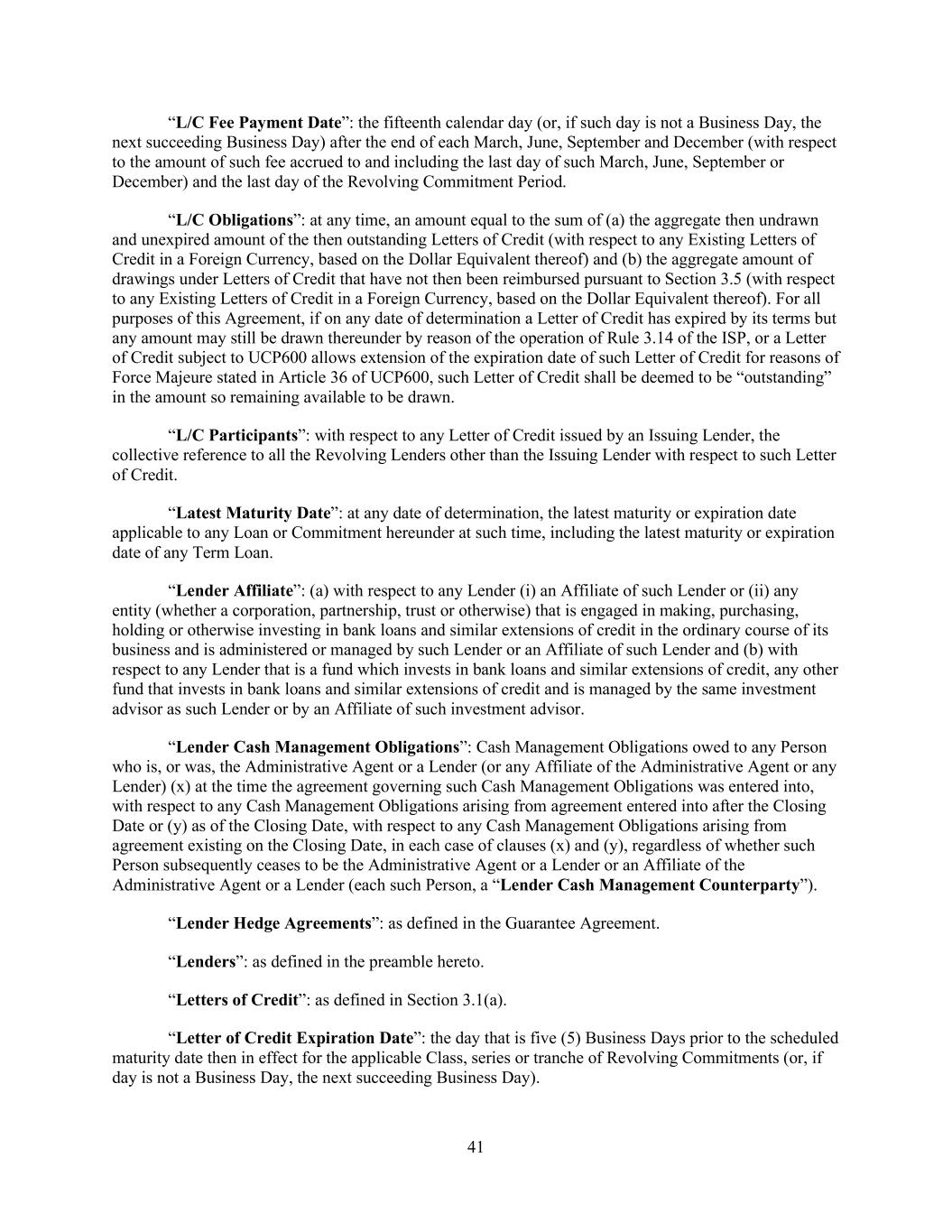 41 “L/C Fee Payment Date”: the fifteenth calendar day (or, if such day is not a Business Day, the next succeeding Business Day) after the end of each March, June, September and December (with respect to the amount of such fee accrued to and including the last day of such March, June, September or December) and the last day of the Revolving Commitment Period. “L/C Obligations”: at any time, an amount equal to the sum of (a) the aggregate then undrawn and unexpired amount of the then outstanding Letters of Credit (with respect to any Existing Letters of Credit in a Foreign Currency, based on the Dollar Equivalent thereof) and (b) the aggregate amount of drawings under Letters of Credit that have not then been reimbursed pursuant to Section 3.5 (with respect to any Existing Letters of Credit in a Foreign Currency, based on the Dollar Equivalent thereof). For all purposes of this Agreement, if on any date of determination a Letter of Credit has expired by its terms but any amount may still be drawn thereunder by reason of the operation of Rule 3.14 of the ISP, or a Letter of Credit subject to UCP600 allows extension of the expiration date of such Letter of Credit for reasons of Force Majeure stated in Article 36 of UCP600, such Letter of Credit shall be deemed to be “outstanding” in the amount so remaining available to be drawn. “L/C Participants”: with respect to any Letter of Credit issued by an Issuing Lender, the collective reference to all the Revolving Lenders other than the Issuing Lender with respect to such Letter of Credit. “Latest Maturity Date”: at any date of determination, the latest maturity or expiration date applicable to any Loan or Commitment hereunder at such time, including the latest maturity or expiration date of any Term Loan. “Lender Affiliate”: (a) with respect to any Lender (i) an Affiliate of such Lender or (ii) any entity (whether a corporation, partnership, trust or otherwise) that is engaged in making, purchasing, holding or otherwise investing in bank loans and similar extensions of credit in the ordinary course of its business and is administered or managed by such Lender or an Affiliate of such Lender and (b) with respect to any Lender that is a fund which invests in bank loans and similar extensions of credit, any other fund that invests in bank loans and similar extensions of credit and is managed by the same investment advisor as such Lender or by an Affiliate of such investment advisor. “Lender Cash Management Obligations”: Cash Management Obligations owed to any Person who is, or was, the Administrative Agent or a Lender (or any Affiliate of the Administrative Agent or any Lender) (x) at the time the agreement governing such Cash Management Obligations was entered into, with respect to any Cash Management Obligations arising from agreement entered into after the Closing Date or (y) as of the Closing Date, with respect to any Cash Management Obligations arising from agreement existing on the Closing Date, in each case of clauses (x) and (y), regardless of whether such Person subsequently ceases to be the Administrative Agent or a Lender or an Affiliate of the Administrative Agent or a Lender (each such Person, a “Lender Cash Management Counterparty”). “Lender Hedge Agreements”: as defined in the Guarantee Agreement. “Lenders”: as defined in the preamble hereto. “Letters of Credit”: as defined in Section 3.1(a). “Letter of Credit Expiration Date”: the day that is five (5) Business Days prior to the scheduled maturity date then in effect for the applicable Class, series or tranche of Revolving Commitments (or, if day is not a Business Day, the next succeeding Business Day).