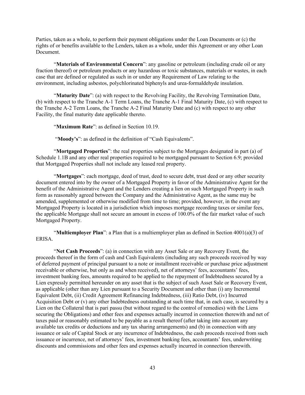 43 Parties, taken as a whole, to perform their payment obligations under the Loan Documents or (c) the rights of or benefits available to the Lenders, taken as a whole, under this Agreement or any other Loan Document. “Materials of Environmental Concern”: any gasoline or petroleum (including crude oil or any fraction thereof) or petroleum products or any hazardous or toxic substances, materials or wastes, in each case that are defined or regulated as such in or under any Requirement of Law relating to the environment, including asbestos, polychlorinated biphenyls and urea-formaldehyde insulation. “Maturity Date”: (a) with respect to the Revolving Facility, the Revolving Termination Date, (b) with respect to the Tranche A-1 Term Loans, the Tranche A-1 Final Maturity Date, (c) with respect to the Tranche A-2 Term Loans, the Tranche A-2 Final Maturity Date and (c) with respect to any other Facility, the final maturity date applicable thereto. “Maximum Rate”: as defined in Section 10.19. “Moody’s”: as defined in the definition of “Cash Equivalents”. “Mortgaged Properties”: the real properties subject to the Mortgages designated in part (a) of Schedule 1.1B and any other real properties required to be mortgaged pursuant to Section 6.9; provided that Mortgaged Properties shall not include any leased real property. “Mortgages”: each mortgage, deed of trust, deed to secure debt, trust deed or any other security document entered into by the owner of a Mortgaged Property in favor of the Administrative Agent for the benefit of the Administrative Agent and the Lenders creating a lien on such Mortgaged Property in such form as reasonably agreed between the Company and the Administrative Agent, as the same may be amended, supplemented or otherwise modified from time to time; provided, however, in the event any Mortgaged Property is located in a jurisdiction which imposes mortgage recording taxes or similar fees, the applicable Mortgage shall not secure an amount in excess of 100.0% of the fair market value of such Mortgaged Property. “Multiemployer Plan”: a Plan that is a multiemployer plan as defined in Section 4001(a)(3) of ERISA. “Net Cash Proceeds”: (a) in connection with any Asset Sale or any Recovery Event, the proceeds thereof in the form of cash and Cash Equivalents (including any such proceeds received by way of deferred payment of principal pursuant to a note or installment receivable or purchase price adjustment receivable or otherwise, but only as and when received), net of attorneys’ fees, accountants’ fees, investment banking fees, amounts required to be applied to the repayment of Indebtedness secured by a Lien expressly permitted hereunder on any asset that is the subject of such Asset Sale or Recovery Event, as applicable (other than any Lien pursuant to a Security Document and other than (i) any Incremental Equivalent Debt, (ii) Credit Agreement Refinancing Indebtedness, (iii) Ratio Debt, (iv) Incurred Acquisition Debt or (v) any other Indebtedness outstanding at such time that, in each case, is secured by a Lien on the Collateral that is pari passu (but without regard to the control of remedies) with the Liens securing the Obligations) and other fees and expenses actually incurred in connection therewith and net of taxes paid or reasonably estimated to be payable as a result thereof (after taking into account any available tax credits or deductions and any tax sharing arrangements) and (b) in connection with any issuance or sale of Capital Stock or any incurrence of Indebtedness, the cash proceeds received from such issuance or incurrence, net of attorneys’ fees, investment banking fees, accountants’ fees, underwriting discounts and commissions and other fees and expenses actually incurred in connection therewith.
