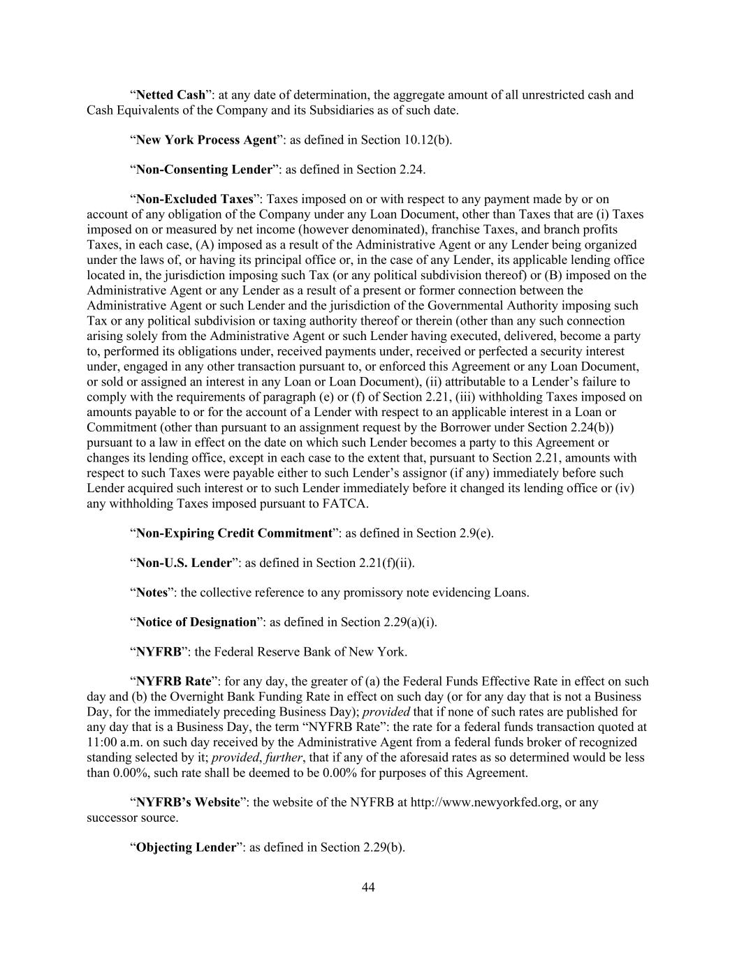 44 “Netted Cash”: at any date of determination, the aggregate amount of all unrestricted cash and Cash Equivalents of the Company and its Subsidiaries as of such date. “New York Process Agent”: as defined in Section 10.12(b). “Non-Consenting Lender”: as defined in Section 2.24. “Non-Excluded Taxes”: Taxes imposed on or with respect to any payment made by or on account of any obligation of the Company under any Loan Document, other than Taxes that are (i) Taxes imposed on or measured by net income (however denominated), franchise Taxes, and branch profits Taxes, in each case, (A) imposed as a result of the Administrative Agent or any Lender being organized under the laws of, or having its principal office or, in the case of any Lender, its applicable lending office located in, the jurisdiction imposing such Tax (or any political subdivision thereof) or (B) imposed on the Administrative Agent or any Lender as a result of a present or former connection between the Administrative Agent or such Lender and the jurisdiction of the Governmental Authority imposing such Tax or any political subdivision or taxing authority thereof or therein (other than any such connection arising solely from the Administrative Agent or such Lender having executed, delivered, become a party to, performed its obligations under, received payments under, received or perfected a security interest under, engaged in any other transaction pursuant to, or enforced this Agreement or any Loan Document, or sold or assigned an interest in any Loan or Loan Document), (ii) attributable to a Lender’s failure to comply with the requirements of paragraph (e) or (f) of Section 2.21, (iii) withholding Taxes imposed on amounts payable to or for the account of a Lender with respect to an applicable interest in a Loan or Commitment (other than pursuant to an assignment request by the Borrower under Section 2.24(b)) pursuant to a law in effect on the date on which such Lender becomes a party to this Agreement or changes its lending office, except in each case to the extent that, pursuant to Section 2.21, amounts with respect to such Taxes were payable either to such Lender’s assignor (if any) immediately before such Lender acquired such interest or to such Lender immediately before it changed its lending office or (iv) any withholding Taxes imposed pursuant to FATCA. “Non-Expiring Credit Commitment”: as defined in Section 2.9(e). “Non-U.S. Lender”: as defined in Section 2.21(f)(ii). “Notes”: the collective reference to any promissory note evidencing Loans. “Notice of Designation”: as defined in Section 2.29(a)(i). “NYFRB”: the Federal Reserve Bank of New York. “NYFRB Rate”: for any day, the greater of (a) the Federal Funds Effective Rate in effect on such day and (b) the Overnight Bank Funding Rate in effect on such day (or for any day that is not a Business Day, for the immediately preceding Business Day); provided that if none of such rates are published for any day that is a Business Day, the term “NYFRB Rate”: the rate for a federal funds transaction quoted at 11:00 a.m. on such day received by the Administrative Agent from a federal funds broker of recognized standing selected by it; provided, further, that if any of the aforesaid rates as so determined would be less than 0.00%, such rate shall be deemed to be 0.00% for purposes of this Agreement. “NYFRB’s Website”: the website of the NYFRB at http://www.newyorkfed.org, or any successor source. “Objecting Lender”: as defined in Section 2.29(b).