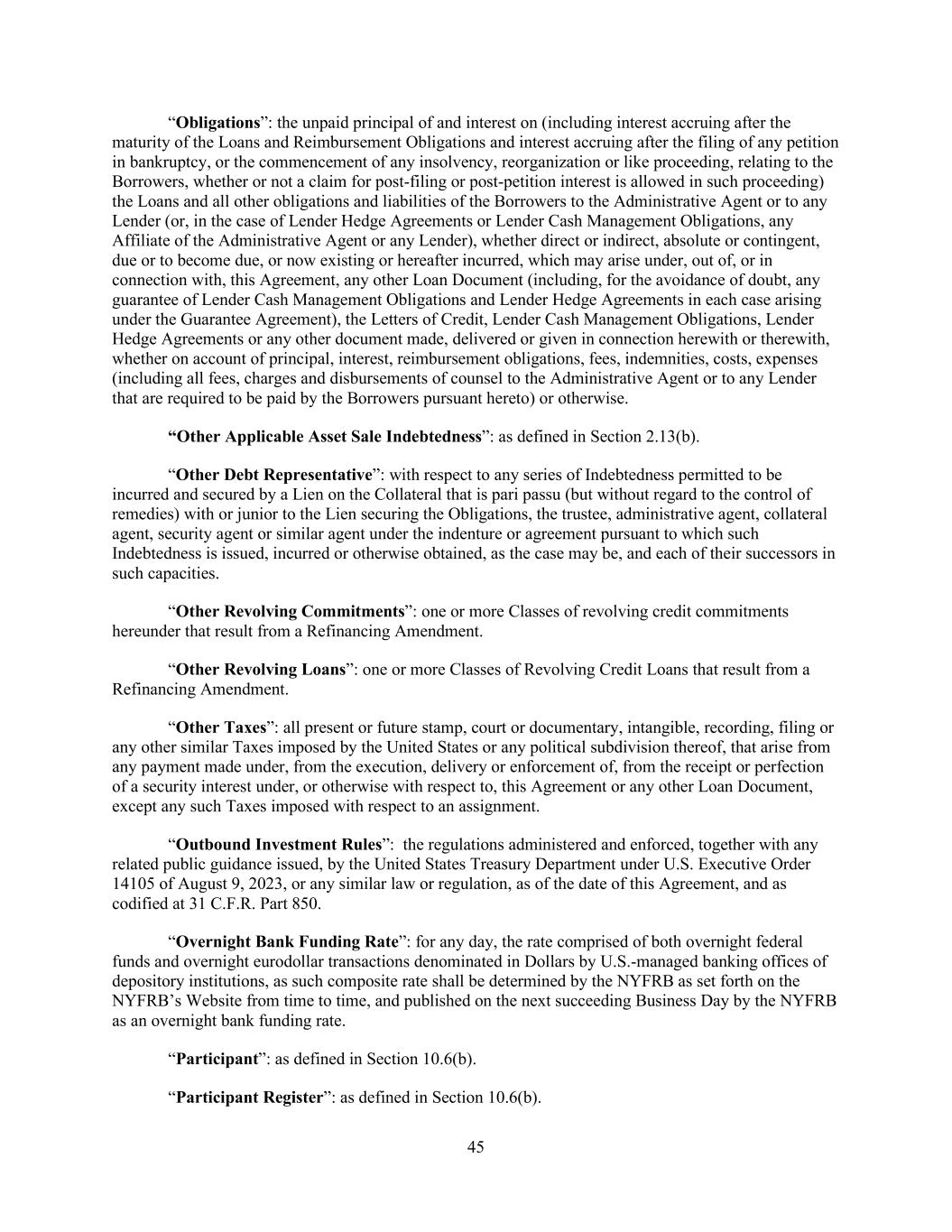 45 “Obligations”: the unpaid principal of and interest on (including interest accruing after the maturity of the Loans and Reimbursement Obligations and interest accruing after the filing of any petition in bankruptcy, or the commencement of any insolvency, reorganization or like proceeding, relating to the Borrowers, whether or not a claim for post-filing or post-petition interest is allowed in such proceeding) the Loans and all other obligations and liabilities of the Borrowers to the Administrative Agent or to any Lender (or, in the case of Lender Hedge Agreements or Lender Cash Management Obligations, any Affiliate of the Administrative Agent or any Lender), whether direct or indirect, absolute or contingent, due or to become due, or now existing or hereafter incurred, which may arise under, out of, or in connection with, this Agreement, any other Loan Document (including, for the avoidance of doubt, any guarantee of Lender Cash Management Obligations and Lender Hedge Agreements in each case arising under the Guarantee Agreement), the Letters of Credit, Lender Cash Management Obligations, Lender Hedge Agreements or any other document made, delivered or given in connection herewith or therewith, whether on account of principal, interest, reimbursement obligations, fees, indemnities, costs, expenses (including all fees, charges and disbursements of counsel to the Administrative Agent or to any Lender that are required to be paid by the Borrowers pursuant hereto) or otherwise. “Other Applicable Asset Sale Indebtedness”: as defined in Section 2.13(b). “Other Debt Representative”: with respect to any series of Indebtedness permitted to be incurred and secured by a Lien on the Collateral that is pari passu (but without regard to the control of remedies) with or junior to the Lien securing the Obligations, the trustee, administrative agent, collateral agent, security agent or similar agent under the indenture or agreement pursuant to which such Indebtedness is issued, incurred or otherwise obtained, as the case may be, and each of their successors in such capacities. “Other Revolving Commitments”: one or more Classes of revolving credit commitments hereunder that result from a Refinancing Amendment. “Other Revolving Loans”: one or more Classes of Revolving Credit Loans that result from a Refinancing Amendment. “Other Taxes”: all present or future stamp, court or documentary, intangible, recording, filing or any other similar Taxes imposed by the United States or any political subdivision thereof, that arise from any payment made under, from the execution, delivery or enforcement of, from the receipt or perfection of a security interest under, or otherwise with respect to, this Agreement or any other Loan Document, except any such Taxes imposed with respect to an assignment. “Outbound Investment Rules”: the regulations administered and enforced, together with any related public guidance issued, by the United States Treasury Department under U.S. Executive Order 14105 of August 9, 2023, or any similar law or regulation, as of the date of this Agreement, and as codified at 31 C.F.R. Part 850. “Overnight Bank Funding Rate”: for any day, the rate comprised of both overnight federal funds and overnight eurodollar transactions denominated in Dollars by U.S.-managed banking offices of depository institutions, as such composite rate shall be determined by the NYFRB as set forth on the NYFRB’s Website from time to time, and published on the next succeeding Business Day by the NYFRB as an overnight bank funding rate. “Participant”: as defined in Section 10.6(b). “Participant Register”: as defined in Section 10.6(b).