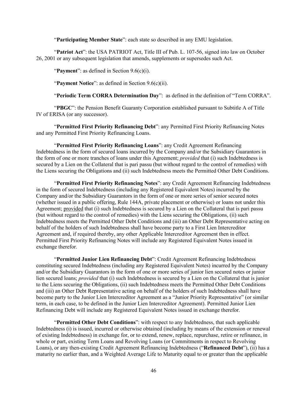 46 “Participating Member State”: each state so described in any EMU legislation. “Patriot Act”: the USA PATRIOT Act, Title III of Pub. L. 107-56, signed into law on October 26, 2001 or any subsequent legislation that amends, supplements or supersedes such Act. “Payment”: as defined in Section 9.6(c)(i). “Payment Notice”: as defined in Section 9.6(c)(ii). “Periodic Term CORRA Determination Day”: as defined in the definition of “Term CORRA”. “PBGC”: the Pension Benefit Guaranty Corporation established pursuant to Subtitle A of Title IV of ERISA (or any successor). “Permitted First Priority Refinancing Debt”: any Permitted First Priority Refinancing Notes and any Permitted First Priority Refinancing Loans. “Permitted First Priority Refinancing Loans”: any Credit Agreement Refinancing Indebtedness in the form of secured loans incurred by the Company and/or the Subsidiary Guarantors in the form of one or more tranches of loans under this Agreement; provided that (i) such Indebtedness is secured by a Lien on the Collateral that is pari passu (but without regard to the control of remedies) with the Liens securing the Obligations and (ii) such Indebtedness meets the Permitted Other Debt Conditions. “Permitted First Priority Refinancing Notes”: any Credit Agreement Refinancing Indebtedness in the form of secured Indebtedness (including any Registered Equivalent Notes) incurred by the Company and/or the Subsidiary Guarantors in the form of one or more series of senior secured notes (whether issued in a public offering, Rule 144A, private placement or otherwise) or loans not under this Agreement; provided that (i) such Indebtedness is secured by a Lien on the Collateral that is pari passu (but without regard to the control of remedies) with the Liens securing the Obligations, (ii) such Indebtedness meets the Permitted Other Debt Conditions and (iii) an Other Debt Representative acting on behalf of the holders of such Indebtedness shall have become party to a First Lien Intercreditor Agreement and, if required thereby, any other Applicable Intercreditor Agreement then in effect. Permitted First Priority Refinancing Notes will include any Registered Equivalent Notes issued in exchange therefor. “Permitted Junior Lien Refinancing Debt”: Credit Agreement Refinancing Indebtedness constituting secured Indebtedness (including any Registered Equivalent Notes) incurred by the Company and/or the Subsidiary Guarantors in the form of one or more series of junior lien secured notes or junior lien secured loans; provided that (i) such Indebtedness is secured by a Lien on the Collateral that is junior to the Liens securing the Obligations, (ii) such Indebtedness meets the Permitted Other Debt Conditions and (iii) an Other Debt Representative acting on behalf of the holders of such Indebtedness shall have become party to the Junior Lien Intercreditor Agreement as a “Junior Priority Representative” (or similar term, in each case, to be defined in the Junior Lien Intercreditor Agreement). Permitted Junior Lien Refinancing Debt will include any Registered Equivalent Notes issued in exchange therefor. “Permitted Other Debt Conditions”: with respect to any Indebtedness, that such applicable Indebtedness (i) is issued, incurred or otherwise obtained (including by means of the extension or renewal of existing Indebtedness) in exchange for, or to extend, renew, replace, repurchase, retire or refinance, in whole or part, existing Term Loans and Revolving Loans (or Commitments in respect to Revolving Loans), or any then-existing Credit Agreement Refinancing Indebtedness (“Refinanced Debt”), (ii) has a maturity no earlier than, and a Weighted Average Life to Maturity equal to or greater than the applicable