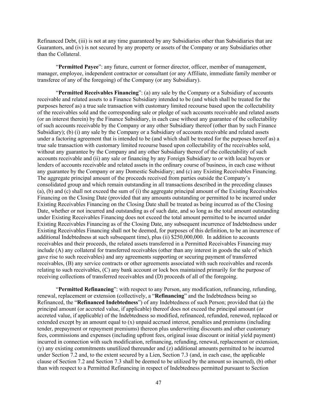 47 Refinanced Debt, (iii) is not at any time guaranteed by any Subsidiaries other than Subsidiaries that are Guarantors, and (iv) is not secured by any property or assets of the Company or any Subsidiaries other than the Collateral. “Permitted Payee”: any future, current or former director, officer, member of management, manager, employee, independent contractor or consultant (or any Affiliate, immediate family member or transferee of any of the foregoing) of the Company (or any Subsidiary). “Permitted Receivables Financing”: (a) any sale by the Company or a Subsidiary of accounts receivable and related assets to a Finance Subsidiary intended to be (and which shall be treated for the purposes hereof as) a true sale transaction with customary limited recourse based upon the collectability of the receivables sold and the corresponding sale or pledge of such accounts receivable and related assets (or an interest therein) by the Finance Subsidiary, in each case without any guarantee of the collectability of such accounts receivable by the Company or any other Subsidiary thereof (other than by such Finance Subsidiary); (b) (i) any sale by the Company or a Subsidiary of accounts receivable and related assets under a factoring agreement that is intended to be (and which shall be treated for the purposes hereof as) a true sale transaction with customary limited recourse based upon collectability of the receivables sold, without any guarantee by the Company and any other Subsidiary thereof of the collectability of such accounts receivable and (ii) any sale or financing by any Foreign Subsidiary to or with local buyers or lenders of accounts receivable and related assets in the ordinary course of business, in each case without any guarantee by the Company or any Domestic Subsidiary; and (c) any Existing Receivables Financing. The aggregate principal amount of the proceeds received from parties outside the Company’s consolidated group and which remain outstanding in all transactions described in the preceding clauses (a), (b) and (c) shall not exceed the sum of (i) the aggregate principal amount of the Existing Receivables Financing on the Closing Date (provided that any amounts outstanding or permitted to be incurred under Existing Receivables Financing on the Closing Date shall be treated as being incurred as of the Closing Date, whether or not incurred and outstanding as of such date, and so long as the total amount outstanding under Existing Receivables Financing does not exceed the total amount permitted to be incurred under Existing Receivables Financing as of the Closing Date, any subsequent incurrence of Indebtedness under Existing Receivables Financing shall not be deemed, for purposes of this definition, to be an incurrence of additional Indebtedness at such subsequent time), plus (ii) $250,000,000. In addition to accounts receivables and their proceeds, the related assets transferred in a Permitted Receivables Financing may include (A) any collateral for transferred receivables (other than any interest in goods the sale of which gave rise to such receivables) and any agreements supporting or securing payment of transferred receivables, (B) any service contracts or other agreements associated with such receivables and records relating to such receivables, (C) any bank account or lock box maintained primarily for the purpose of receiving collections of transferred receivables and (D) proceeds of all of the foregoing. “Permitted Refinancing”: with respect to any Person, any modification, refinancing, refunding, renewal, replacement or extension (collectively, a “Refinancing” and the Indebtedness being so Refinanced, the “Refinanced Indebtedness”) of any Indebtedness of such Person; provided that (a) the principal amount (or accreted value, if applicable) thereof does not exceed the principal amount (or accreted value, if applicable) of the Indebtedness so modified, refinanced, refunded, renewed, replaced or extended except by an amount equal to (x) unpaid accrued interest, penalties and premiums (including tender, prepayment or repayment premiums) thereon plus underwriting discounts and other customary fees, commissions and expenses (including upfront fees, original issue discount or initial yield payment) incurred in connection with such modification, refinancing, refunding, renewal, replacement or extension, (y) any existing commitments unutilized thereunder and (z) additional amounts permitted to be incurred under Section 7.2 and, to the extent secured by a Lien, Section 7.3 (and, in each case, the applicable clause of Section 7.2 and Section 7.3 shall be deemed to be utilized by the amount so incurred), (b) other than with respect to a Permitted Refinancing in respect of Indebtedness permitted pursuant to Section