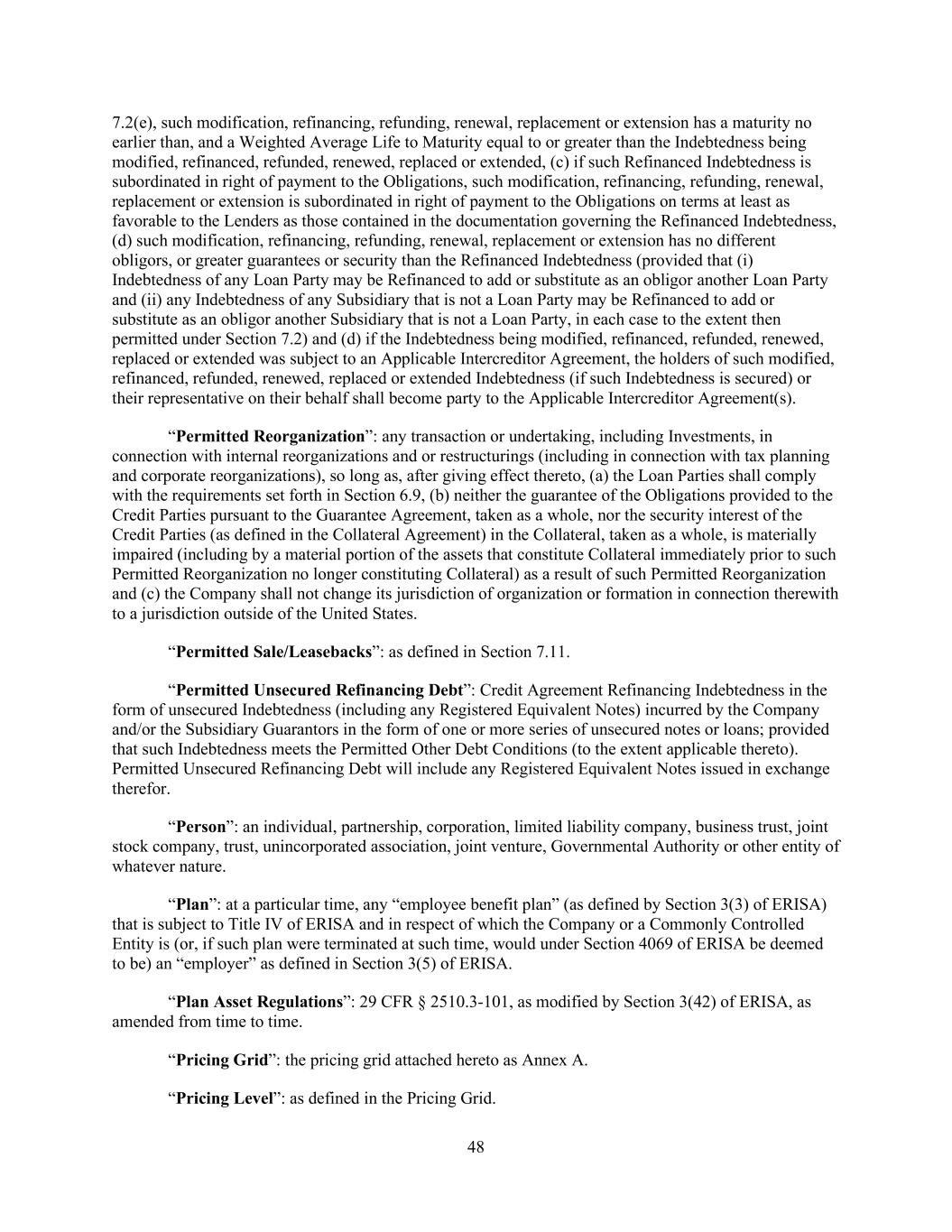 48 7.2(e), such modification, refinancing, refunding, renewal, replacement or extension has a maturity no earlier than, and a Weighted Average Life to Maturity equal to or greater than the Indebtedness being modified, refinanced, refunded, renewed, replaced or extended, (c) if such Refinanced Indebtedness is subordinated in right of payment to the Obligations, such modification, refinancing, refunding, renewal, replacement or extension is subordinated in right of payment to the Obligations on terms at least as favorable to the Lenders as those contained in the documentation governing the Refinanced Indebtedness, (d) such modification, refinancing, refunding, renewal, replacement or extension has no different obligors, or greater guarantees or security than the Refinanced Indebtedness (provided that (i) Indebtedness of any Loan Party may be Refinanced to add or substitute as an obligor another Loan Party and (ii) any Indebtedness of any Subsidiary that is not a Loan Party may be Refinanced to add or substitute as an obligor another Subsidiary that is not a Loan Party, in each case to the extent then permitted under Section 7.2) and (d) if the Indebtedness being modified, refinanced, refunded, renewed, replaced or extended was subject to an Applicable Intercreditor Agreement, the holders of such modified, refinanced, refunded, renewed, replaced or extended Indebtedness (if such Indebtedness is secured) or their representative on their behalf shall become party to the Applicable Intercreditor Agreement(s). “Permitted Reorganization”: any transaction or undertaking, including Investments, in connection with internal reorganizations and or restructurings (including in connection with tax planning and corporate reorganizations), so long as, after giving effect thereto, (a) the Loan Parties shall comply with the requirements set forth in Section 6.9, (b) neither the guarantee of the Obligations provided to the Credit Parties pursuant to the Guarantee Agreement, taken as a whole, nor the security interest of the Credit Parties (as defined in the Collateral Agreement) in the Collateral, taken as a whole, is materially impaired (including by a material portion of the assets that constitute Collateral immediately prior to such Permitted Reorganization no longer constituting Collateral) as a result of such Permitted Reorganization and (c) the Company shall not change its jurisdiction of organization or formation in connection therewith to a jurisdiction outside of the United States. “Permitted Sale/Leasebacks”: as defined in Section 7.11. “Permitted Unsecured Refinancing Debt”: Credit Agreement Refinancing Indebtedness in the form of unsecured Indebtedness (including any Registered Equivalent Notes) incurred by the Company and/or the Subsidiary Guarantors in the form of one or more series of unsecured notes or loans; provided that such Indebtedness meets the Permitted Other Debt Conditions (to the extent applicable thereto). Permitted Unsecured Refinancing Debt will include any Registered Equivalent Notes issued in exchange therefor. “Person”: an individual, partnership, corporation, limited liability company, business trust, joint stock company, trust, unincorporated association, joint venture, Governmental Authority or other entity of whatever nature. “Plan”: at a particular time, any “employee benefit plan” (as defined by Section 3(3) of ERISA) that is subject to Title IV of ERISA and in respect of which the Company or a Commonly Controlled Entity is (or, if such plan were terminated at such time, would under Section 4069 of ERISA be deemed to be) an “employer” as defined in Section 3(5) of ERISA. “Plan Asset Regulations”: 29 CFR § 2510.3-101, as modified by Section 3(42) of ERISA, as amended from time to time. “Pricing Grid”: the pricing grid attached hereto as Annex A. “Pricing Level”: as defined in the Pricing Grid.