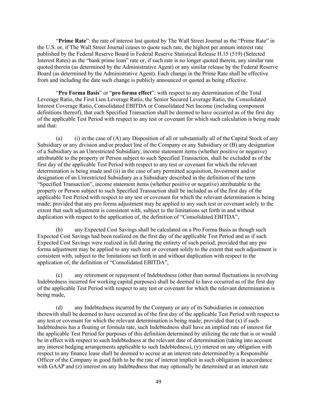 49 “Prime Rate”: the rate of interest last quoted by The Wall Street Journal as the “Prime Rate” in the U.S. or, if The Wall Street Journal ceases to quote such rate, the highest per annum interest rate published by the Federal Reserve Board in Federal Reserve Statistical Release H.15 (519) (Selected Interest Rates) as the “bank prime loan” rate or, if such rate is no longer quoted therein, any similar rate quoted therein (as determined by the Administrative Agent) or any similar release by the Federal Reserve Board (as determined by the Administrative Agent). Each change in the Prime Rate shall be effective from and including the date such change is publicly announced or quoted as being effective. “Pro Forma Basis” or “pro forma effect”: with respect to any determination of the Total Leverage Ratio, the First Lien Leverage Ratio, the Senior Secured Leverage Ratio, the Consolidated Interest Coverage Ratio, Consolidated EBITDA or Consolidated Net Income (including component definitions thereof), that each Specified Transaction shall be deemed to have occurred as of the first day of the applicable Test Period with respect to any test or covenant for which such calculation is being made and that: (a) (i) in the case of (A) any Disposition of all or substantially all of the Capital Stock of any Subsidiary or any division and/or product line of the Company or any Subsidiary or (B) any designation of a Subsidiary as an Unrestricted Subsidiary, income statement items (whether positive or negative) attributable to the property or Person subject to such Specified Transaction, shall be excluded as of the first day of the applicable Test Period with respect to any test or covenant for which the relevant determination is being made and (ii) in the case of any permitted acquisition, Investment and/or designation of an Unrestricted Subsidiary as a Subsidiary described in the definition of the term “Specified Transaction”, income statement items (whether positive or negative) attributable to the property or Person subject to such Specified Transaction shall be included as of the first day of the applicable Test Period with respect to any test or covenant for which the relevant determination is being made; provided that any pro forma adjustment may be applied to any such test or covenant solely to the extent that such adjustment is consistent with, subject to the limitations set forth in and without duplication with respect to the application of, the definition of “Consolidated EBITDA”, (b) any Expected Cost Savings shall be calculated on a Pro Forma Basis as though such Expected Cost Savings had been realized on the first day of the applicable Test Period and as if such Expected Cost Savings were realized in full during the entirety of such period; provided that any pro forma adjustment may be applied to any such test or covenant solely to the extent that such adjustment is consistent with, subject to the limitations set forth in and without duplication with respect to the application of, the definition of “Consolidated EBITDA”, (c) any retirement or repayment of Indebtedness (other than normal fluctuations in revolving Indebtedness incurred for working capital purposes) shall be deemed to have occurred as of the first day of the applicable Test Period with respect to any test or covenant for which the relevant determination is being made, (d) any Indebtedness incurred by the Company or any of its Subsidiaries in connection therewith shall be deemed to have occurred as of the first day of the applicable Test Period with respect to any test or covenant for which the relevant determination is being made; provided that (x) if such Indebtedness has a floating or formula rate, such Indebtedness shall have an implied rate of interest for the applicable Test Period for purposes of this definition determined by utilizing the rate that is or would be in effect with respect to such Indebtedness at the relevant date of determination (taking into account any interest hedging arrangements applicable to such Indebtedness), (y) interest on any obligation with respect to any finance lease shall be deemed to accrue at an interest rate determined by a Responsible Officer of the Company in good faith to be the rate of interest implicit in such obligation in accordance with GAAP and (z) interest on any Indebtedness that may optionally be determined at an interest rate