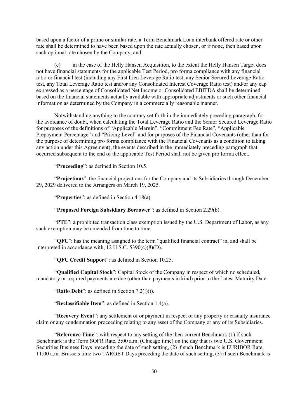 50 based upon a factor of a prime or similar rate, a Term Benchmark Loan interbank offered rate or other rate shall be determined to have been based upon the rate actually chosen, or if none, then based upon such optional rate chosen by the Company, and (e) in the case of the Helly Hansen Acquisition, to the extent the Helly Hansen Target does not have financial statements for the applicable Test Period, pro forma compliance with any financial ratio or financial test (including any First Lien Leverage Ratio test, any Senior Secured Leverage Ratio test, any Total Leverage Ratio test and/or any Consolidated Interest Coverage Ratio test) and/or any cap expressed as a percentage of Consolidated Net Income or Consolidated EBITDA shall be determined based on the financial statements actually available with appropriate adjustments or such other financial information as determined by the Company in a commercially reasonable manner. Notwithstanding anything to the contrary set forth in the immediately preceding paragraph, for the avoidance of doubt, when calculating the Total Leverage Ratio and the Senior Secured Leverage Ratio for purposes of the definitions of “Applicable Margin”, “Commitment Fee Rate”, “Applicable Prepayment Percentage” and “Pricing Level” and for purposes of the Financial Covenants (other than for the purpose of determining pro forma compliance with the Financial Covenants as a condition to taking any action under this Agreement), the events described in the immediately preceding paragraph that occurred subsequent to the end of the applicable Test Period shall not be given pro forma effect. “Proceeding”: as defined in Section 10.5. “Projections”: the financial projections for the Company and its Subsidiaries through December 29, 2029 delivered to the Arrangers on March 19, 2025. “Properties”: as defined in Section 4.18(a). “Proposed Foreign Subsidiary Borrower”: as defined in Section 2.29(b). “PTE”: a prohibited transaction class exemption issued by the U.S. Department of Labor, as any such exemption may be amended from time to time. “QFC”: has the meaning assigned to the term “qualified financial contract” in, and shall be interpreted in accordance with, 12 U.S.C. 5390(c)(8)(D). “QFC Credit Support”: as defined in Section 10.25. “Qualified Capital Stock”: Capital Stock of the Company in respect of which no scheduled, mandatory or required payments are due (other than payments in kind) prior to the Latest Maturity Date. “Ratio Debt”: as defined in Section 7.2(l)(i). “Reclassifiable Item”: as defined in Section 1.4(a). “Recovery Event”: any settlement of or payment in respect of any property or casualty insurance claim or any condemnation proceeding relating to any asset of the Company or any of its Subsidiaries. “Reference Time”: with respect to any setting of the then-current Benchmark (1) if such Benchmark is the Term SOFR Rate, 5:00 a.m. (Chicago time) on the day that is two U.S. Government Securities Business Days preceding the date of such setting, (2) if such Benchmark is EURIBOR Rate, 11:00 a.m. Brussels time two TARGET Days preceding the date of such setting, (3) if such Benchmark is