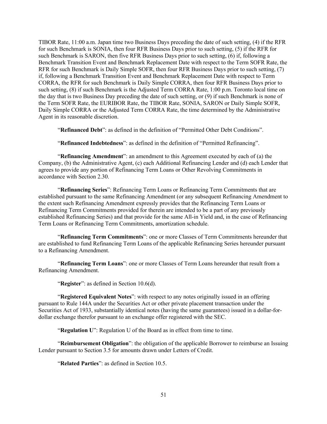 51 TIBOR Rate, 11:00 a.m. Japan time two Business Days preceding the date of such setting, (4) if the RFR for such Benchmark is SONIA, then four RFR Business Days prior to such setting, (5) if the RFR for such Benchmark is SARON, then five RFR Business Days prior to such setting, (6) if, following a Benchmark Transition Event and Benchmark Replacement Date with respect to the Term SOFR Rate, the RFR for such Benchmark is Daily Simple SOFR, then four RFR Business Days prior to such setting, (7) if, following a Benchmark Transition Event and Benchmark Replacement Date with respect to Term CORRA, the RFR for such Benchmark is Daily Simple CORRA, then four RFR Business Days prior to such setting, (8) if such Benchmark is the Adjusted Term CORRA Rate, 1:00 p.m. Toronto local time on the day that is two Business Day preceding the date of such setting, or (9) if such Benchmark is none of the Term SOFR Rate, the EURIBOR Rate, the TIBOR Rate, SONIA, SARON or Daily Simple SOFR, Daily Simple CORRA or the Adjusted Term CORRA Rate, the time determined by the Administrative Agent in its reasonable discretion. “Refinanced Debt”: as defined in the definition of “Permitted Other Debt Conditions”. “Refinanced Indebtedness”: as defined in the definition of “Permitted Refinancing”. “Refinancing Amendment”: an amendment to this Agreement executed by each of (a) the Company, (b) the Administrative Agent, (c) each Additional Refinancing Lender and (d) each Lender that agrees to provide any portion of Refinancing Term Loans or Other Revolving Commitments in accordance with Section 2.30. “Refinancing Series”: Refinancing Term Loans or Refinancing Term Commitments that are established pursuant to the same Refinancing Amendment (or any subsequent Refinancing Amendment to the extent such Refinancing Amendment expressly provides that the Refinancing Term Loans or Refinancing Term Commitments provided for therein are intended to be a part of any previously established Refinancing Series) and that provide for the same All-in Yield and, in the case of Refinancing Term Loans or Refinancing Term Commitments, amortization schedule. “Refinancing Term Commitments”: one or more Classes of Term Commitments hereunder that are established to fund Refinancing Term Loans of the applicable Refinancing Series hereunder pursuant to a Refinancing Amendment. “Refinancing Term Loans”: one or more Classes of Term Loans hereunder that result from a Refinancing Amendment. “Register”: as defined in Section 10.6(d). “Registered Equivalent Notes”: with respect to any notes originally issued in an offering pursuant to Rule 144A under the Securities Act or other private placement transaction under the Securities Act of 1933, substantially identical notes (having the same guarantees) issued in a dollar-for- dollar exchange therefor pursuant to an exchange offer registered with the SEC. “Regulation U”: Regulation U of the Board as in effect from time to time. “Reimbursement Obligation”: the obligation of the applicable Borrower to reimburse an Issuing Lender pursuant to Section 3.5 for amounts drawn under Letters of Credit. “Related Parties”: as defined in Section 10.5.
