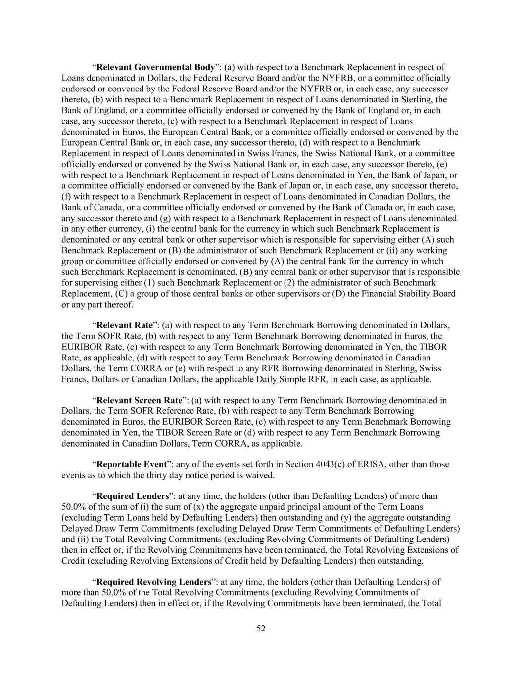 52 “Relevant Governmental Body”: (a) with respect to a Benchmark Replacement in respect of Loans denominated in Dollars, the Federal Reserve Board and/or the NYFRB, or a committee officially endorsed or convened by the Federal Reserve Board and/or the NYFRB or, in each case, any successor thereto, (b) with respect to a Benchmark Replacement in respect of Loans denominated in Sterling, the Bank of England, or a committee officially endorsed or convened by the Bank of England or, in each case, any successor thereto, (c) with respect to a Benchmark Replacement in respect of Loans denominated in Euros, the European Central Bank, or a committee officially endorsed or convened by the European Central Bank or, in each case, any successor thereto, (d) with respect to a Benchmark Replacement in respect of Loans denominated in Swiss Francs, the Swiss National Bank, or a committee officially endorsed or convened by the Swiss National Bank or, in each case, any successor thereto, (e) with respect to a Benchmark Replacement in respect of Loans denominated in Yen, the Bank of Japan, or a committee officially endorsed or convened by the Bank of Japan or, in each case, any successor thereto, (f) with respect to a Benchmark Replacement in respect of Loans denominated in Canadian Dollars, the Bank of Canada, or a committee officially endorsed or convened by the Bank of Canada or, in each case, any successor thereto and (g) with respect to a Benchmark Replacement in respect of Loans denominated in any other currency, (i) the central bank for the currency in which such Benchmark Replacement is denominated or any central bank or other supervisor which is responsible for supervising either (A) such Benchmark Replacement or (B) the administrator of such Benchmark Replacement or (ii) any working group or committee officially endorsed or convened by (A) the central bank for the currency in which such Benchmark Replacement is denominated, (B) any central bank or other supervisor that is responsible for supervising either (1) such Benchmark Replacement or (2) the administrator of such Benchmark Replacement, (C) a group of those central banks or other supervisors or (D) the Financial Stability Board or any part thereof. “Relevant Rate”: (a) with respect to any Term Benchmark Borrowing denominated in Dollars, the Term SOFR Rate, (b) with respect to any Term Benchmark Borrowing denominated in Euros, the EURIBOR Rate, (c) with respect to any Term Benchmark Borrowing denominated in Yen, the TIBOR Rate, as applicable, (d) with respect to any Term Benchmark Borrowing denominated in Canadian Dollars, the Term CORRA or (e) with respect to any RFR Borrowing denominated in Sterling, Swiss Francs, Dollars or Canadian Dollars, the applicable Daily Simple RFR, in each case, as applicable. “Relevant Screen Rate”: (a) with respect to any Term Benchmark Borrowing denominated in Dollars, the Term SOFR Reference Rate, (b) with respect to any Term Benchmark Borrowing denominated in Euros, the EURIBOR Screen Rate, (c) with respect to any Term Benchmark Borrowing denominated in Yen, the TIBOR Screen Rate or (d) with respect to any Term Benchmark Borrowing denominated in Canadian Dollars, Term CORRA, as applicable. “Reportable Event”: any of the events set forth in Section 4043(c) of ERISA, other than those events as to which the thirty day notice period is waived. “Required Lenders”: at any time, the holders (other than Defaulting Lenders) of more than 50.0% of the sum of (i) the sum of (x) the aggregate unpaid principal amount of the Term Loans (excluding Term Loans held by Defaulting Lenders) then outstanding and (y) the aggregate outstanding Delayed Draw Term Commitments (excluding Delayed Draw Term Commitments of Defaulting Lenders) and (ii) the Total Revolving Commitments (excluding Revolving Commitments of Defaulting Lenders) then in effect or, if the Revolving Commitments have been terminated, the Total Revolving Extensions of Credit (excluding Revolving Extensions of Credit held by Defaulting Lenders) then outstanding. “Required Revolving Lenders”: at any time, the holders (other than Defaulting Lenders) of more than 50.0% of the Total Revolving Commitments (excluding Revolving Commitments of Defaulting Lenders) then in effect or, if the Revolving Commitments have been terminated, the Total