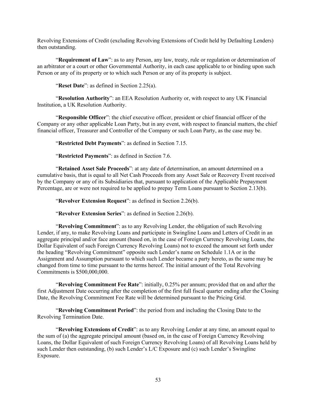 53 Revolving Extensions of Credit (excluding Revolving Extensions of Credit held by Defaulting Lenders) then outstanding. “Requirement of Law”: as to any Person, any law, treaty, rule or regulation or determination of an arbitrator or a court or other Governmental Authority, in each case applicable to or binding upon such Person or any of its property or to which such Person or any of its property is subject. “Reset Date”: as defined in Section 2.25(a). “Resolution Authority”: an EEA Resolution Authority or, with respect to any UK Financial Institution, a UK Resolution Authority. “Responsible Officer”: the chief executive officer, president or chief financial officer of the Company or any other applicable Loan Party, but in any event, with respect to financial matters, the chief financial officer, Treasurer and Controller of the Company or such Loan Party, as the case may be. “Restricted Debt Payments”: as defined in Section 7.15. “Restricted Payments”: as defined in Section 7.6. “Retained Asset Sale Proceeds”: at any date of determination, an amount determined on a cumulative basis, that is equal to all Net Cash Proceeds from any Asset Sale or Recovery Event received by the Company or any of its Subsidiaries that, pursuant to application of the Applicable Prepayment Percentage, are or were not required to be applied to prepay Term Loans pursuant to Section 2.13(b). “Revolver Extension Request”: as defined in Section 2.26(b). “Revolver Extension Series”: as defined in Section 2.26(b). “Revolving Commitment”: as to any Revolving Lender, the obligation of such Revolving Lender, if any, to make Revolving Loans and participate in Swingline Loans and Letters of Credit in an aggregate principal and/or face amount (based on, in the case of Foreign Currency Revolving Loans, the Dollar Equivalent of such Foreign Currency Revolving Loans) not to exceed the amount set forth under the heading “Revolving Commitment” opposite such Lender’s name on Schedule 1.1A or in the Assignment and Assumption pursuant to which such Lender became a party hereto, as the same may be changed from time to time pursuant to the terms hereof. The initial amount of the Total Revolving Commitments is $500,000,000. “Revolving Commitment Fee Rate”: initially, 0.25% per annum; provided that on and after the first Adjustment Date occurring after the completion of the first full fiscal quarter ending after the Closing Date, the Revolving Commitment Fee Rate will be determined pursuant to the Pricing Grid. “Revolving Commitment Period”: the period from and including the Closing Date to the Revolving Termination Date. “Revolving Extensions of Credit”: as to any Revolving Lender at any time, an amount equal to the sum of (a) the aggregate principal amount (based on, in the case of Foreign Currency Revolving Loans, the Dollar Equivalent of such Foreign Currency Revolving Loans) of all Revolving Loans held by such Lender then outstanding, (b) such Lender’s L/C Exposure and (c) such Lender’s Swingline Exposure.
