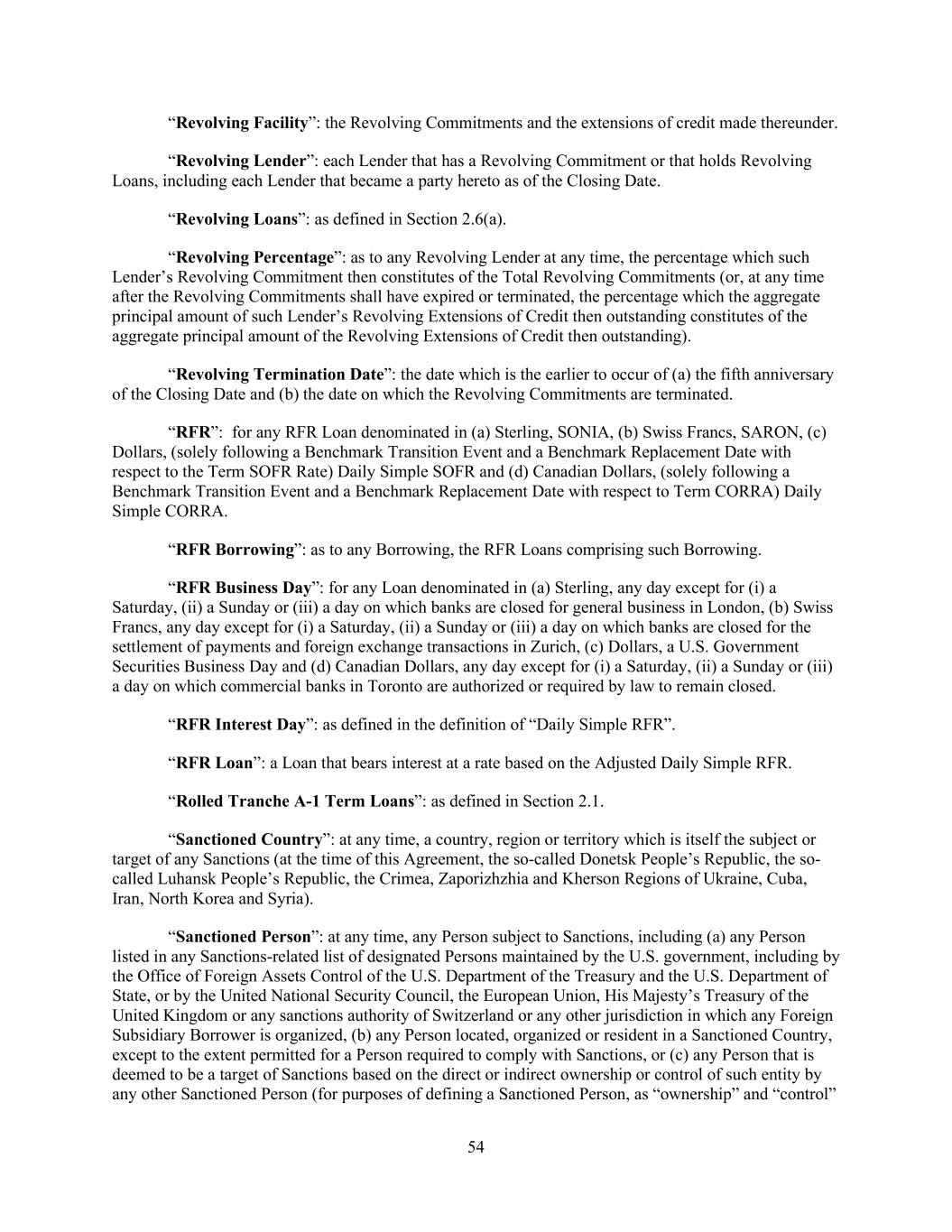 54 “Revolving Facility”: the Revolving Commitments and the extensions of credit made thereunder. “Revolving Lender”: each Lender that has a Revolving Commitment or that holds Revolving Loans, including each Lender that became a party hereto as of the Closing Date. “Revolving Loans”: as defined in Section 2.6(a). “Revolving Percentage”: as to any Revolving Lender at any time, the percentage which such Lender’s Revolving Commitment then constitutes of the Total Revolving Commitments (or, at any time after the Revolving Commitments shall have expired or terminated, the percentage which the aggregate principal amount of such Lender’s Revolving Extensions of Credit then outstanding constitutes of the aggregate principal amount of the Revolving Extensions of Credit then outstanding). “Revolving Termination Date”: the date which is the earlier to occur of (a) the fifth anniversary of the Closing Date and (b) the date on which the Revolving Commitments are terminated. “RFR”: for any RFR Loan denominated in (a) Sterling, SONIA, (b) Swiss Francs, SARON, (c) Dollars, (solely following a Benchmark Transition Event and a Benchmark Replacement Date with respect to the Term SOFR Rate) Daily Simple SOFR and (d) Canadian Dollars, (solely following a Benchmark Transition Event and a Benchmark Replacement Date with respect to Term CORRA) Daily Simple CORRA. “RFR Borrowing”: as to any Borrowing, the RFR Loans comprising such Borrowing. “RFR Business Day”: for any Loan denominated in (a) Sterling, any day except for (i) a Saturday, (ii) a Sunday or (iii) a day on which banks are closed for general business in London, (b) Swiss Francs, any day except for (i) a Saturday, (ii) a Sunday or (iii) a day on which banks are closed for the settlement of payments and foreign exchange transactions in Zurich, (c) Dollars, a U.S. Government Securities Business Day and (d) Canadian Dollars, any day except for (i) a Saturday, (ii) a Sunday or (iii) a day on which commercial banks in Toronto are authorized or required by law to remain closed. “RFR Interest Day”: as defined in the definition of “Daily Simple RFR”. “RFR Loan”: a Loan that bears interest at a rate based on the Adjusted Daily Simple RFR. “Rolled Tranche A-1 Term Loans”: as defined in Section 2.1. “Sanctioned Country”: at any time, a country, region or territory which is itself the subject or target of any Sanctions (at the time of this Agreement, the so-called Donetsk People’s Republic, the so- called Luhansk People’s Republic, the Crimea, Zaporizhzhia and Kherson Regions of Ukraine, Cuba, Iran, North Korea and Syria). “Sanctioned Person”: at any time, any Person subject to Sanctions, including (a) any Person listed in any Sanctions-related list of designated Persons maintained by the U.S. government, including by the Office of Foreign Assets Control of the U.S. Department of the Treasury and the U.S. Department of State, or by the United National Security Council, the European Union, His Majesty’s Treasury of the United Kingdom or any sanctions authority of Switzerland or any other jurisdiction in which any Foreign Subsidiary Borrower is organized, (b) any Person located, organized or resident in a Sanctioned Country, except to the extent permitted for a Person required to comply with Sanctions, or (c) any Person that is deemed to be a target of Sanctions based on the direct or indirect ownership or control of such entity by any other Sanctioned Person (for purposes of defining a Sanctioned Person, as “ownership” and “control”