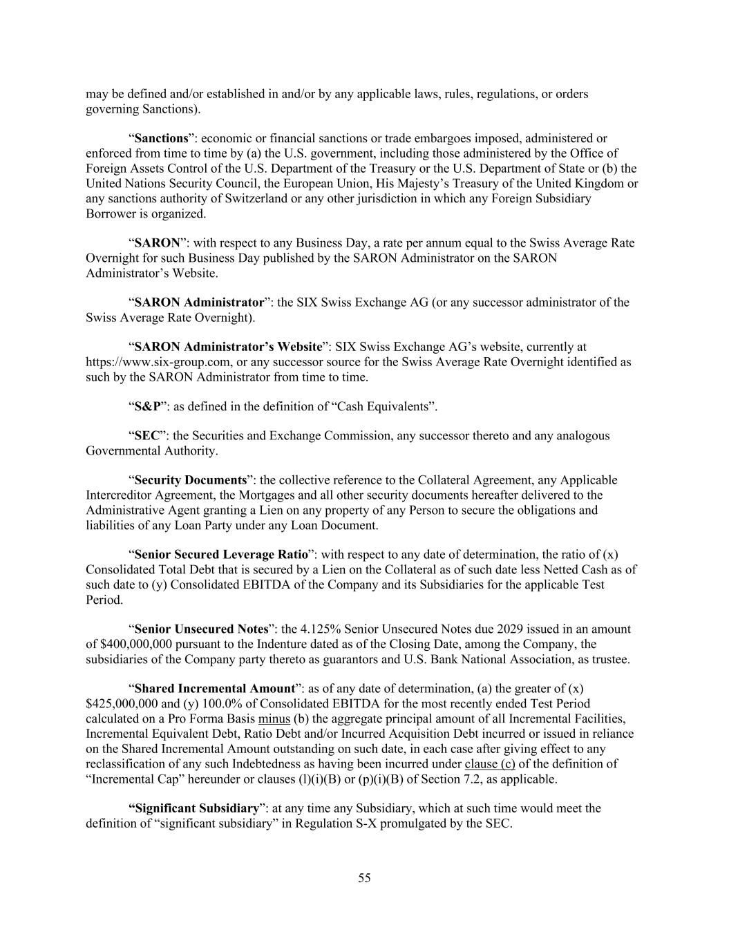 55 may be defined and/or established in and/or by any applicable laws, rules, regulations, or orders governing Sanctions). “Sanctions”: economic or financial sanctions or trade embargoes imposed, administered or enforced from time to time by (a) the U.S. government, including those administered by the Office of Foreign Assets Control of the U.S. Department of the Treasury or the U.S. Department of State or (b) the United Nations Security Council, the European Union, His Majesty’s Treasury of the United Kingdom or any sanctions authority of Switzerland or any other jurisdiction in which any Foreign Subsidiary Borrower is organized. “SARON”: with respect to any Business Day, a rate per annum equal to the Swiss Average Rate Overnight for such Business Day published by the SARON Administrator on the SARON Administrator’s Website. “SARON Administrator”: the SIX Swiss Exchange AG (or any successor administrator of the Swiss Average Rate Overnight). “SARON Administrator’s Website”: SIX Swiss Exchange AG’s website, currently at https://www.six-group.com, or any successor source for the Swiss Average Rate Overnight identified as such by the SARON Administrator from time to time. “S&P”: as defined in the definition of “Cash Equivalents”. “SEC”: the Securities and Exchange Commission, any successor thereto and any analogous Governmental Authority. “Security Documents”: the collective reference to the Collateral Agreement, any Applicable Intercreditor Agreement, the Mortgages and all other security documents hereafter delivered to the Administrative Agent granting a Lien on any property of any Person to secure the obligations and liabilities of any Loan Party under any Loan Document. “Senior Secured Leverage Ratio”: with respect to any date of determination, the ratio of (x) Consolidated Total Debt that is secured by a Lien on the Collateral as of such date less Netted Cash as of such date to (y) Consolidated EBITDA of the Company and its Subsidiaries for the applicable Test Period. “Senior Unsecured Notes”: the 4.125% Senior Unsecured Notes due 2029 issued in an amount of $400,000,000 pursuant to the Indenture dated as of the Closing Date, among the Company, the subsidiaries of the Company party thereto as guarantors and U.S. Bank National Association, as trustee. “Shared Incremental Amount”: as of any date of determination, (a) the greater of (x) $425,000,000 and (y) 100.0% of Consolidated EBITDA for the most recently ended Test Period calculated on a Pro Forma Basis minus (b) the aggregate principal amount of all Incremental Facilities, Incremental Equivalent Debt, Ratio Debt and/or Incurred Acquisition Debt incurred or issued in reliance on the Shared Incremental Amount outstanding on such date, in each case after giving effect to any reclassification of any such Indebtedness as having been incurred under clause (c) of the definition of “Incremental Cap” hereunder or clauses (l)(i)(B) or (p)(i)(B) of Section 7.2, as applicable. “Significant Subsidiary”: at any time any Subsidiary, which at such time would meet the definition of “significant subsidiary” in Regulation S-X promulgated by the SEC.