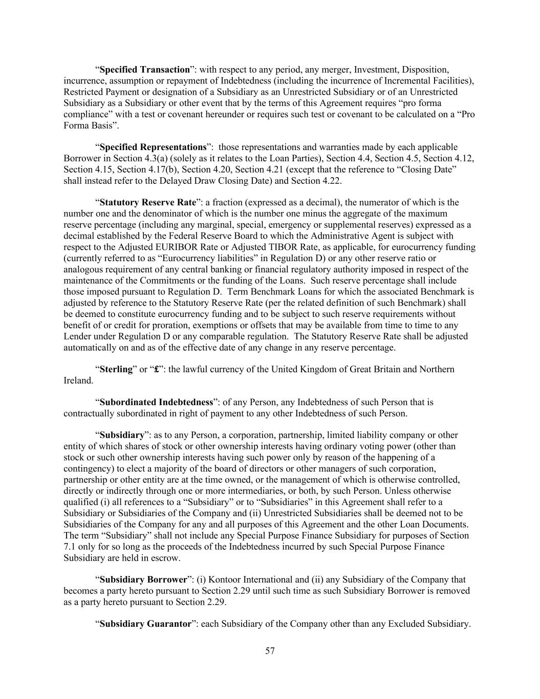 57 “Specified Transaction”: with respect to any period, any merger, Investment, Disposition, incurrence, assumption or repayment of Indebtedness (including the incurrence of Incremental Facilities), Restricted Payment or designation of a Subsidiary as an Unrestricted Subsidiary or of an Unrestricted Subsidiary as a Subsidiary or other event that by the terms of this Agreement requires “pro forma compliance” with a test or covenant hereunder or requires such test or covenant to be calculated on a “Pro Forma Basis”. “Specified Representations”: those representations and warranties made by each applicable Borrower in Section 4.3(a) (solely as it relates to the Loan Parties), Section 4.4, Section 4.5, Section 4.12, Section 4.15, Section 4.17(b), Section 4.20, Section 4.21 (except that the reference to “Closing Date” shall instead refer to the Delayed Draw Closing Date) and Section 4.22. “Statutory Reserve Rate”: a fraction (expressed as a decimal), the numerator of which is the number one and the denominator of which is the number one minus the aggregate of the maximum reserve percentage (including any marginal, special, emergency or supplemental reserves) expressed as a decimal established by the Federal Reserve Board to which the Administrative Agent is subject with respect to the Adjusted EURIBOR Rate or Adjusted TIBOR Rate, as applicable, for eurocurrency funding (currently referred to as “Eurocurrency liabilities” in Regulation D) or any other reserve ratio or analogous requirement of any central banking or financial regulatory authority imposed in respect of the maintenance of the Commitments or the funding of the Loans. Such reserve percentage shall include those imposed pursuant to Regulation D. Term Benchmark Loans for which the associated Benchmark is adjusted by reference to the Statutory Reserve Rate (per the related definition of such Benchmark) shall be deemed to constitute eurocurrency funding and to be subject to such reserve requirements without benefit of or credit for proration, exemptions or offsets that may be available from time to time to any Lender under Regulation D or any comparable regulation. The Statutory Reserve Rate shall be adjusted automatically on and as of the effective date of any change in any reserve percentage. “Sterling” or “£”: the lawful currency of the United Kingdom of Great Britain and Northern Ireland. “Subordinated Indebtedness”: of any Person, any Indebtedness of such Person that is contractually subordinated in right of payment to any other Indebtedness of such Person. “Subsidiary”: as to any Person, a corporation, partnership, limited liability company or other entity of which shares of stock or other ownership interests having ordinary voting power (other than stock or such other ownership interests having such power only by reason of the happening of a contingency) to elect a majority of the board of directors or other managers of such corporation, partnership or other entity are at the time owned, or the management of which is otherwise controlled, directly or indirectly through one or more intermediaries, or both, by such Person. Unless otherwise qualified (i) all references to a “Subsidiary” or to “Subsidiaries” in this Agreement shall refer to a Subsidiary or Subsidiaries of the Company and (ii) Unrestricted Subsidiaries shall be deemed not to be Subsidiaries of the Company for any and all purposes of this Agreement and the other Loan Documents. The term “Subsidiary” shall not include any Special Purpose Finance Subsidiary for purposes of Section 7.1 only for so long as the proceeds of the Indebtedness incurred by such Special Purpose Finance Subsidiary are held in escrow. “Subsidiary Borrower”: (i) Kontoor International and (ii) any Subsidiary of the Company that becomes a party hereto pursuant to Section 2.29 until such time as such Subsidiary Borrower is removed as a party hereto pursuant to Section 2.29. “Subsidiary Guarantor”: each Subsidiary of the Company other than any Excluded Subsidiary.
