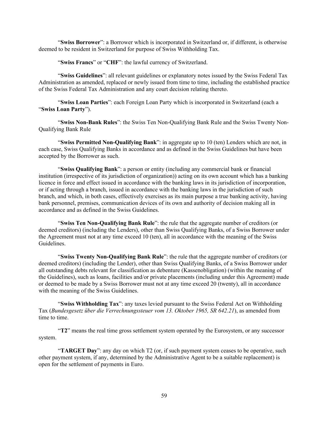 59 “Swiss Borrower”: a Borrower which is incorporated in Switzerland or, if different, is otherwise deemed to be resident in Switzerland for purpose of Swiss Withholding Tax. “Swiss Francs” or “CHF”: the lawful currency of Switzerland. “Swiss Guidelines”: all relevant guidelines or explanatory notes issued by the Swiss Federal Tax Administration as amended, replaced or newly issued from time to time, including the established practice of the Swiss Federal Tax Administration and any court decision relating thereto. “Swiss Loan Parties”: each Foreign Loan Party which is incorporated in Switzerland (each a “Swiss Loan Party”). “Swiss Non-Bank Rules”: the Swiss Ten Non-Qualifying Bank Rule and the Swiss Twenty Non- Qualifying Bank Rule “Swiss Permitted Non-Qualifying Bank”: in aggregate up to 10 (ten) Lenders which are not, in each case, Swiss Qualifying Banks in accordance and as defined in the Swiss Guidelines but have been accepted by the Borrower as such. “Swiss Qualifying Bank”: a person or entity (including any commercial bank or financial institution (irrespective of its jurisdiction of organization)) acting on its own account which has a banking licence in force and effect issued in accordance with the banking laws in its jurisdiction of incorporation, or if acting through a branch, issued in accordance with the banking laws in the jurisdiction of such branch, and which, in both cases, effectively exercises as its main purpose a true banking activity, having bank personnel, premises, communication devices of its own and authority of decision making all in accordance and as defined in the Swiss Guidelines. “Swiss Ten Non-Qualifying Bank Rule”: the rule that the aggregate number of creditors (or deemed creditors) (including the Lenders), other than Swiss Qualifying Banks, of a Swiss Borrower under the Agreement must not at any time exceed 10 (ten), all in accordance with the meaning of the Swiss Guidelines. “Swiss Twenty Non-Qualifying Bank Rule”: the rule that the aggregate number of creditors (or deemed creditors) (including the Lender), other than Swiss Qualifying Banks, of a Swiss Borrower under all outstanding debts relevant for classification as debenture (Kassenobligation) (within the meaning of the Guidelines), such as loans, facilities and/or private placements (including under this Agreement) made or deemed to be made by a Swiss Borrower must not at any time exceed 20 (twenty), all in accordance with the meaning of the Swiss Guidelines. “Swiss Withholding Tax”: any taxes levied pursuant to the Swiss Federal Act on Withholding Tax (Bundesgesetz über die Verrechnungssteuer vom 13. Oktober 1965, SR 642.21), as amended from time to time. “T2” means the real time gross settlement system operated by the Eurosystem, or any successor system. “TARGET Day”: any day on which T2 (or, if such payment system ceases to be operative, such other payment system, if any, determined by the Administrative Agent to be a suitable replacement) is open for the settlement of payments in Euro.