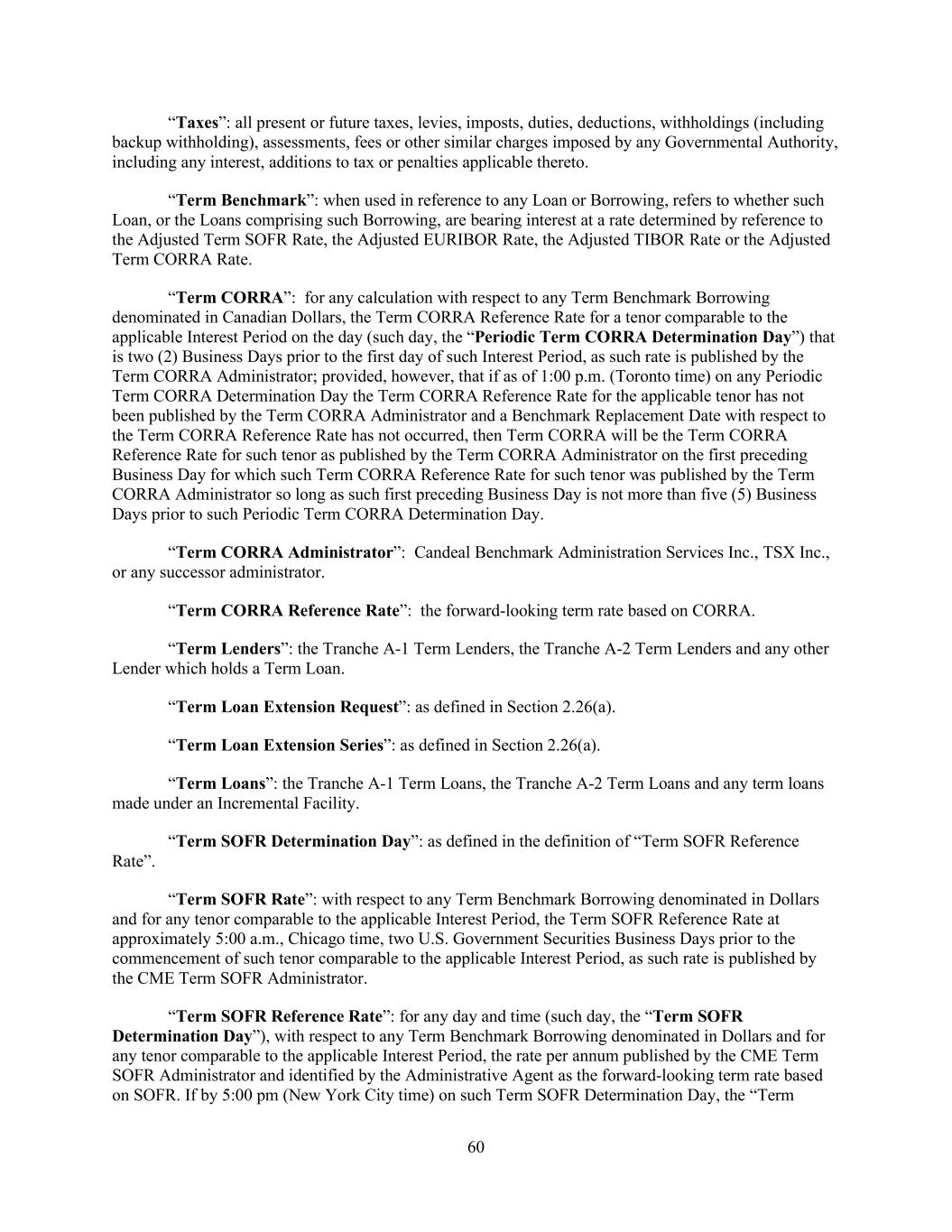 60 “Taxes”: all present or future taxes, levies, imposts, duties, deductions, withholdings (including backup withholding), assessments, fees or other similar charges imposed by any Governmental Authority, including any interest, additions to tax or penalties applicable thereto. “Term Benchmark”: when used in reference to any Loan or Borrowing, refers to whether such Loan, or the Loans comprising such Borrowing, are bearing interest at a rate determined by reference to the Adjusted Term SOFR Rate, the Adjusted EURIBOR Rate, the Adjusted TIBOR Rate or the Adjusted Term CORRA Rate. “Term CORRA”: for any calculation with respect to any Term Benchmark Borrowing denominated in Canadian Dollars, the Term CORRA Reference Rate for a tenor comparable to the applicable Interest Period on the day (such day, the “Periodic Term CORRA Determination Day”) that is two (2) Business Days prior to the first day of such Interest Period, as such rate is published by the Term CORRA Administrator; provided, however, that if as of 1:00 p.m. (Toronto time) on any Periodic Term CORRA Determination Day the Term CORRA Reference Rate for the applicable tenor has not been published by the Term CORRA Administrator and a Benchmark Replacement Date with respect to the Term CORRA Reference Rate has not occurred, then Term CORRA will be the Term CORRA Reference Rate for such tenor as published by the Term CORRA Administrator on the first preceding Business Day for which such Term CORRA Reference Rate for such tenor was published by the Term CORRA Administrator so long as such first preceding Business Day is not more than five (5) Business Days prior to such Periodic Term CORRA Determination Day. “Term CORRA Administrator”: Candeal Benchmark Administration Services Inc., TSX Inc., or any successor administrator. “Term CORRA Reference Rate”: the forward-looking term rate based on CORRA. “Term Lenders”: the Tranche A-1 Term Lenders, the Tranche A-2 Term Lenders and any other Lender which holds a Term Loan. “Term Loan Extension Request”: as defined in Section 2.26(a). “Term Loan Extension Series”: as defined in Section 2.26(a). “Term Loans”: the Tranche A-1 Term Loans, the Tranche A-2 Term Loans and any term loans made under an Incremental Facility. “Term SOFR Determination Day”: as defined in the definition of “Term SOFR Reference Rate”. “Term SOFR Rate”: with respect to any Term Benchmark Borrowing denominated in Dollars and for any tenor comparable to the applicable Interest Period, the Term SOFR Reference Rate at approximately 5:00 a.m., Chicago time, two U.S. Government Securities Business Days prior to the commencement of such tenor comparable to the applicable Interest Period, as such rate is published by the CME Term SOFR Administrator. “Term SOFR Reference Rate”: for any day and time (such day, the “Term SOFR Determination Day”), with respect to any Term Benchmark Borrowing denominated in Dollars and for any tenor comparable to the applicable Interest Period, the rate per annum published by the CME Term SOFR Administrator and identified by the Administrative Agent as the forward-looking term rate based on SOFR. If by 5:00 pm (New York City time) on such Term SOFR Determination Day, the “Term
