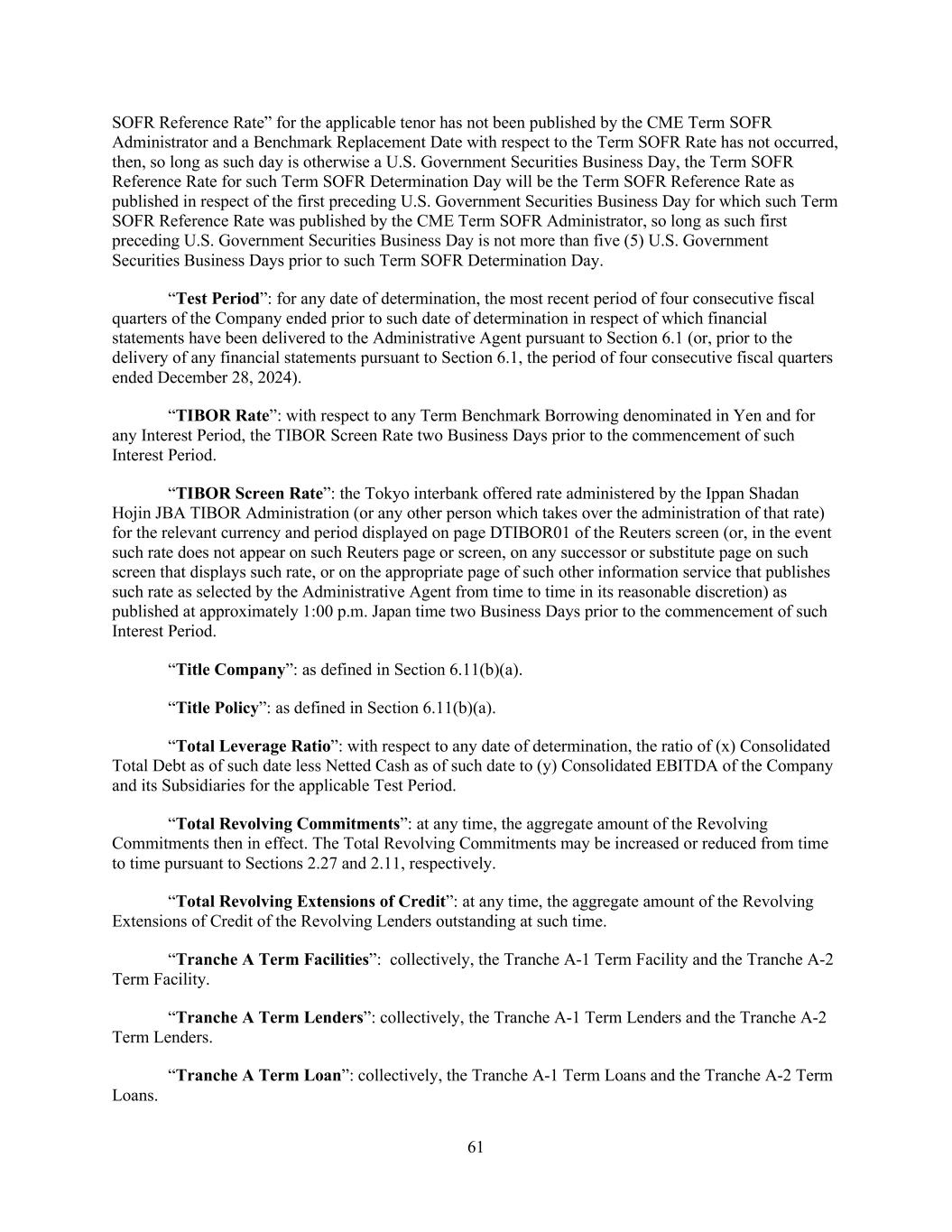 61 SOFR Reference Rate” for the applicable tenor has not been published by the CME Term SOFR Administrator and a Benchmark Replacement Date with respect to the Term SOFR Rate has not occurred, then, so long as such day is otherwise a U.S. Government Securities Business Day, the Term SOFR Reference Rate for such Term SOFR Determination Day will be the Term SOFR Reference Rate as published in respect of the first preceding U.S. Government Securities Business Day for which such Term SOFR Reference Rate was published by the CME Term SOFR Administrator, so long as such first preceding U.S. Government Securities Business Day is not more than five (5) U.S. Government Securities Business Days prior to such Term SOFR Determination Day. “Test Period”: for any date of determination, the most recent period of four consecutive fiscal quarters of the Company ended prior to such date of determination in respect of which financial statements have been delivered to the Administrative Agent pursuant to Section 6.1 (or, prior to the delivery of any financial statements pursuant to Section 6.1, the period of four consecutive fiscal quarters ended December 28, 2024). “TIBOR Rate”: with respect to any Term Benchmark Borrowing denominated in Yen and for any Interest Period, the TIBOR Screen Rate two Business Days prior to the commencement of such Interest Period. “TIBOR Screen Rate”: the Tokyo interbank offered rate administered by the Ippan Shadan Hojin JBA TIBOR Administration (or any other person which takes over the administration of that rate) for the relevant currency and period displayed on page DTIBOR01 of the Reuters screen (or, in the event such rate does not appear on such Reuters page or screen, on any successor or substitute page on such screen that displays such rate, or on the appropriate page of such other information service that publishes such rate as selected by the Administrative Agent from time to time in its reasonable discretion) as published at approximately 1:00 p.m. Japan time two Business Days prior to the commencement of such Interest Period. “Title Company”: as defined in Section 6.11(b)(a). “Title Policy”: as defined in Section 6.11(b)(a). “Total Leverage Ratio”: with respect to any date of determination, the ratio of (x) Consolidated Total Debt as of such date less Netted Cash as of such date to (y) Consolidated EBITDA of the Company and its Subsidiaries for the applicable Test Period. “Total Revolving Commitments”: at any time, the aggregate amount of the Revolving Commitments then in effect. The Total Revolving Commitments may be increased or reduced from time to time pursuant to Sections 2.27 and 2.11, respectively. “Total Revolving Extensions of Credit”: at any time, the aggregate amount of the Revolving Extensions of Credit of the Revolving Lenders outstanding at such time. “Tranche A Term Facilities”: collectively, the Tranche A-1 Term Facility and the Tranche A-2 Term Facility. “Tranche A Term Lenders”: collectively, the Tranche A-1 Term Lenders and the Tranche A-2 Term Lenders. “Tranche A Term Loan”: collectively, the Tranche A-1 Term Loans and the Tranche A-2 Term Loans.
