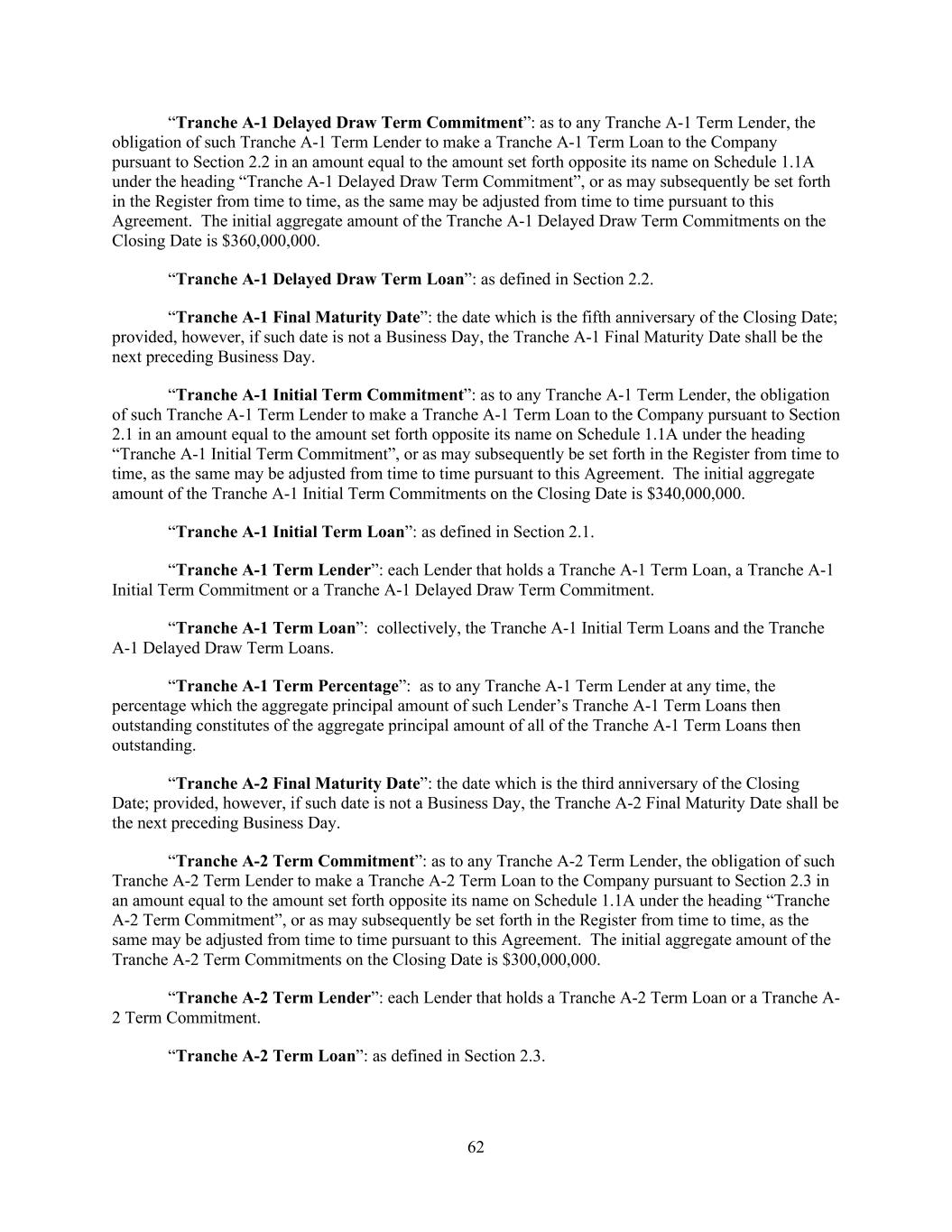 62 “Tranche A-1 Delayed Draw Term Commitment”: as to any Tranche A-1 Term Lender, the obligation of such Tranche A-1 Term Lender to make a Tranche A-1 Term Loan to the Company pursuant to Section 2.2 in an amount equal to the amount set forth opposite its name on Schedule 1.1A under the heading “Tranche A-1 Delayed Draw Term Commitment”, or as may subsequently be set forth in the Register from time to time, as the same may be adjusted from time to time pursuant to this Agreement. The initial aggregate amount of the Tranche A-1 Delayed Draw Term Commitments on the Closing Date is $360,000,000. “Tranche A-1 Delayed Draw Term Loan”: as defined in Section 2.2. “Tranche A-1 Final Maturity Date”: the date which is the fifth anniversary of the Closing Date; provided, however, if such date is not a Business Day, the Tranche A-1 Final Maturity Date shall be the next preceding Business Day. “Tranche A-1 Initial Term Commitment”: as to any Tranche A-1 Term Lender, the obligation of such Tranche A-1 Term Lender to make a Tranche A-1 Term Loan to the Company pursuant to Section 2.1 in an amount equal to the amount set forth opposite its name on Schedule 1.1A under the heading “Tranche A-1 Initial Term Commitment”, or as may subsequently be set forth in the Register from time to time, as the same may be adjusted from time to time pursuant to this Agreement. The initial aggregate amount of the Tranche A-1 Initial Term Commitments on the Closing Date is $340,000,000. “Tranche A-1 Initial Term Loan”: as defined in Section 2.1. “Tranche A-1 Term Lender”: each Lender that holds a Tranche A-1 Term Loan, a Tranche A-1 Initial Term Commitment or a Tranche A-1 Delayed Draw Term Commitment. “Tranche A-1 Term Loan”: collectively, the Tranche A-1 Initial Term Loans and the Tranche A-1 Delayed Draw Term Loans. “Tranche A-1 Term Percentage”: as to any Tranche A-1 Term Lender at any time, the percentage which the aggregate principal amount of such Lender’s Tranche A-1 Term Loans then outstanding constitutes of the aggregate principal amount of all of the Tranche A-1 Term Loans then outstanding. “Tranche A-2 Final Maturity Date”: the date which is the third anniversary of the Closing Date; provided, however, if such date is not a Business Day, the Tranche A-2 Final Maturity Date shall be the next preceding Business Day. “Tranche A-2 Term Commitment”: as to any Tranche A-2 Term Lender, the obligation of such Tranche A-2 Term Lender to make a Tranche A-2 Term Loan to the Company pursuant to Section 2.3 in an amount equal to the amount set forth opposite its name on Schedule 1.1A under the heading “Tranche A-2 Term Commitment”, or as may subsequently be set forth in the Register from time to time, as the same may be adjusted from time to time pursuant to this Agreement. The initial aggregate amount of the Tranche A-2 Term Commitments on the Closing Date is $300,000,000. “Tranche A-2 Term Lender”: each Lender that holds a Tranche A-2 Term Loan or a Tranche A- 2 Term Commitment. “Tranche A-2 Term Loan”: as defined in Section 2.3.