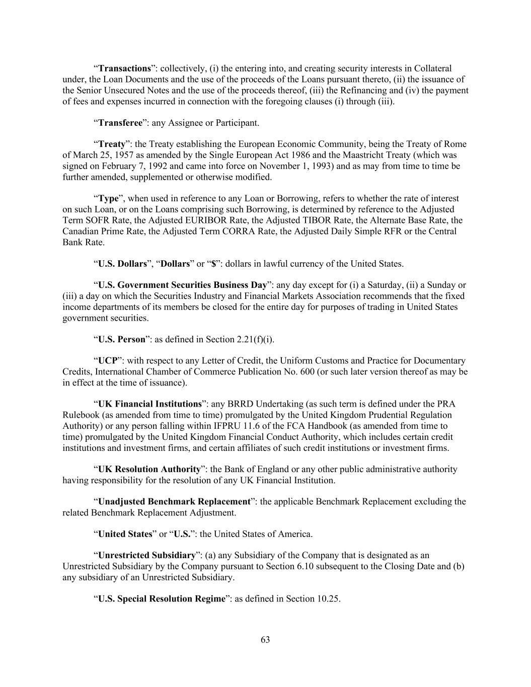 63 “Transactions”: collectively, (i) the entering into, and creating security interests in Collateral under, the Loan Documents and the use of the proceeds of the Loans pursuant thereto, (ii) the issuance of the Senior Unsecured Notes and the use of the proceeds thereof, (iii) the Refinancing and (iv) the payment of fees and expenses incurred in connection with the foregoing clauses (i) through (iii). “Transferee”: any Assignee or Participant. “Treaty”: the Treaty establishing the European Economic Community, being the Treaty of Rome of March 25, 1957 as amended by the Single European Act 1986 and the Maastricht Treaty (which was signed on February 7, 1992 and came into force on November 1, 1993) and as may from time to time be further amended, supplemented or otherwise modified. “Type”, when used in reference to any Loan or Borrowing, refers to whether the rate of interest on such Loan, or on the Loans comprising such Borrowing, is determined by reference to the Adjusted Term SOFR Rate, the Adjusted EURIBOR Rate, the Adjusted TIBOR Rate, the Alternate Base Rate, the Canadian Prime Rate, the Adjusted Term CORRA Rate, the Adjusted Daily Simple RFR or the Central Bank Rate. “U.S. Dollars”, “Dollars” or “$”: dollars in lawful currency of the United States. “U.S. Government Securities Business Day”: any day except for (i) a Saturday, (ii) a Sunday or (iii) a day on which the Securities Industry and Financial Markets Association recommends that the fixed income departments of its members be closed for the entire day for purposes of trading in United States government securities. “U.S. Person”: as defined in Section 2.21(f)(i). “UCP”: with respect to any Letter of Credit, the Uniform Customs and Practice for Documentary Credits, International Chamber of Commerce Publication No. 600 (or such later version thereof as may be in effect at the time of issuance). “UK Financial Institutions”: any BRRD Undertaking (as such term is defined under the PRA Rulebook (as amended from time to time) promulgated by the United Kingdom Prudential Regulation Authority) or any person falling within IFPRU 11.6 of the FCA Handbook (as amended from time to time) promulgated by the United Kingdom Financial Conduct Authority, which includes certain credit institutions and investment firms, and certain affiliates of such credit institutions or investment firms. “UK Resolution Authority”: the Bank of England or any other public administrative authority having responsibility for the resolution of any UK Financial Institution. “Unadjusted Benchmark Replacement”: the applicable Benchmark Replacement excluding the related Benchmark Replacement Adjustment. “United States” or “U.S.”: the United States of America. “Unrestricted Subsidiary”: (a) any Subsidiary of the Company that is designated as an Unrestricted Subsidiary by the Company pursuant to Section 6.10 subsequent to the Closing Date and (b) any subsidiary of an Unrestricted Subsidiary. “U.S. Special Resolution Regime”: as defined in Section 10.25.