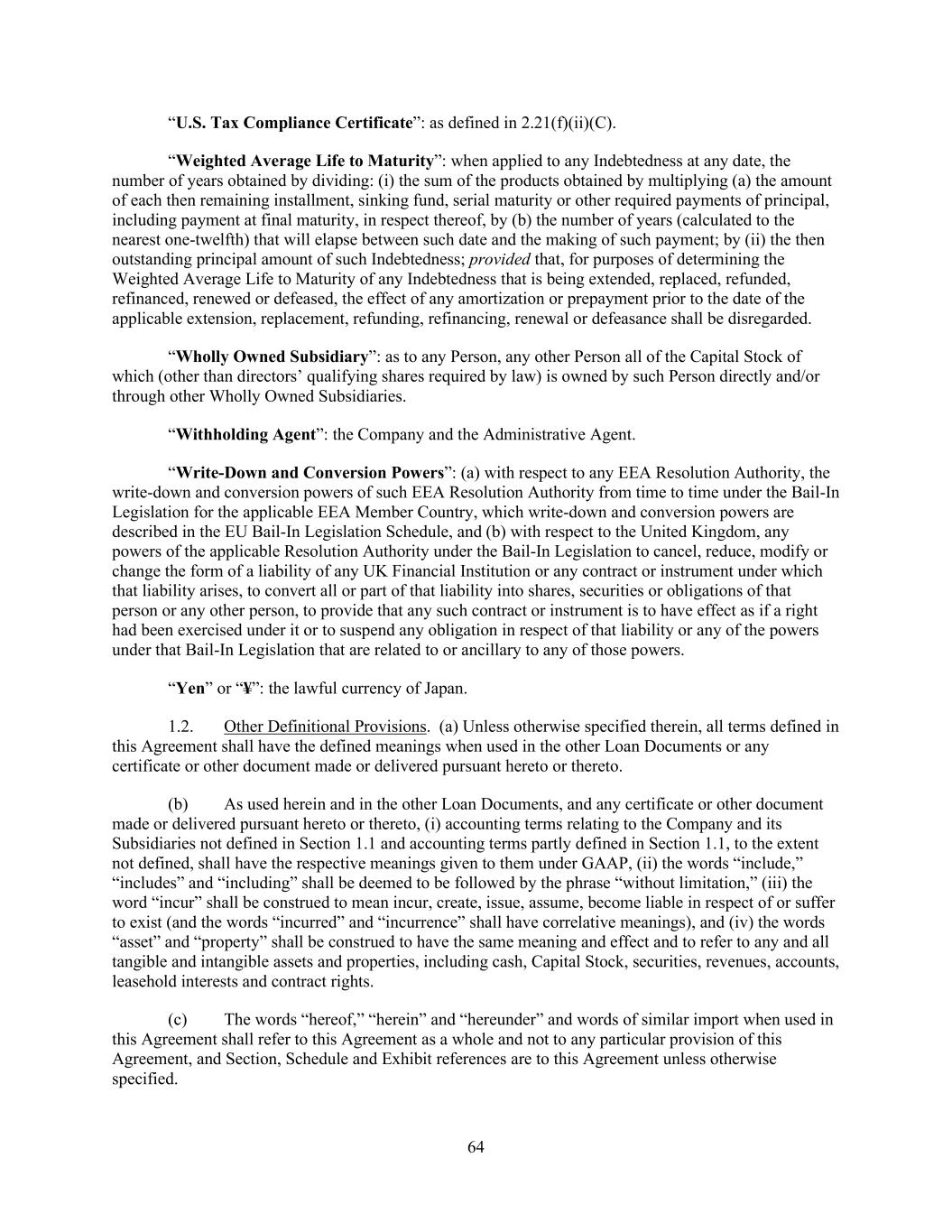 64 “U.S. Tax Compliance Certificate”: as defined in 2.21(f)(ii)(C). “Weighted Average Life to Maturity”: when applied to any Indebtedness at any date, the number of years obtained by dividing: (i) the sum of the products obtained by multiplying (a) the amount of each then remaining installment, sinking fund, serial maturity or other required payments of principal, including payment at final maturity, in respect thereof, by (b) the number of years (calculated to the nearest one-twelfth) that will elapse between such date and the making of such payment; by (ii) the then outstanding principal amount of such Indebtedness; provided that, for purposes of determining the Weighted Average Life to Maturity of any Indebtedness that is being extended, replaced, refunded, refinanced, renewed or defeased, the effect of any amortization or prepayment prior to the date of the applicable extension, replacement, refunding, refinancing, renewal or defeasance shall be disregarded. “Wholly Owned Subsidiary”: as to any Person, any other Person all of the Capital Stock of which (other than directors’ qualifying shares required by law) is owned by such Person directly and/or through other Wholly Owned Subsidiaries. “Withholding Agent”: the Company and the Administrative Agent. “Write-Down and Conversion Powers”: (a) with respect to any EEA Resolution Authority, the write-down and conversion powers of such EEA Resolution Authority from time to time under the Bail-In Legislation for the applicable EEA Member Country, which write-down and conversion powers are described in the EU Bail-In Legislation Schedule, and (b) with respect to the United Kingdom, any powers of the applicable Resolution Authority under the Bail-In Legislation to cancel, reduce, modify or change the form of a liability of any UK Financial Institution or any contract or instrument under which that liability arises, to convert all or part of that liability into shares, securities or obligations of that person or any other person, to provide that any such contract or instrument is to have effect as if a right had been exercised under it or to suspend any obligation in respect of that liability or any of the powers under that Bail-In Legislation that are related to or ancillary to any of those powers. “Yen” or “¥”: the lawful currency of Japan. 1.2. Other Definitional Provisions. (a) Unless otherwise specified therein, all terms defined in this Agreement shall have the defined meanings when used in the other Loan Documents or any certificate or other document made or delivered pursuant hereto or thereto. (b) As used herein and in the other Loan Documents, and any certificate or other document made or delivered pursuant hereto or thereto, (i) accounting terms relating to the Company and its Subsidiaries not defined in Section 1.1 and accounting terms partly defined in Section 1.1, to the extent not defined, shall have the respective meanings given to them under GAAP, (ii) the words “include,” “includes” and “including” shall be deemed to be followed by the phrase “without limitation,” (iii) the word “incur” shall be construed to mean incur, create, issue, assume, become liable in respect of or suffer to exist (and the words “incurred” and “incurrence” shall have correlative meanings), and (iv) the words “asset” and “property” shall be construed to have the same meaning and effect and to refer to any and all tangible and intangible assets and properties, including cash, Capital Stock, securities, revenues, accounts, leasehold interests and contract rights. (c) The words “hereof,” “herein” and “hereunder” and words of similar import when used in this Agreement shall refer to this Agreement as a whole and not to any particular provision of this Agreement, and Section, Schedule and Exhibit references are to this Agreement unless otherwise specified.