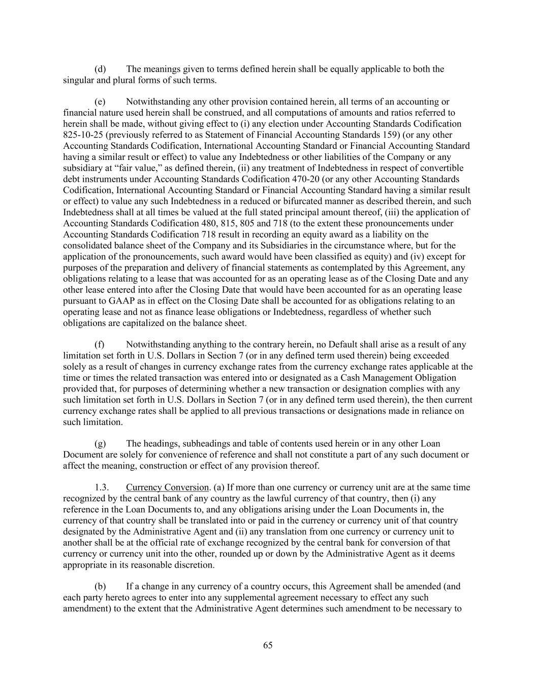 65 (d) The meanings given to terms defined herein shall be equally applicable to both the singular and plural forms of such terms. (e) Notwithstanding any other provision contained herein, all terms of an accounting or financial nature used herein shall be construed, and all computations of amounts and ratios referred to herein shall be made, without giving effect to (i) any election under Accounting Standards Codification 825-10-25 (previously referred to as Statement of Financial Accounting Standards 159) (or any other Accounting Standards Codification, International Accounting Standard or Financial Accounting Standard having a similar result or effect) to value any Indebtedness or other liabilities of the Company or any subsidiary at “fair value,” as defined therein, (ii) any treatment of Indebtedness in respect of convertible debt instruments under Accounting Standards Codification 470-20 (or any other Accounting Standards Codification, International Accounting Standard or Financial Accounting Standard having a similar result or effect) to value any such Indebtedness in a reduced or bifurcated manner as described therein, and such Indebtedness shall at all times be valued at the full stated principal amount thereof, (iii) the application of Accounting Standards Codification 480, 815, 805 and 718 (to the extent these pronouncements under Accounting Standards Codification 718 result in recording an equity award as a liability on the consolidated balance sheet of the Company and its Subsidiaries in the circumstance where, but for the application of the pronouncements, such award would have been classified as equity) and (iv) except for purposes of the preparation and delivery of financial statements as contemplated by this Agreement, any obligations relating to a lease that was accounted for as an operating lease as of the Closing Date and any other lease entered into after the Closing Date that would have been accounted for as an operating lease pursuant to GAAP as in effect on the Closing Date shall be accounted for as obligations relating to an operating lease and not as finance lease obligations or Indebtedness, regardless of whether such obligations are capitalized on the balance sheet. (f) Notwithstanding anything to the contrary herein, no Default shall arise as a result of any limitation set forth in U.S. Dollars in Section 7 (or in any defined term used therein) being exceeded solely as a result of changes in currency exchange rates from the currency exchange rates applicable at the time or times the related transaction was entered into or designated as a Cash Management Obligation provided that, for purposes of determining whether a new transaction or designation complies with any such limitation set forth in U.S. Dollars in Section 7 (or in any defined term used therein), the then current currency exchange rates shall be applied to all previous transactions or designations made in reliance on such limitation. (g) The headings, subheadings and table of contents used herein or in any other Loan Document are solely for convenience of reference and shall not constitute a part of any such document or affect the meaning, construction or effect of any provision thereof. 1.3. Currency Conversion. (a) If more than one currency or currency unit are at the same time recognized by the central bank of any country as the lawful currency of that country, then (i) any reference in the Loan Documents to, and any obligations arising under the Loan Documents in, the currency of that country shall be translated into or paid in the currency or currency unit of that country designated by the Administrative Agent and (ii) any translation from one currency or currency unit to another shall be at the official rate of exchange recognized by the central bank for conversion of that currency or currency unit into the other, rounded up or down by the Administrative Agent as it deems appropriate in its reasonable discretion. (b) If a change in any currency of a country occurs, this Agreement shall be amended (and each party hereto agrees to enter into any supplemental agreement necessary to effect any such amendment) to the extent that the Administrative Agent determines such amendment to be necessary to