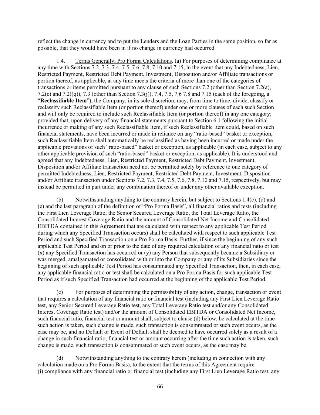66 reflect the change in currency and to put the Lenders and the Loan Parties in the same position, so far as possible, that they would have been in if no change in currency had occurred. 1.4. Terms Generally; Pro Forma Calculations. (a) For purposes of determining compliance at any time with Sections 7.2, 7.3, 7.4, 7.5, 7.6, 7.8, 7.10 and 7.15, in the event that any Indebtedness, Lien, Restricted Payment, Restricted Debt Payment, Investment, Disposition and/or Affiliate transactions or portion thereof, as applicable, at any time meets the criteria of more than one of the categories of transactions or items permitted pursuant to any clause of such Sections 7.2 (other than Section 7.2(a), 7.2(c) and 7.2((q)), 7.3 (other than Section 7.3(j)), 7.4, 7.5, 7.6 7.8 and 7.15 (each of the foregoing, a “Reclassifiable Item”), the Company, in its sole discretion, may, from time to time, divide, classify or reclassify such Reclassifiable Item (or portion thereof) under one or more clauses of each such Section and will only be required to include such Reclassifiable Item (or portion thereof) in any one category; provided that, upon delivery of any financial statements pursuant to Section 6.1 following the initial incurrence or making of any such Reclassifiable Item, if such Reclassifiable Item could, based on such financial statements, have been incurred or made in reliance on any “ratio-based” basket or exception, such Reclassifiable Item shall automatically be reclassified as having been incurred or made under the applicable provisions of such “ratio-based” basket or exception, as applicable (in each case, subject to any other applicable provision of such “ratio-based” basket or exception, as applicable). It is understood and agreed that any Indebtedness, Lien, Restricted Payment, Restricted Debt Payment, Investment, Disposition and/or Affiliate transaction need not be permitted solely by reference to one category of permitted Indebtedness, Lien, Restricted Payment, Restricted Debt Payment, Investment, Disposition and/or Affiliate transaction under Sections 7.2, 7.3, 7.4, 7.5, 7.6, 7.8, 7.10 and 7.15, respectively, but may instead be permitted in part under any combination thereof or under any other available exception. (b) Notwithstanding anything to the contrary herein, but subject to Sections 1.4(c), (d) and (e) and the last paragraph of the definition of “Pro Forma Basis”, all financial ratios and tests (including the First Lien Leverage Ratio, the Senior Secured Leverage Ratio, the Total Leverage Ratio, the Consolidated Interest Coverage Ratio and the amount of Consolidated Net Income and Consolidated EBITDA contained in this Agreement that are calculated with respect to any applicable Test Period during which any Specified Transaction occurs) shall be calculated with respect to such applicable Test Period and such Specified Transaction on a Pro Forma Basis. Further, if since the beginning of any such applicable Test Period and on or prior to the date of any required calculation of any financial ratio or test (x) any Specified Transaction has occurred or (y) any Person that subsequently became a Subsidiary or was merged, amalgamated or consolidated with or into the Company or any of its Subsidiaries since the beginning of such applicable Test Period has consummated any Specified Transaction, then, in each case, any applicable financial ratio or test shall be calculated on a Pro Forma Basis for such applicable Test Period as if such Specified Transaction had occurred at the beginning of the applicable Test Period. (c) For purposes of determining the permissibility of any action, change, transaction or event that requires a calculation of any financial ratio or financial test (including any First Lien Leverage Ratio test, any Senior Secured Leverage Ratio test, any Total Leverage Ratio test and/or any Consolidated Interest Coverage Ratio test) and/or the amount of Consolidated EBITDA or Consolidated Net Income, such financial ratio, financial test or amount shall, subject to clause (d) below, be calculated at the time such action is taken, such change is made, such transaction is consummated or such event occurs, as the case may be, and no Default or Event of Default shall be deemed to have occurred solely as a result of a change in such financial ratio, financial test or amount occurring after the time such action is taken, such change is made, such transaction is consummated or such event occurs, as the case may be. (d) Notwithstanding anything to the contrary herein (including in connection with any calculation made on a Pro Forma Basis), to the extent that the terms of this Agreement require (i) compliance with any financial ratio or financial test (including any First Lien Leverage Ratio test, any