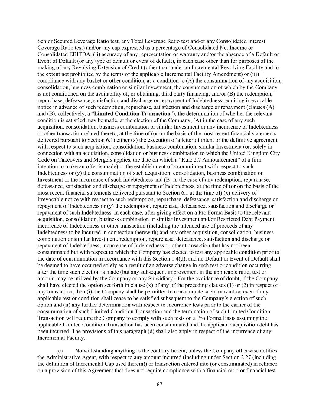 67 Senior Secured Leverage Ratio test, any Total Leverage Ratio test and/or any Consolidated Interest Coverage Ratio test) and/or any cap expressed as a percentage of Consolidated Net Income or Consolidated EBITDA, (ii) accuracy of any representation or warranty and/or the absence of a Default or Event of Default (or any type of default or event of default), in each case other than for purposes of the making of any Revolving Extension of Credit (other than under an Incremental Revolving Facility and to the extent not prohibited by the terms of the applicable Incremental Facility Amendment) or (iii) compliance with any basket or other condition, as a condition to (A) the consummation of any acquisition, consolidation, business combination or similar Investment, the consummation of which by the Company is not conditioned on the availability of, or obtaining, third party financing, and/or (B) the redemption, repurchase, defeasance, satisfaction and discharge or repayment of Indebtedness requiring irrevocable notice in advance of such redemption, repurchase, satisfaction and discharge or repayment (clauses (A) and (B), collectively, a “Limited Condition Transaction”), the determination of whether the relevant condition is satisfied may be made, at the election of the Company, (A) in the case of any such acquisition, consolidation, business combination or similar Investment or any incurrence of Indebtedness or other transaction related thereto, at the time of (or on the basis of the most recent financial statements delivered pursuant to Section 6.1) either (x) the execution of a letter of intent or the definitive agreement with respect to such acquisition, consolidation, business combination, similar Investment (or, solely in connection with an acquisition, consolidation or business combination to which the United Kingdom City Code on Takeovers and Mergers applies, the date on which a “Rule 2.7 Announcement” of a firm intention to make an offer is made) or the establishment of a commitment with respect to such Indebtedness or (y) the consummation of such acquisition, consolidation, business combination or Investment or the incurrence of such Indebtedness and (B) in the case of any redemption, repurchase, defeasance, satisfaction and discharge or repayment of Indebtedness, at the time of (or on the basis of the most recent financial statements delivered pursuant to Section 6.1 at the time of) (x) delivery of irrevocable notice with respect to such redemption, repurchase, defeasance, satisfaction and discharge or repayment of Indebtedness or (y) the redemption, repurchase, defeasance, satisfaction and discharge or repayment of such Indebtedness, in each case, after giving effect on a Pro Forma Basis to the relevant acquisition, consolidation, business combination or similar Investment and/or Restricted Debt Payment, incurrence of Indebtedness or other transaction (including the intended use of proceeds of any Indebtedness to be incurred in connection therewith) and any other acquisition, consolidation, business combination or similar Investment, redemption, repurchase, defeasance, satisfaction and discharge or repayment of Indebtedness, incurrence of Indebtedness or other transaction that has not been consummated but with respect to which the Company has elected to test any applicable condition prior to the date of consummation in accordance with this Section 1.4(d), and no Default or Event of Default shall be deemed to have occurred solely as a result of an adverse change in such test or condition occurring after the time such election is made (but any subsequent improvement in the applicable ratio, test or amount may be utilized by the Company or any Subsidiary). For the avoidance of doubt, if the Company shall have elected the option set forth in clause (x) of any of the preceding clauses (1) or (2) in respect of any transaction, then (i) the Company shall be permitted to consummate such transaction even if any applicable test or condition shall cease to be satisfied subsequent to the Company’s election of such option and (ii) any further determination with respect to incurrence tests prior to the earlier of the consummation of such Limited Condition Transaction and the termination of such Limited Condition Transaction will require the Company to comply with such tests on a Pro Forma Basis assuming the applicable Limited Condition Transaction has been consummated and the applicable acquisition debt has been incurred. The provisions of this paragraph (d) shall also apply in respect of the incurrence of any Incremental Facility. (e) Notwithstanding anything to the contrary herein, unless the Company otherwise notifies the Administrative Agent, with respect to any amount incurred (including under Section 2.27 (including the definition of Incremental Cap used therein)) or transaction entered into (or consummated) in reliance on a provision of this Agreement that does not require compliance with a financial ratio or financial test