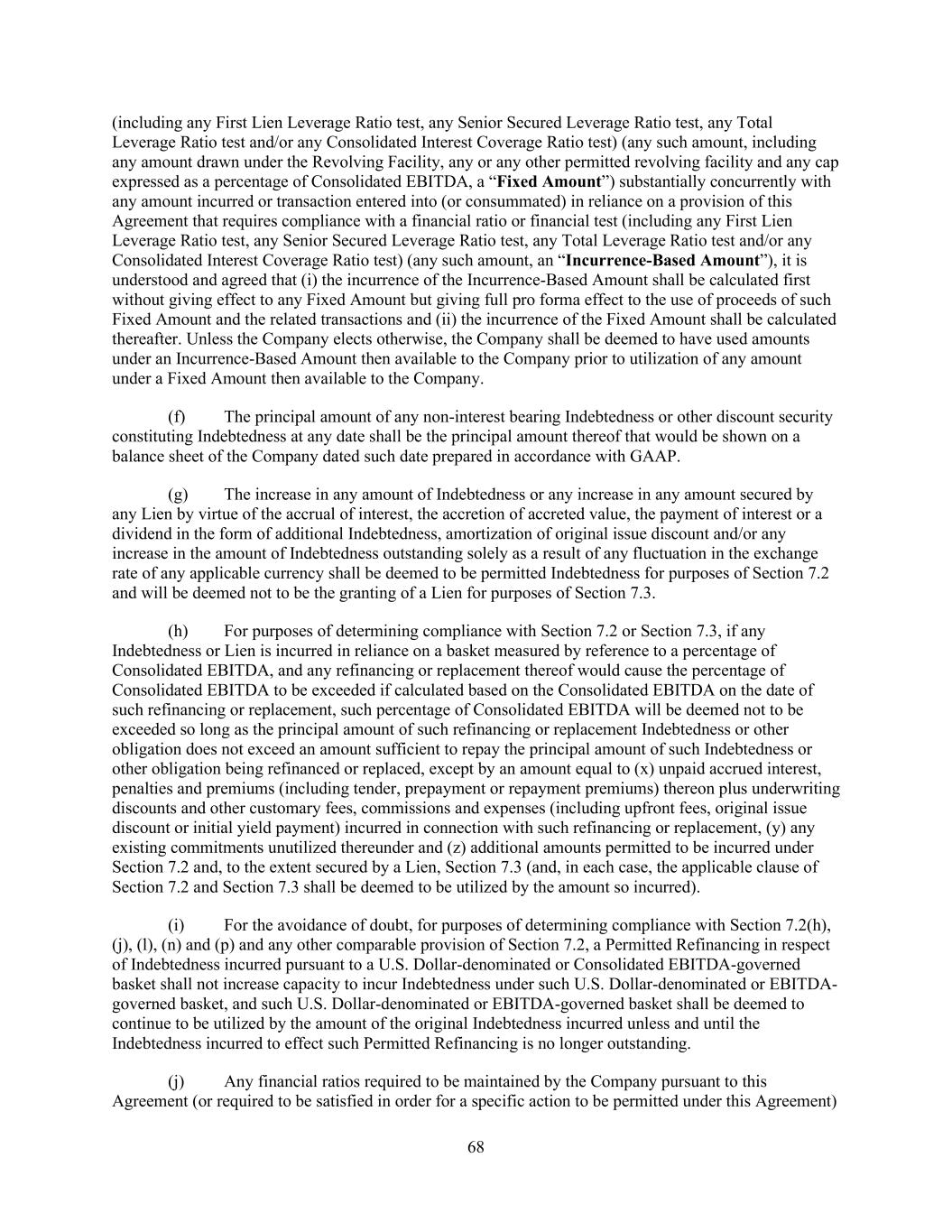 68 (including any First Lien Leverage Ratio test, any Senior Secured Leverage Ratio test, any Total Leverage Ratio test and/or any Consolidated Interest Coverage Ratio test) (any such amount, including any amount drawn under the Revolving Facility, any or any other permitted revolving facility and any cap expressed as a percentage of Consolidated EBITDA, a “Fixed Amount”) substantially concurrently with any amount incurred or transaction entered into (or consummated) in reliance on a provision of this Agreement that requires compliance with a financial ratio or financial test (including any First Lien Leverage Ratio test, any Senior Secured Leverage Ratio test, any Total Leverage Ratio test and/or any Consolidated Interest Coverage Ratio test) (any such amount, an “Incurrence-Based Amount”), it is understood and agreed that (i) the incurrence of the Incurrence-Based Amount shall be calculated first without giving effect to any Fixed Amount but giving full pro forma effect to the use of proceeds of such Fixed Amount and the related transactions and (ii) the incurrence of the Fixed Amount shall be calculated thereafter. Unless the Company elects otherwise, the Company shall be deemed to have used amounts under an Incurrence-Based Amount then available to the Company prior to utilization of any amount under a Fixed Amount then available to the Company. (f) The principal amount of any non-interest bearing Indebtedness or other discount security constituting Indebtedness at any date shall be the principal amount thereof that would be shown on a balance sheet of the Company dated such date prepared in accordance with GAAP. (g) The increase in any amount of Indebtedness or any increase in any amount secured by any Lien by virtue of the accrual of interest, the accretion of accreted value, the payment of interest or a dividend in the form of additional Indebtedness, amortization of original issue discount and/or any increase in the amount of Indebtedness outstanding solely as a result of any fluctuation in the exchange rate of any applicable currency shall be deemed to be permitted Indebtedness for purposes of Section 7.2 and will be deemed not to be the granting of a Lien for purposes of Section 7.3. (h) For purposes of determining compliance with Section 7.2 or Section 7.3, if any Indebtedness or Lien is incurred in reliance on a basket measured by reference to a percentage of Consolidated EBITDA, and any refinancing or replacement thereof would cause the percentage of Consolidated EBITDA to be exceeded if calculated based on the Consolidated EBITDA on the date of such refinancing or replacement, such percentage of Consolidated EBITDA will be deemed not to be exceeded so long as the principal amount of such refinancing or replacement Indebtedness or other obligation does not exceed an amount sufficient to repay the principal amount of such Indebtedness or other obligation being refinanced or replaced, except by an amount equal to (x) unpaid accrued interest, penalties and premiums (including tender, prepayment or repayment premiums) thereon plus underwriting discounts and other customary fees, commissions and expenses (including upfront fees, original issue discount or initial yield payment) incurred in connection with such refinancing or replacement, (y) any existing commitments unutilized thereunder and (z) additional amounts permitted to be incurred under Section 7.2 and, to the extent secured by a Lien, Section 7.3 (and, in each case, the applicable clause of Section 7.2 and Section 7.3 shall be deemed to be utilized by the amount so incurred). (i) For the avoidance of doubt, for purposes of determining compliance with Section 7.2(h), (j), (l), (n) and (p) and any other comparable provision of Section 7.2, a Permitted Refinancing in respect of Indebtedness incurred pursuant to a U.S. Dollar-denominated or Consolidated EBITDA-governed basket shall not increase capacity to incur Indebtedness under such U.S. Dollar-denominated or EBITDA- governed basket, and such U.S. Dollar-denominated or EBITDA-governed basket shall be deemed to continue to be utilized by the amount of the original Indebtedness incurred unless and until the Indebtedness incurred to effect such Permitted Refinancing is no longer outstanding. (j) Any financial ratios required to be maintained by the Company pursuant to this Agreement (or required to be satisfied in order for a specific action to be permitted under this Agreement)