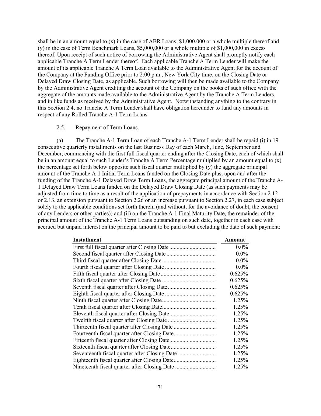 71 shall be in an amount equal to (x) in the case of ABR Loans, $1,000,000 or a whole multiple thereof and (y) in the case of Term Benchmark Loans, $5,000,000 or a whole multiple of $1,000,000 in excess thereof. Upon receipt of such notice of borrowing the Administrative Agent shall promptly notify each applicable Tranche A Term Lender thereof. Each applicable Tranche A Term Lender will make the amount of its applicable Tranche A Term Loan available to the Administrative Agent for the account of the Company at the Funding Office prior to 2:00 p.m., New York City time, on the Closing Date or Delayed Draw Closing Date, as applicable. Such borrowing will then be made available to the Company by the Administrative Agent crediting the account of the Company on the books of such office with the aggregate of the amounts made available to the Administrative Agent by the Tranche A Term Lenders and in like funds as received by the Administrative Agent. Notwithstanding anything to the contrary in this Section 2.4, no Tranche A Term Lender shall have obligation hereunder to fund any amounts in respect of any Rolled Tranche A-1 Term Loans. 2.5. Repayment of Term Loans. (a) The Tranche A-1 Term Loan of each Tranche A-1 Term Lender shall be repaid (i) in 19 consecutive quarterly installments on the last Business Day of each March, June, September and December, commencing with the first full fiscal quarter ending after the Closing Date, each of which shall be in an amount equal to such Lender’s Tranche A Term Percentage multiplied by an amount equal to (x) the percentage set forth below opposite such fiscal quarter multiplied by (y) the aggregate principal amount of the Tranche A-1 Initial Term Loans funded on the Closing Date plus, upon and after the funding of the Tranche A-1 Delayed Draw Term Loans, the aggregate principal amount of the Tranche A- 1 Delayed Draw Term Loans funded on the Delayed Draw Closing Date (as such payments may be adjusted from time to time as a result of the application of prepayments in accordance with Section 2.12 or 2.13, an extension pursuant to Section 2.26 or an increase pursuant to Section 2.27, in each case subject solely to the applicable conditions set forth therein (and without, for the avoidance of doubt, the consent of any Lenders or other parties)) and (ii) on the Tranche A-1 Final Maturity Date, the remainder of the principal amount of the Tranche A-1 Term Loans outstanding on such date, together in each case with accrued but unpaid interest on the principal amount to be paid to but excluding the date of such payment: Installment Amount First full fiscal quarter after Closing Date ................................ 0.0% Second fiscal quarter after Closing Date .................................. 0.0% Third fiscal quarter after Closing Date ..................................... 0.0% Fourth fiscal quarter after Closing Date ................................... 0.0% Fifth fiscal quarter after Closing Date ...................................... 0.625% Sixth fiscal quarter after Closing Date ..................................... 0.625% Seventh fiscal quarter after Closing Date ................................. 0.625% Eighth fiscal quarter after Closing Date ................................... 0.625% Ninth fiscal quarter after Closing Date ..................................... 1.25% Tenth fiscal quarter after Closing Date ..................................... 1.25% Eleventh fiscal quarter after Closing Date ................................ 1.25% Twelfth fiscal quarter after Closing Date ................................. 1.25% Thirteenth fiscal quarter after Closing Date ............................. 1.25% Fourteenth fiscal quarter after Closing Date ............................. 1.25% Fifteenth fiscal quarter after Closing Date................................ 1.25% Sixteenth fiscal quarter after Closing Date ............................... 1.25% Seventeenth fiscal quarter after Closing Date .......................... 1.25% Eighteenth fiscal quarter after Closing Date ............................. 1.25% Nineteenth fiscal quarter after Closing Date ............................ 1.25%