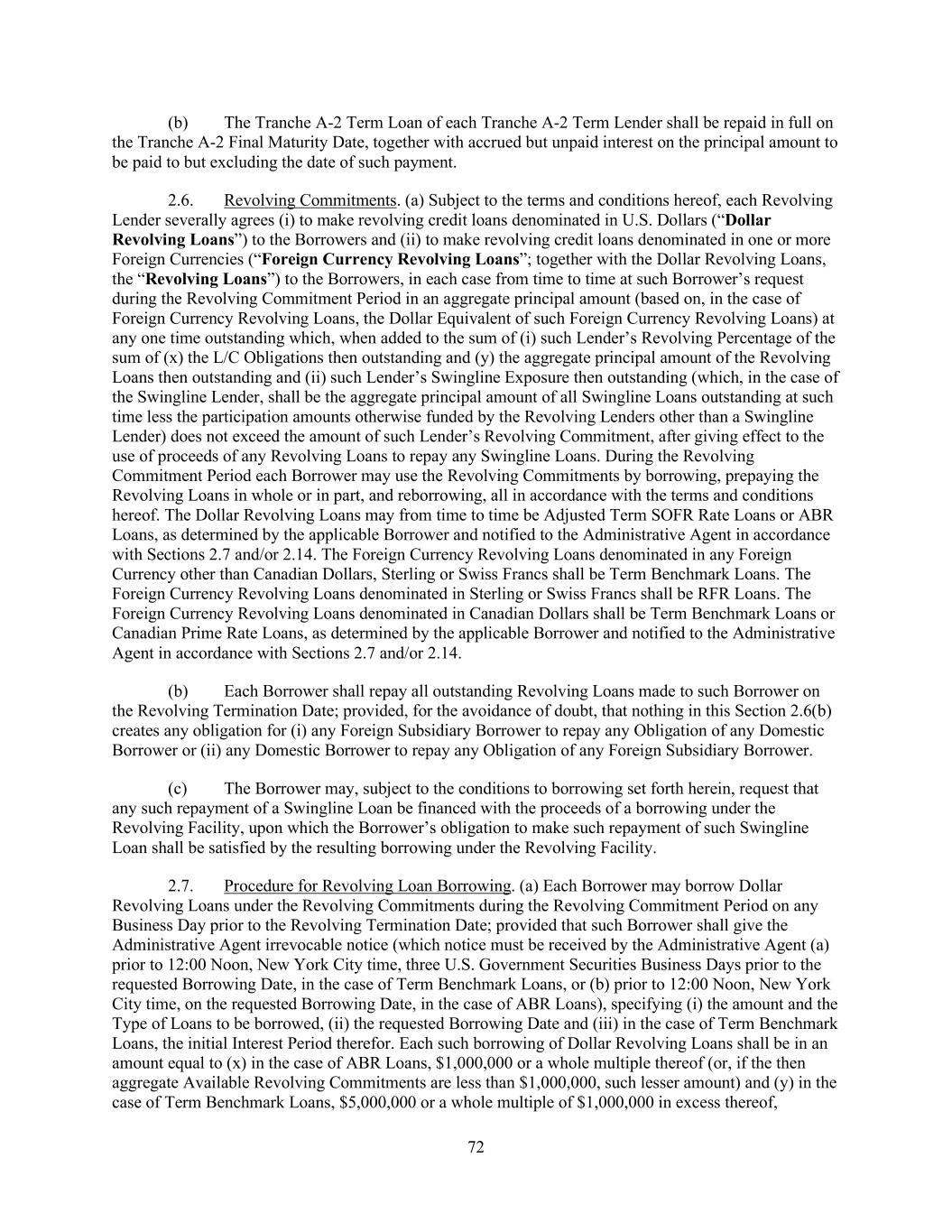 72 (b) The Tranche A-2 Term Loan of each Tranche A-2 Term Lender shall be repaid in full on the Tranche A-2 Final Maturity Date, together with accrued but unpaid interest on the principal amount to be paid to but excluding the date of such payment. 2.6. Revolving Commitments. (a) Subject to the terms and conditions hereof, each Revolving Lender severally agrees (i) to make revolving credit loans denominated in U.S. Dollars (“Dollar Revolving Loans”) to the Borrowers and (ii) to make revolving credit loans denominated in one or more Foreign Currencies (“Foreign Currency Revolving Loans”; together with the Dollar Revolving Loans, the “Revolving Loans”) to the Borrowers, in each case from time to time at such Borrower’s request during the Revolving Commitment Period in an aggregate principal amount (based on, in the case of Foreign Currency Revolving Loans, the Dollar Equivalent of such Foreign Currency Revolving Loans) at any one time outstanding which, when added to the sum of (i) such Lender’s Revolving Percentage of the sum of (x) the L/C Obligations then outstanding and (y) the aggregate principal amount of the Revolving Loans then outstanding and (ii) such Lender’s Swingline Exposure then outstanding (which, in the case of the Swingline Lender, shall be the aggregate principal amount of all Swingline Loans outstanding at such time less the participation amounts otherwise funded by the Revolving Lenders other than a Swingline Lender) does not exceed the amount of such Lender’s Revolving Commitment, after giving effect to the use of proceeds of any Revolving Loans to repay any Swingline Loans. During the Revolving Commitment Period each Borrower may use the Revolving Commitments by borrowing, prepaying the Revolving Loans in whole or in part, and reborrowing, all in accordance with the terms and conditions hereof. The Dollar Revolving Loans may from time to time be Adjusted Term SOFR Rate Loans or ABR Loans, as determined by the applicable Borrower and notified to the Administrative Agent in accordance with Sections 2.7 and/or 2.14. The Foreign Currency Revolving Loans denominated in any Foreign Currency other than Canadian Dollars, Sterling or Swiss Francs shall be Term Benchmark Loans. The Foreign Currency Revolving Loans denominated in Sterling or Swiss Francs shall be RFR Loans. The Foreign Currency Revolving Loans denominated in Canadian Dollars shall be Term Benchmark Loans or Canadian Prime Rate Loans, as determined by the applicable Borrower and notified to the Administrative Agent in accordance with Sections 2.7 and/or 2.14. (b) Each Borrower shall repay all outstanding Revolving Loans made to such Borrower on the Revolving Termination Date; provided, for the avoidance of doubt, that nothing in this Section 2.6(b) creates any obligation for (i) any Foreign Subsidiary Borrower to repay any Obligation of any Domestic Borrower or (ii) any Domestic Borrower to repay any Obligation of any Foreign Subsidiary Borrower. (c) The Borrower may, subject to the conditions to borrowing set forth herein, request that any such repayment of a Swingline Loan be financed with the proceeds of a borrowing under the Revolving Facility, upon which the Borrower’s obligation to make such repayment of such Swingline Loan shall be satisfied by the resulting borrowing under the Revolving Facility. 2.7. Procedure for Revolving Loan Borrowing. (a) Each Borrower may borrow Dollar Revolving Loans under the Revolving Commitments during the Revolving Commitment Period on any Business Day prior to the Revolving Termination Date; provided that such Borrower shall give the Administrative Agent irrevocable notice (which notice must be received by the Administrative Agent (a) prior to 12:00 Noon, New York City time, three U.S. Government Securities Business Days prior to the requested Borrowing Date, in the case of Term Benchmark Loans, or (b) prior to 12:00 Noon, New York City time, on the requested Borrowing Date, in the case of ABR Loans), specifying (i) the amount and the Type of Loans to be borrowed, (ii) the requested Borrowing Date and (iii) in the case of Term Benchmark Loans, the initial Interest Period therefor. Each such borrowing of Dollar Revolving Loans shall be in an amount equal to (x) in the case of ABR Loans, $1,000,000 or a whole multiple thereof (or, if the then aggregate Available Revolving Commitments are less than $1,000,000, such lesser amount) and (y) in the case of Term Benchmark Loans, $5,000,000 or a whole multiple of $1,000,000 in excess thereof,