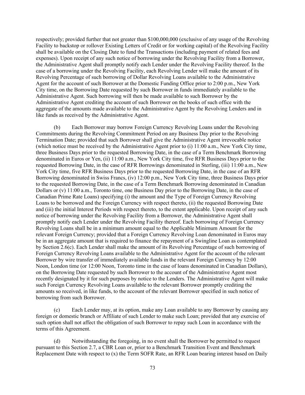 73 respectively; provided further that not greater than $100,000,000 (exclusive of any usage of the Revolving Facility to backstop or rollover Existing Letters of Credit or for working capital) of the Revolving Facility shall be available on the Closing Date to fund the Transactions (including payment of related fees and expenses). Upon receipt of any such notice of borrowing under the Revolving Facility from a Borrower, the Administrative Agent shall promptly notify each Lender under the Revolving Facility thereof. In the case of a borrowing under the Revolving Facility, each Revolving Lender will make the amount of its Revolving Percentage of such borrowing of Dollar Revolving Loans available to the Administrative Agent for the account of such Borrower at the Domestic Funding Office prior to 2:00 p.m., New York City time, on the Borrowing Date requested by such Borrower in funds immediately available to the Administrative Agent. Such borrowing will then be made available to such Borrower by the Administrative Agent crediting the account of such Borrower on the books of such office with the aggregate of the amounts made available to the Administrative Agent by the Revolving Lenders and in like funds as received by the Administrative Agent. (b) Each Borrower may borrow Foreign Currency Revolving Loans under the Revolving Commitments during the Revolving Commitment Period on any Business Day prior to the Revolving Termination Date; provided that such Borrower shall give the Administrative Agent irrevocable notice (which notice must be received by the Administrative Agent prior to (i) 11:00 a.m., New York City time, three Business Days prior to the requested Borrowing Date, in the case of a Term Benchmark Borrowing denominated in Euros or Yen, (ii) 11:00 a.m., New York City time, five RFR Business Days prior to the requested Borrowing Date, in the case of RFR Borrowings denominated in Sterling, (iii) 11:00 a.m., New York City time, five RFR Business Days prior to the requested Borrowing Date, in the case of an RFR Borrowing denominated in Swiss Francs, (iv) 12:00 p.m., New York City time, three Business Days prior to the requested Borrowing Date, in the case of a Term Benchmark Borrowing denominated in Canadian Dollars or (v) 11:00 a.m., Toronto time, one Business Day prior to the Borrowing Date, in the case of Canadian Prime Rate Loans) specifying (i) the amount and the Type of Foreign Currency Revolving Loans to be borrowed and the Foreign Currency with respect thereto, (ii) the requested Borrowing Date and (iii) the initial Interest Periods with respect thereto, to the extent applicable. Upon receipt of any such notice of borrowing under the Revolving Facility from a Borrower, the Administrative Agent shall promptly notify each Lender under the Revolving Facility thereof. Each borrowing of Foreign Currency Revolving Loans shall be in a minimum amount equal to the Applicable Minimum Amount for the relevant Foreign Currency; provided that a Foreign Currency Revolving Loan denominated in Euros may be in an aggregate amount that is required to finance the repayment of a Swingline Loan as contemplated by Section 2.6(c). Each Lender shall make the amount of its Revolving Percentage of such borrowing of Foreign Currency Revolving Loans available to the Administrative Agent for the account of the relevant Borrower by wire transfer of immediately available funds in the relevant Foreign Currency by 12:00 Noon, London time (or 12:00 Noon, Toronto time in the case of loans denominated in Canadian Dollars), on the Borrowing Date requested by such Borrower to the account of the Administrative Agent most recently designated by it for such purposes by notice to the Lenders. The Administrative Agent will make such Foreign Currency Revolving Loans available to the relevant Borrower promptly crediting the amounts so received, in like funds, to the account of the relevant Borrower specified in such notice of borrowing from such Borrower. (c) Each Lender may, at its option, make any Loan available to any Borrower by causing any foreign or domestic branch or Affiliate of such Lender to make such Loan; provided that any exercise of such option shall not affect the obligation of such Borrower to repay such Loan in accordance with the terms of this Agreement. (d) Notwithstanding the foregoing, in no event shall the Borrower be permitted to request pursuant to this Section 2.7, a CBR Loan or, prior to a Benchmark Transition Event and Benchmark Replacement Date with respect to (x) the Term SOFR Rate, an RFR Loan bearing interest based on Daily