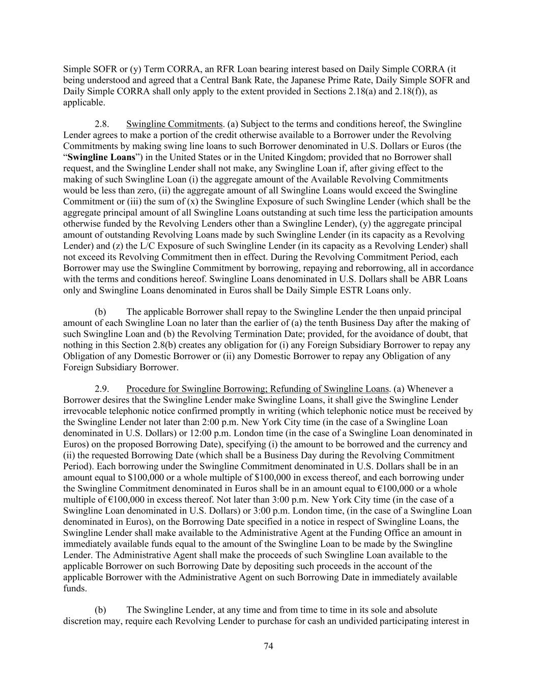 74 Simple SOFR or (y) Term CORRA, an RFR Loan bearing interest based on Daily Simple CORRA (it being understood and agreed that a Central Bank Rate, the Japanese Prime Rate, Daily Simple SOFR and Daily Simple CORRA shall only apply to the extent provided in Sections 2.18(a) and 2.18(f)), as applicable. 2.8. Swingline Commitments. (a) Subject to the terms and conditions hereof, the Swingline Lender agrees to make a portion of the credit otherwise available to a Borrower under the Revolving Commitments by making swing line loans to such Borrower denominated in U.S. Dollars or Euros (the “Swingline Loans”) in the United States or in the United Kingdom; provided that no Borrower shall request, and the Swingline Lender shall not make, any Swingline Loan if, after giving effect to the making of such Swingline Loan (i) the aggregate amount of the Available Revolving Commitments would be less than zero, (ii) the aggregate amount of all Swingline Loans would exceed the Swingline Commitment or (iii) the sum of (x) the Swingline Exposure of such Swingline Lender (which shall be the aggregate principal amount of all Swingline Loans outstanding at such time less the participation amounts otherwise funded by the Revolving Lenders other than a Swingline Lender), (y) the aggregate principal amount of outstanding Revolving Loans made by such Swingline Lender (in its capacity as a Revolving Lender) and (z) the L/C Exposure of such Swingline Lender (in its capacity as a Revolving Lender) shall not exceed its Revolving Commitment then in effect. During the Revolving Commitment Period, each Borrower may use the Swingline Commitment by borrowing, repaying and reborrowing, all in accordance with the terms and conditions hereof. Swingline Loans denominated in U.S. Dollars shall be ABR Loans only and Swingline Loans denominated in Euros shall be Daily Simple ESTR Loans only. (b) The applicable Borrower shall repay to the Swingline Lender the then unpaid principal amount of each Swingline Loan no later than the earlier of (a) the tenth Business Day after the making of such Swingline Loan and (b) the Revolving Termination Date; provided, for the avoidance of doubt, that nothing in this Section 2.8(b) creates any obligation for (i) any Foreign Subsidiary Borrower to repay any Obligation of any Domestic Borrower or (ii) any Domestic Borrower to repay any Obligation of any Foreign Subsidiary Borrower. 2.9. Procedure for Swingline Borrowing; Refunding of Swingline Loans. (a) Whenever a Borrower desires that the Swingline Lender make Swingline Loans, it shall give the Swingline Lender irrevocable telephonic notice confirmed promptly in writing (which telephonic notice must be received by the Swingline Lender not later than 2:00 p.m. New York City time (in the case of a Swingline Loan denominated in U.S. Dollars) or 12:00 p.m. London time (in the case of a Swingline Loan denominated in Euros) on the proposed Borrowing Date), specifying (i) the amount to be borrowed and the currency and (ii) the requested Borrowing Date (which shall be a Business Day during the Revolving Commitment Period). Each borrowing under the Swingline Commitment denominated in U.S. Dollars shall be in an amount equal to $100,000 or a whole multiple of $100,000 in excess thereof, and each borrowing under the Swingline Commitment denominated in Euros shall be in an amount equal to €100,000 or a whole multiple of €100,000 in excess thereof. Not later than 3:00 p.m. New York City time (in the case of a Swingline Loan denominated in U.S. Dollars) or 3:00 p.m. London time, (in the case of a Swingline Loan denominated in Euros), on the Borrowing Date specified in a notice in respect of Swingline Loans, the Swingline Lender shall make available to the Administrative Agent at the Funding Office an amount in immediately available funds equal to the amount of the Swingline Loan to be made by the Swingline Lender. The Administrative Agent shall make the proceeds of such Swingline Loan available to the applicable Borrower on such Borrowing Date by depositing such proceeds in the account of the applicable Borrower with the Administrative Agent on such Borrowing Date in immediately available funds. (b) The Swingline Lender, at any time and from time to time in its sole and absolute discretion may, require each Revolving Lender to purchase for cash an undivided participating interest in