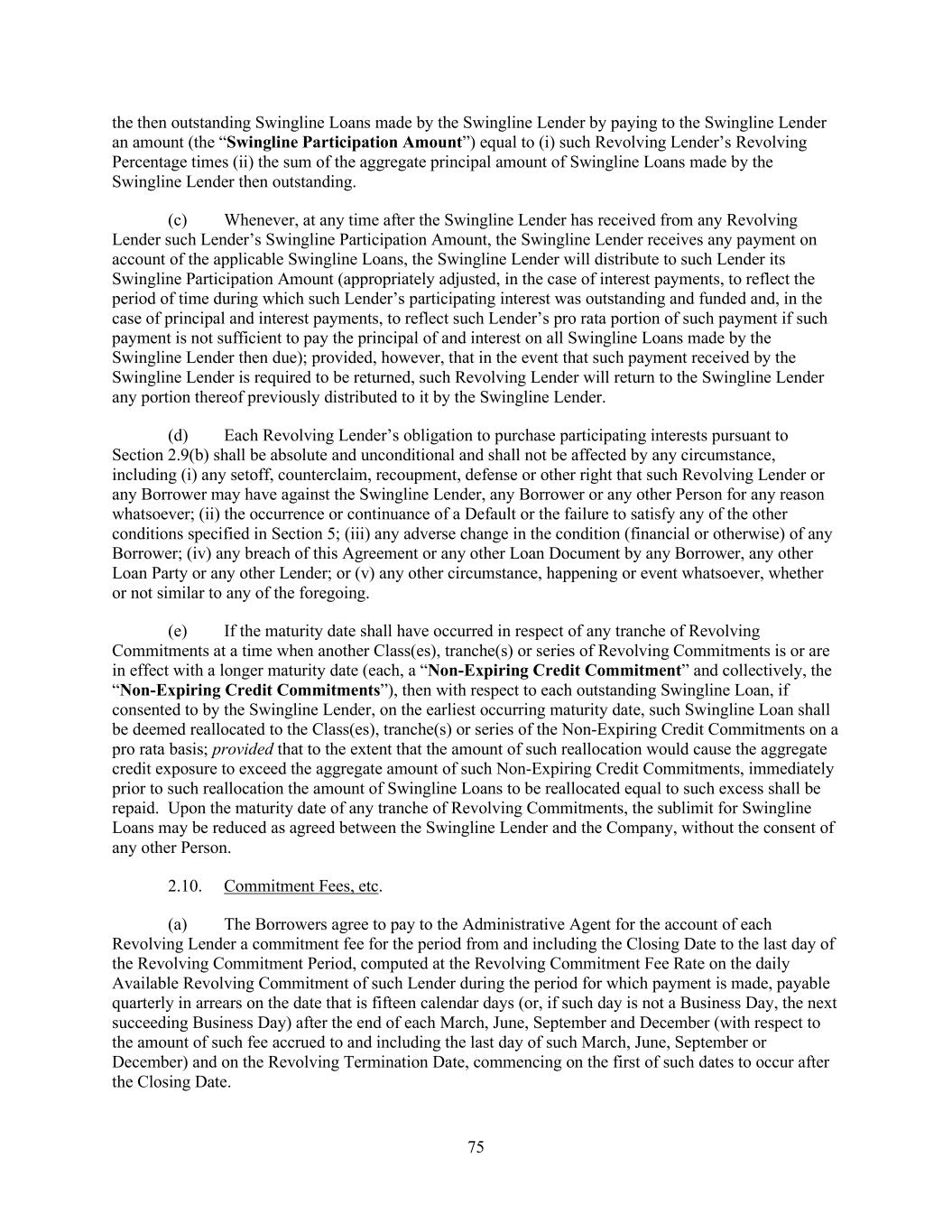 75 the then outstanding Swingline Loans made by the Swingline Lender by paying to the Swingline Lender an amount (the “Swingline Participation Amount”) equal to (i) such Revolving Lender’s Revolving Percentage times (ii) the sum of the aggregate principal amount of Swingline Loans made by the Swingline Lender then outstanding. (c) Whenever, at any time after the Swingline Lender has received from any Revolving Lender such Lender’s Swingline Participation Amount, the Swingline Lender receives any payment on account of the applicable Swingline Loans, the Swingline Lender will distribute to such Lender its Swingline Participation Amount (appropriately adjusted, in the case of interest payments, to reflect the period of time during which such Lender’s participating interest was outstanding and funded and, in the case of principal and interest payments, to reflect such Lender’s pro rata portion of such payment if such payment is not sufficient to pay the principal of and interest on all Swingline Loans made by the Swingline Lender then due); provided, however, that in the event that such payment received by the Swingline Lender is required to be returned, such Revolving Lender will return to the Swingline Lender any portion thereof previously distributed to it by the Swingline Lender. (d) Each Revolving Lender’s obligation to purchase participating interests pursuant to Section 2.9(b) shall be absolute and unconditional and shall not be affected by any circumstance, including (i) any setoff, counterclaim, recoupment, defense or other right that such Revolving Lender or any Borrower may have against the Swingline Lender, any Borrower or any other Person for any reason whatsoever; (ii) the occurrence or continuance of a Default or the failure to satisfy any of the other conditions specified in Section 5; (iii) any adverse change in the condition (financial or otherwise) of any Borrower; (iv) any breach of this Agreement or any other Loan Document by any Borrower, any other Loan Party or any other Lender; or (v) any other circumstance, happening or event whatsoever, whether or not similar to any of the foregoing. (e) If the maturity date shall have occurred in respect of any tranche of Revolving Commitments at a time when another Class(es), tranche(s) or series of Revolving Commitments is or are in effect with a longer maturity date (each, a “Non-Expiring Credit Commitment” and collectively, the “Non-Expiring Credit Commitments”), then with respect to each outstanding Swingline Loan, if consented to by the Swingline Lender, on the earliest occurring maturity date, such Swingline Loan shall be deemed reallocated to the Class(es), tranche(s) or series of the Non-Expiring Credit Commitments on a pro rata basis; provided that to the extent that the amount of such reallocation would cause the aggregate credit exposure to exceed the aggregate amount of such Non-Expiring Credit Commitments, immediately prior to such reallocation the amount of Swingline Loans to be reallocated equal to such excess shall be repaid. Upon the maturity date of any tranche of Revolving Commitments, the sublimit for Swingline Loans may be reduced as agreed between the Swingline Lender and the Company, without the consent of any other Person. 2.10. Commitment Fees, etc. (a) The Borrowers agree to pay to the Administrative Agent for the account of each Revolving Lender a commitment fee for the period from and including the Closing Date to the last day of the Revolving Commitment Period, computed at the Revolving Commitment Fee Rate on the daily Available Revolving Commitment of such Lender during the period for which payment is made, payable quarterly in arrears on the date that is fifteen calendar days (or, if such day is not a Business Day, the next succeeding Business Day) after the end of each March, June, September and December (with respect to the amount of such fee accrued to and including the last day of such March, June, September or December) and on the Revolving Termination Date, commencing on the first of such dates to occur after the Closing Date.