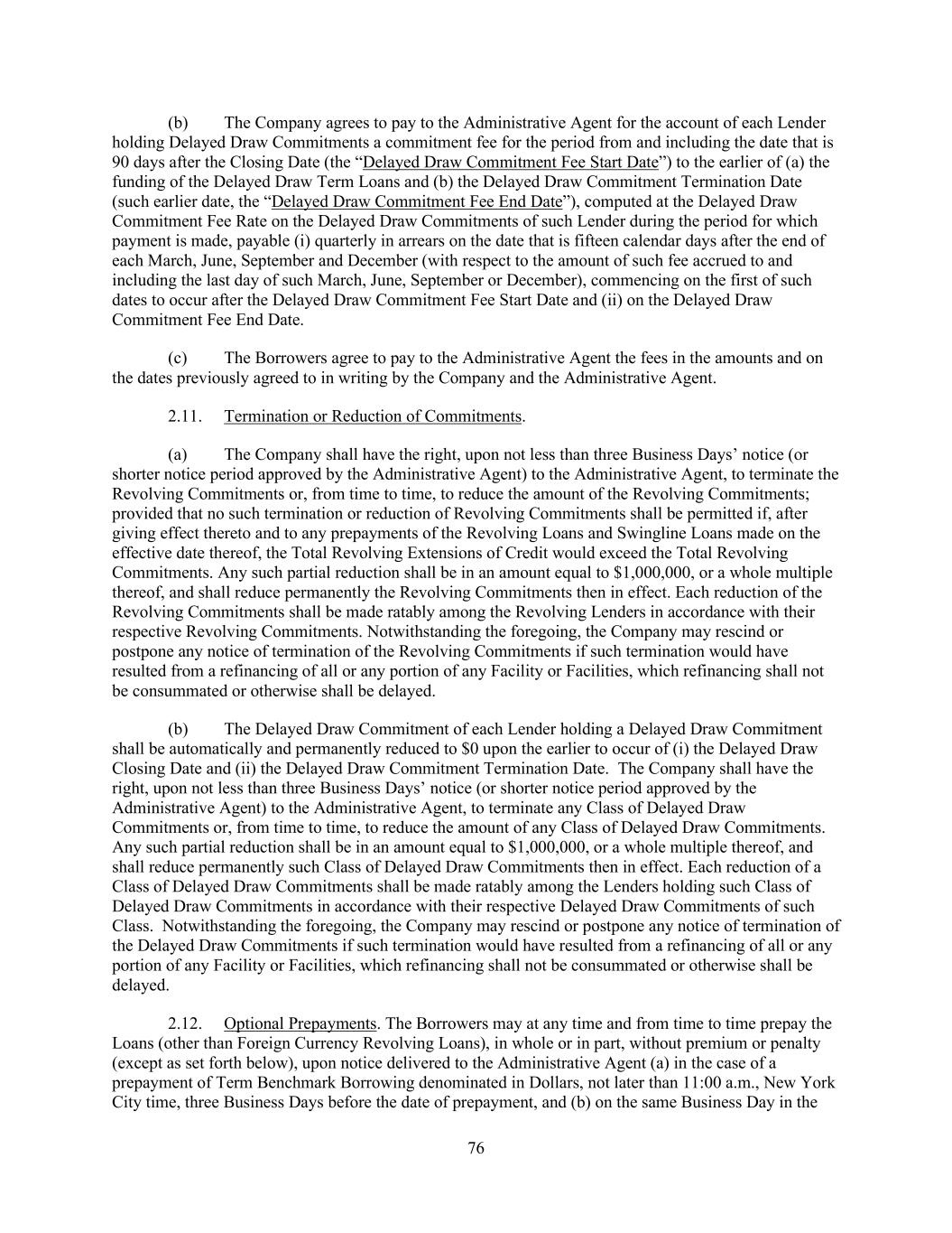 76 (b) The Company agrees to pay to the Administrative Agent for the account of each Lender holding Delayed Draw Commitments a commitment fee for the period from and including the date that is 90 days after the Closing Date (the “Delayed Draw Commitment Fee Start Date”) to the earlier of (a) the funding of the Delayed Draw Term Loans and (b) the Delayed Draw Commitment Termination Date (such earlier date, the “Delayed Draw Commitment Fee End Date”), computed at the Delayed Draw Commitment Fee Rate on the Delayed Draw Commitments of such Lender during the period for which payment is made, payable (i) quarterly in arrears on the date that is fifteen calendar days after the end of each March, June, September and December (with respect to the amount of such fee accrued to and including the last day of such March, June, September or December), commencing on the first of such dates to occur after the Delayed Draw Commitment Fee Start Date and (ii) on the Delayed Draw Commitment Fee End Date. (c) The Borrowers agree to pay to the Administrative Agent the fees in the amounts and on the dates previously agreed to in writing by the Company and the Administrative Agent. 2.11. Termination or Reduction of Commitments. (a) The Company shall have the right, upon not less than three Business Days’ notice (or shorter notice period approved by the Administrative Agent) to the Administrative Agent, to terminate the Revolving Commitments or, from time to time, to reduce the amount of the Revolving Commitments; provided that no such termination or reduction of Revolving Commitments shall be permitted if, after giving effect thereto and to any prepayments of the Revolving Loans and Swingline Loans made on the effective date thereof, the Total Revolving Extensions of Credit would exceed the Total Revolving Commitments. Any such partial reduction shall be in an amount equal to $1,000,000, or a whole multiple thereof, and shall reduce permanently the Revolving Commitments then in effect. Each reduction of the Revolving Commitments shall be made ratably among the Revolving Lenders in accordance with their respective Revolving Commitments. Notwithstanding the foregoing, the Company may rescind or postpone any notice of termination of the Revolving Commitments if such termination would have resulted from a refinancing of all or any portion of any Facility or Facilities, which refinancing shall not be consummated or otherwise shall be delayed. (b) The Delayed Draw Commitment of each Lender holding a Delayed Draw Commitment shall be automatically and permanently reduced to $0 upon the earlier to occur of (i) the Delayed Draw Closing Date and (ii) the Delayed Draw Commitment Termination Date. The Company shall have the right, upon not less than three Business Days’ notice (or shorter notice period approved by the Administrative Agent) to the Administrative Agent, to terminate any Class of Delayed Draw Commitments or, from time to time, to reduce the amount of any Class of Delayed Draw Commitments. Any such partial reduction shall be in an amount equal to $1,000,000, or a whole multiple thereof, and shall reduce permanently such Class of Delayed Draw Commitments then in effect. Each reduction of a Class of Delayed Draw Commitments shall be made ratably among the Lenders holding such Class of Delayed Draw Commitments in accordance with their respective Delayed Draw Commitments of such Class. Notwithstanding the foregoing, the Company may rescind or postpone any notice of termination of the Delayed Draw Commitments if such termination would have resulted from a refinancing of all or any portion of any Facility or Facilities, which refinancing shall not be consummated or otherwise shall be delayed. 2.12. Optional Prepayments. The Borrowers may at any time and from time to time prepay the Loans (other than Foreign Currency Revolving Loans), in whole or in part, without premium or penalty (except as set forth below), upon notice delivered to the Administrative Agent (a) in the case of a prepayment of Term Benchmark Borrowing denominated in Dollars, not later than 11:00 a.m., New York City time, three Business Days before the date of prepayment, and (b) on the same Business Day in the