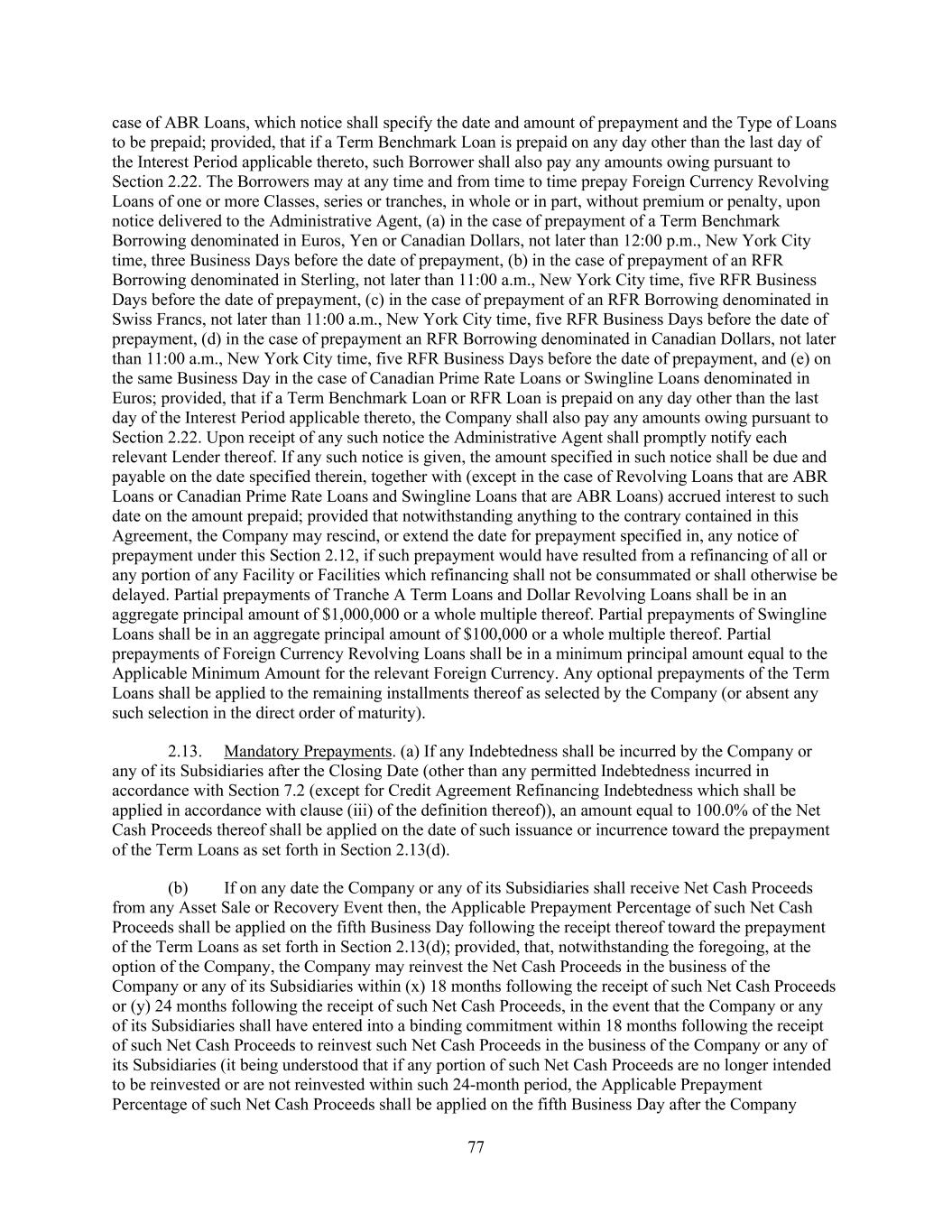 77 case of ABR Loans, which notice shall specify the date and amount of prepayment and the Type of Loans to be prepaid; provided, that if a Term Benchmark Loan is prepaid on any day other than the last day of the Interest Period applicable thereto, such Borrower shall also pay any amounts owing pursuant to Section 2.22. The Borrowers may at any time and from time to time prepay Foreign Currency Revolving Loans of one or more Classes, series or tranches, in whole or in part, without premium or penalty, upon notice delivered to the Administrative Agent, (a) in the case of prepayment of a Term Benchmark Borrowing denominated in Euros, Yen or Canadian Dollars, not later than 12:00 p.m., New York City time, three Business Days before the date of prepayment, (b) in the case of prepayment of an RFR Borrowing denominated in Sterling, not later than 11:00 a.m., New York City time, five RFR Business Days before the date of prepayment, (c) in the case of prepayment of an RFR Borrowing denominated in Swiss Francs, not later than 11:00 a.m., New York City time, five RFR Business Days before the date of prepayment, (d) in the case of prepayment an RFR Borrowing denominated in Canadian Dollars, not later than 11:00 a.m., New York City time, five RFR Business Days before the date of prepayment, and (e) on the same Business Day in the case of Canadian Prime Rate Loans or Swingline Loans denominated in Euros; provided, that if a Term Benchmark Loan or RFR Loan is prepaid on any day other than the last day of the Interest Period applicable thereto, the Company shall also pay any amounts owing pursuant to Section 2.22. Upon receipt of any such notice the Administrative Agent shall promptly notify each relevant Lender thereof. If any such notice is given, the amount specified in such notice shall be due and payable on the date specified therein, together with (except in the case of Revolving Loans that are ABR Loans or Canadian Prime Rate Loans and Swingline Loans that are ABR Loans) accrued interest to such date on the amount prepaid; provided that notwithstanding anything to the contrary contained in this Agreement, the Company may rescind, or extend the date for prepayment specified in, any notice of prepayment under this Section 2.12, if such prepayment would have resulted from a refinancing of all or any portion of any Facility or Facilities which refinancing shall not be consummated or shall otherwise be delayed. Partial prepayments of Tranche A Term Loans and Dollar Revolving Loans shall be in an aggregate principal amount of $1,000,000 or a whole multiple thereof. Partial prepayments of Swingline Loans shall be in an aggregate principal amount of $100,000 or a whole multiple thereof. Partial prepayments of Foreign Currency Revolving Loans shall be in a minimum principal amount equal to the Applicable Minimum Amount for the relevant Foreign Currency. Any optional prepayments of the Term Loans shall be applied to the remaining installments thereof as selected by the Company (or absent any such selection in the direct order of maturity). 2.13. Mandatory Prepayments. (a) If any Indebtedness shall be incurred by the Company or any of its Subsidiaries after the Closing Date (other than any permitted Indebtedness incurred in accordance with Section 7.2 (except for Credit Agreement Refinancing Indebtedness which shall be applied in accordance with clause (iii) of the definition thereof)), an amount equal to 100.0% of the Net Cash Proceeds thereof shall be applied on the date of such issuance or incurrence toward the prepayment of the Term Loans as set forth in Section 2.13(d). (b) If on any date the Company or any of its Subsidiaries shall receive Net Cash Proceeds from any Asset Sale or Recovery Event then, the Applicable Prepayment Percentage of such Net Cash Proceeds shall be applied on the fifth Business Day following the receipt thereof toward the prepayment of the Term Loans as set forth in Section 2.13(d); provided, that, notwithstanding the foregoing, at the option of the Company, the Company may reinvest the Net Cash Proceeds in the business of the Company or any of its Subsidiaries within (x) 18 months following the receipt of such Net Cash Proceeds or (y) 24 months following the receipt of such Net Cash Proceeds, in the event that the Company or any of its Subsidiaries shall have entered into a binding commitment within 18 months following the receipt of such Net Cash Proceeds to reinvest such Net Cash Proceeds in the business of the Company or any of its Subsidiaries (it being understood that if any portion of such Net Cash Proceeds are no longer intended to be reinvested or are not reinvested within such 24-month period, the Applicable Prepayment Percentage of such Net Cash Proceeds shall be applied on the fifth Business Day after the Company