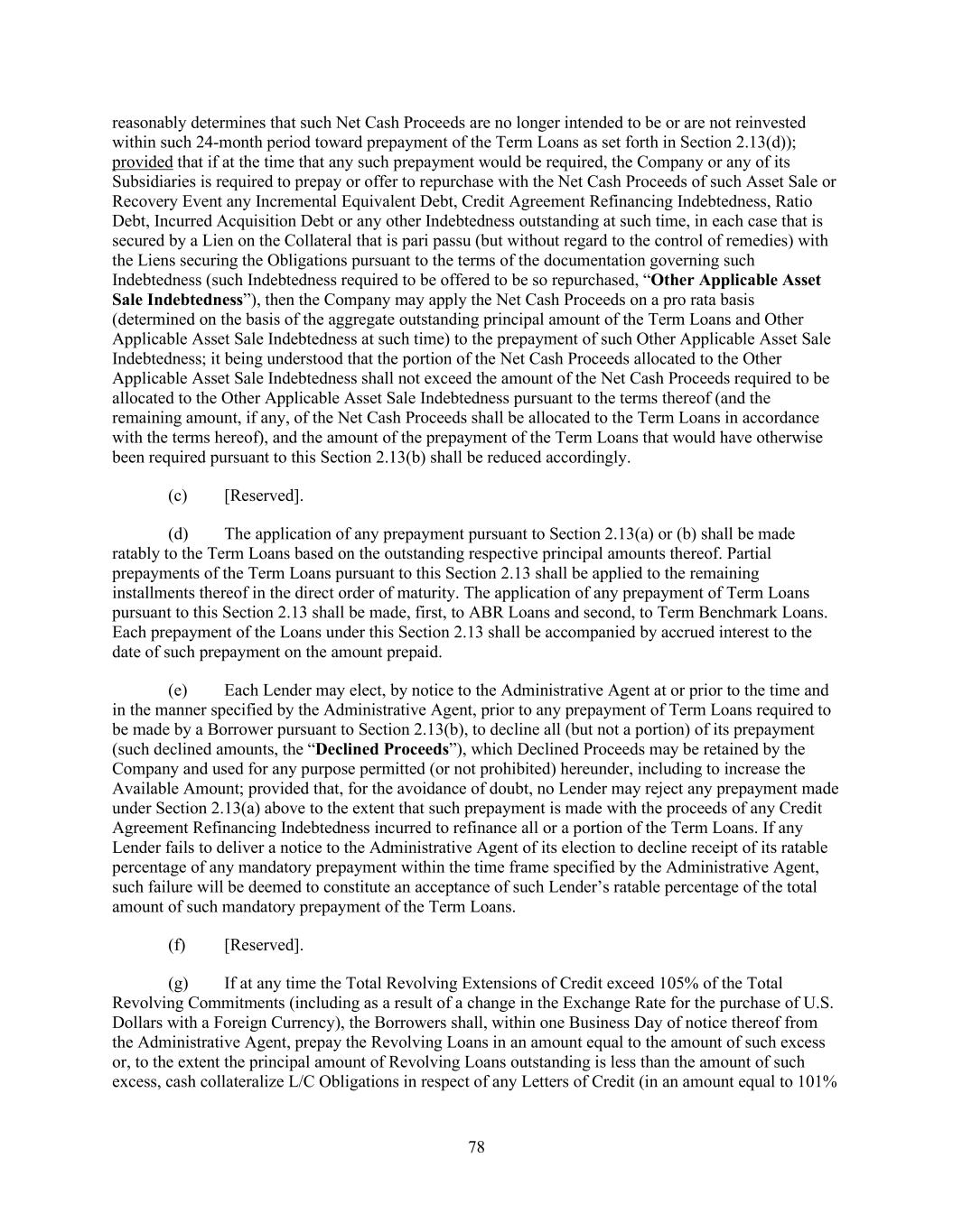 78 reasonably determines that such Net Cash Proceeds are no longer intended to be or are not reinvested within such 24-month period toward prepayment of the Term Loans as set forth in Section 2.13(d)); provided that if at the time that any such prepayment would be required, the Company or any of its Subsidiaries is required to prepay or offer to repurchase with the Net Cash Proceeds of such Asset Sale or Recovery Event any Incremental Equivalent Debt, Credit Agreement Refinancing Indebtedness, Ratio Debt, Incurred Acquisition Debt or any other Indebtedness outstanding at such time, in each case that is secured by a Lien on the Collateral that is pari passu (but without regard to the control of remedies) with the Liens securing the Obligations pursuant to the terms of the documentation governing such Indebtedness (such Indebtedness required to be offered to be so repurchased, “Other Applicable Asset Sale Indebtedness”), then the Company may apply the Net Cash Proceeds on a pro rata basis (determined on the basis of the aggregate outstanding principal amount of the Term Loans and Other Applicable Asset Sale Indebtedness at such time) to the prepayment of such Other Applicable Asset Sale Indebtedness; it being understood that the portion of the Net Cash Proceeds allocated to the Other Applicable Asset Sale Indebtedness shall not exceed the amount of the Net Cash Proceeds required to be allocated to the Other Applicable Asset Sale Indebtedness pursuant to the terms thereof (and the remaining amount, if any, of the Net Cash Proceeds shall be allocated to the Term Loans in accordance with the terms hereof), and the amount of the prepayment of the Term Loans that would have otherwise been required pursuant to this Section 2.13(b) shall be reduced accordingly. (c) [Reserved]. (d) The application of any prepayment pursuant to Section 2.13(a) or (b) shall be made ratably to the Term Loans based on the outstanding respective principal amounts thereof. Partial prepayments of the Term Loans pursuant to this Section 2.13 shall be applied to the remaining installments thereof in the direct order of maturity. The application of any prepayment of Term Loans pursuant to this Section 2.13 shall be made, first, to ABR Loans and second, to Term Benchmark Loans. Each prepayment of the Loans under this Section 2.13 shall be accompanied by accrued interest to the date of such prepayment on the amount prepaid. (e) Each Lender may elect, by notice to the Administrative Agent at or prior to the time and in the manner specified by the Administrative Agent, prior to any prepayment of Term Loans required to be made by a Borrower pursuant to Section 2.13(b), to decline all (but not a portion) of its prepayment (such declined amounts, the “Declined Proceeds”), which Declined Proceeds may be retained by the Company and used for any purpose permitted (or not prohibited) hereunder, including to increase the Available Amount; provided that, for the avoidance of doubt, no Lender may reject any prepayment made under Section 2.13(a) above to the extent that such prepayment is made with the proceeds of any Credit Agreement Refinancing Indebtedness incurred to refinance all or a portion of the Term Loans. If any Lender fails to deliver a notice to the Administrative Agent of its election to decline receipt of its ratable percentage of any mandatory prepayment within the time frame specified by the Administrative Agent, such failure will be deemed to constitute an acceptance of such Lender’s ratable percentage of the total amount of such mandatory prepayment of the Term Loans. (f) [Reserved]. (g) If at any time the Total Revolving Extensions of Credit exceed 105% of the Total Revolving Commitments (including as a result of a change in the Exchange Rate for the purchase of U.S. Dollars with a Foreign Currency), the Borrowers shall, within one Business Day of notice thereof from the Administrative Agent, prepay the Revolving Loans in an amount equal to the amount of such excess or, to the extent the principal amount of Revolving Loans outstanding is less than the amount of such excess, cash collateralize L/C Obligations in respect of any Letters of Credit (in an amount equal to 101%